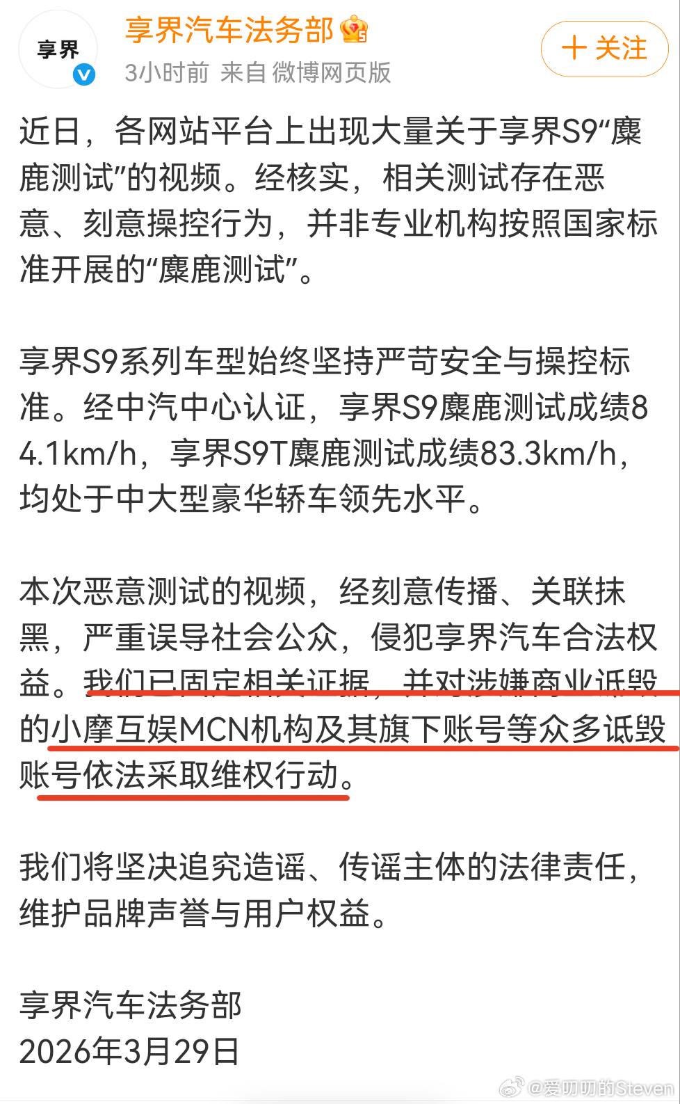 享界汽车法务部声明这个事情能被无脑传播成这样,本身就很诡异,本质上还是享界S9/S9T对BBA产生了影响,而有人想在这个事上推波助澜。之前“飞坡”,现在的“S弯”。犯罪不是零成本的,希望能把幕后黑手抓出来。