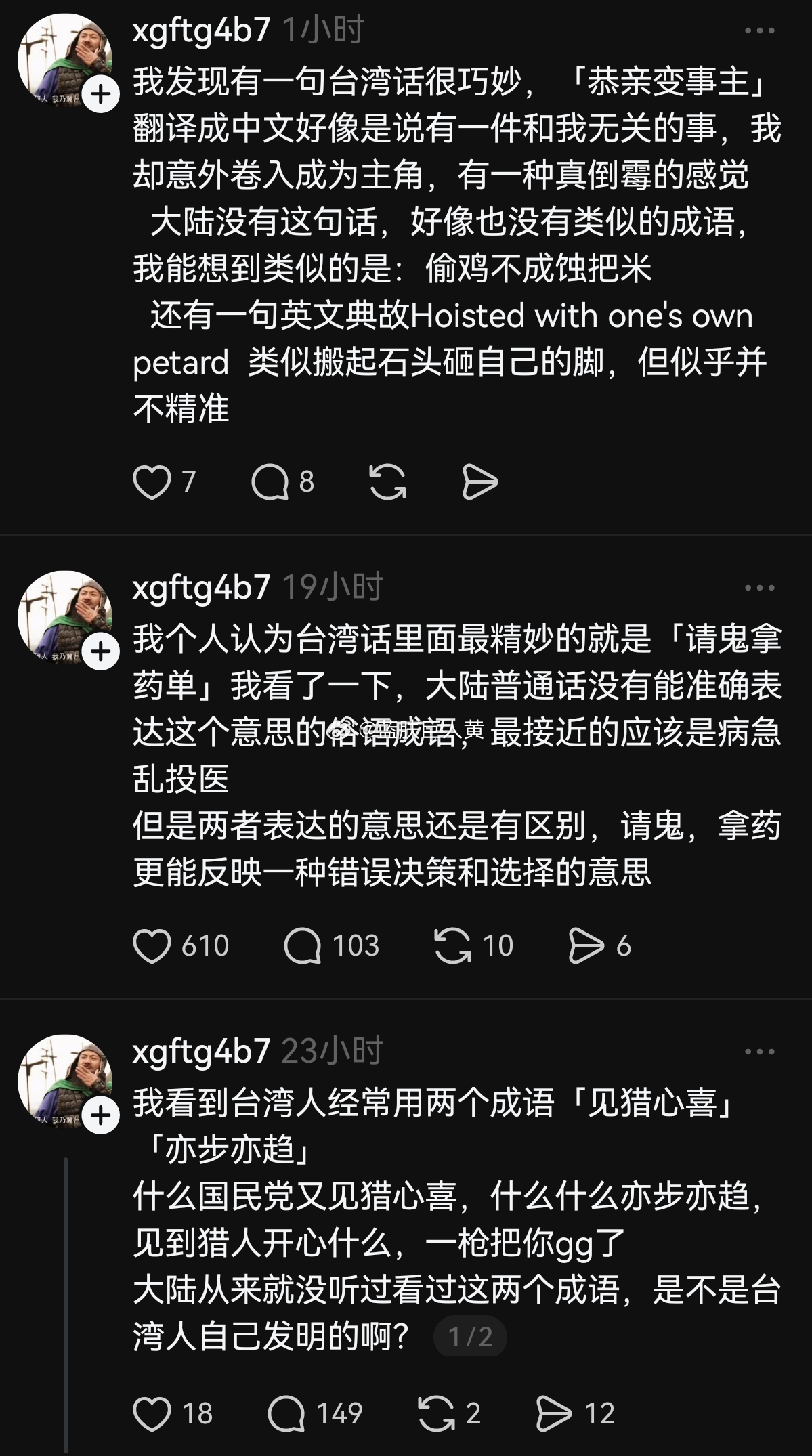 简中账号在脆上夸台湾人“用词精妙”,还说“大陆都没有这些成语”,然后他换来了10
