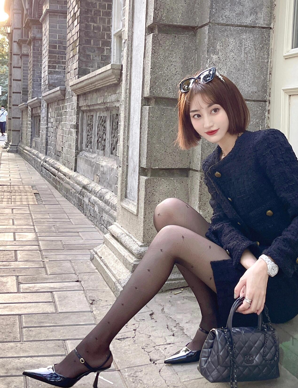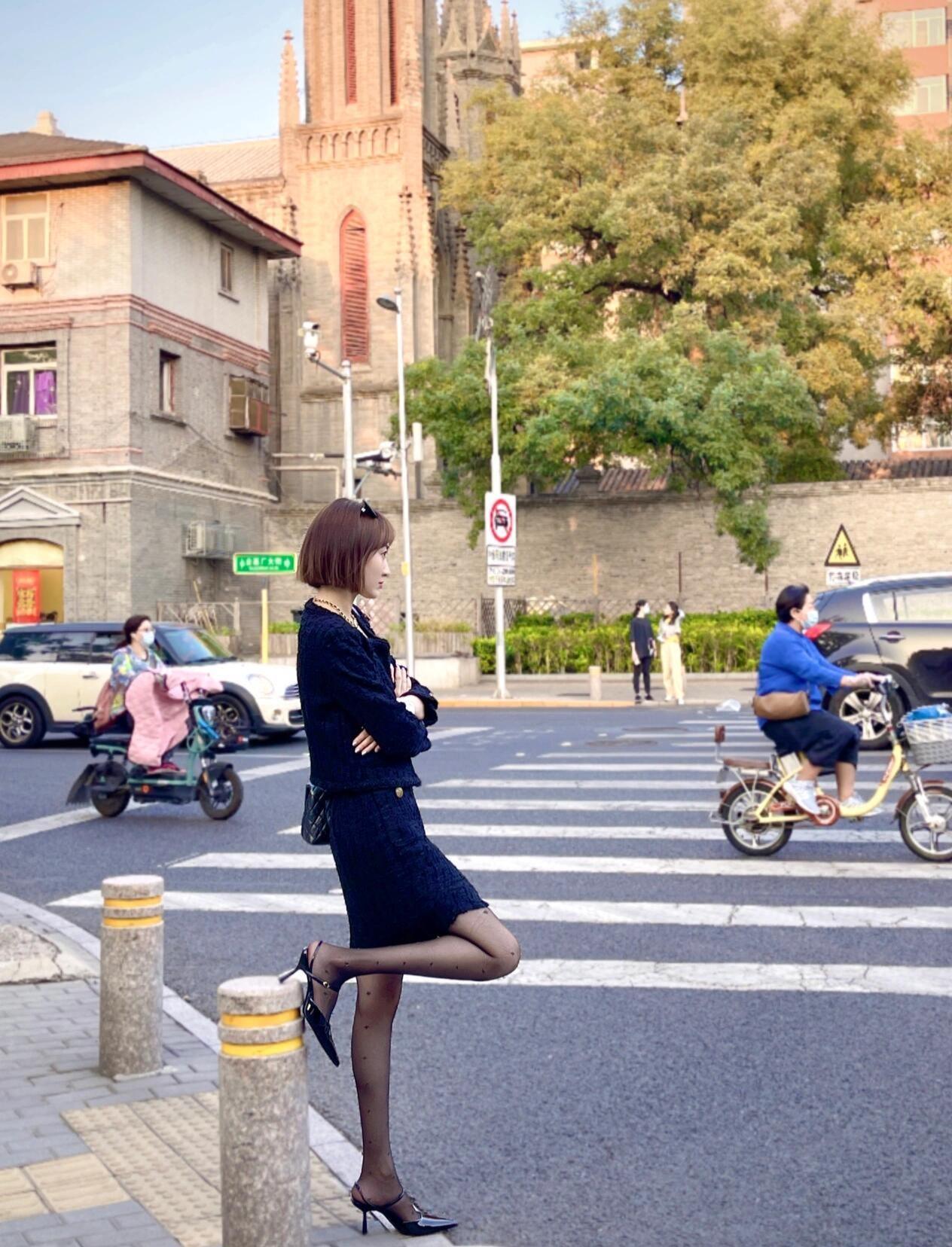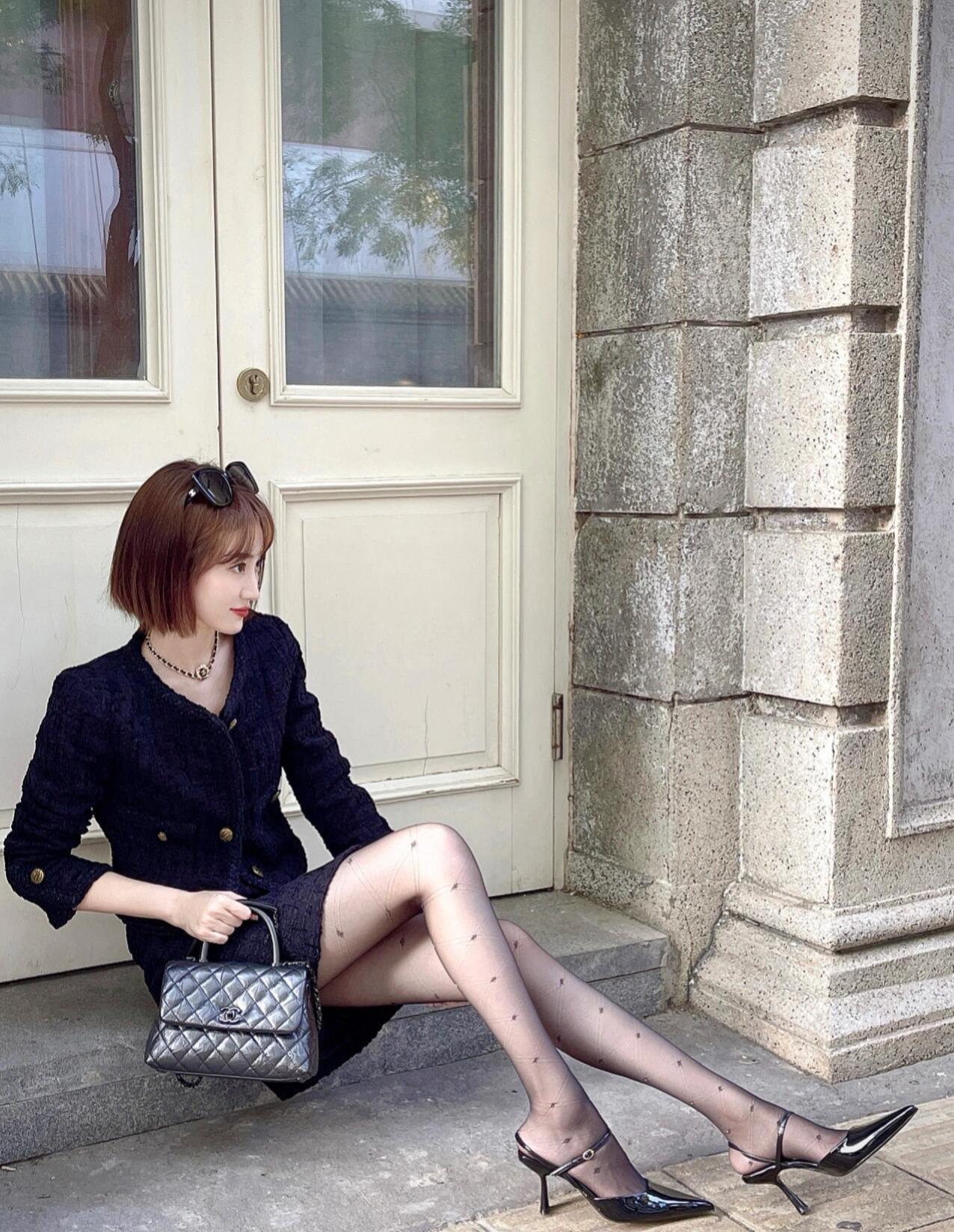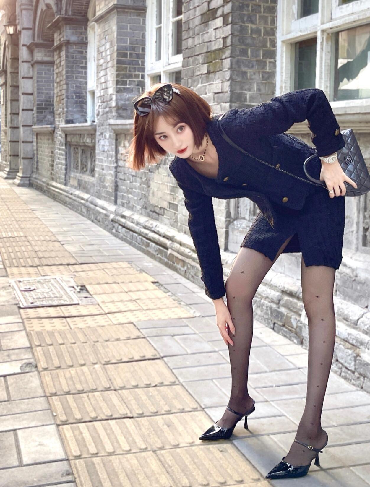 这套是复古甜酷小香风,核心是黑蓝色粗花呢套装:经典小香纹理自带复古贵气,开叉短裙增加轻熟细节,尖头单鞋强化甜酷氛围,优雅又有随性格调。贵感小香风套装