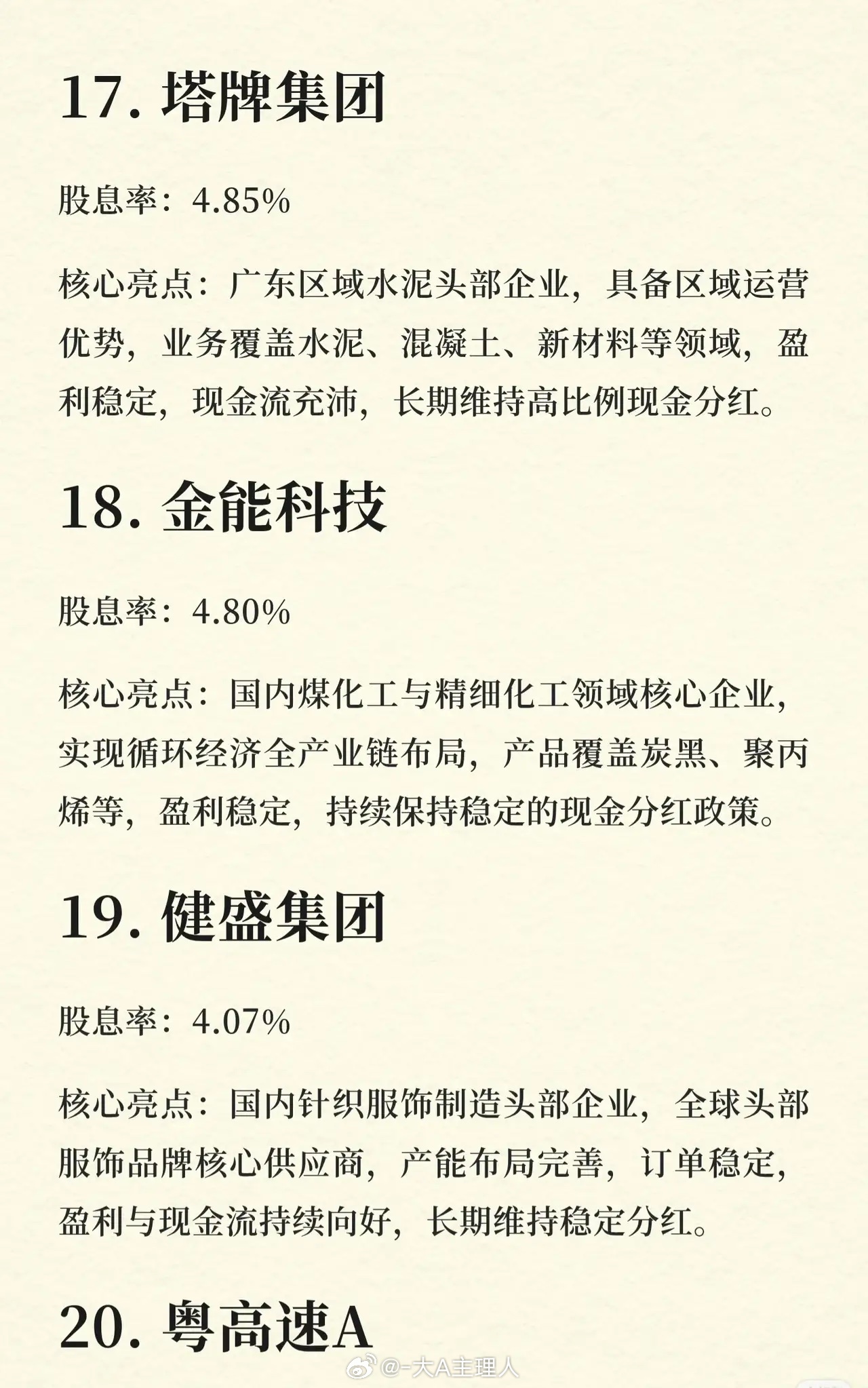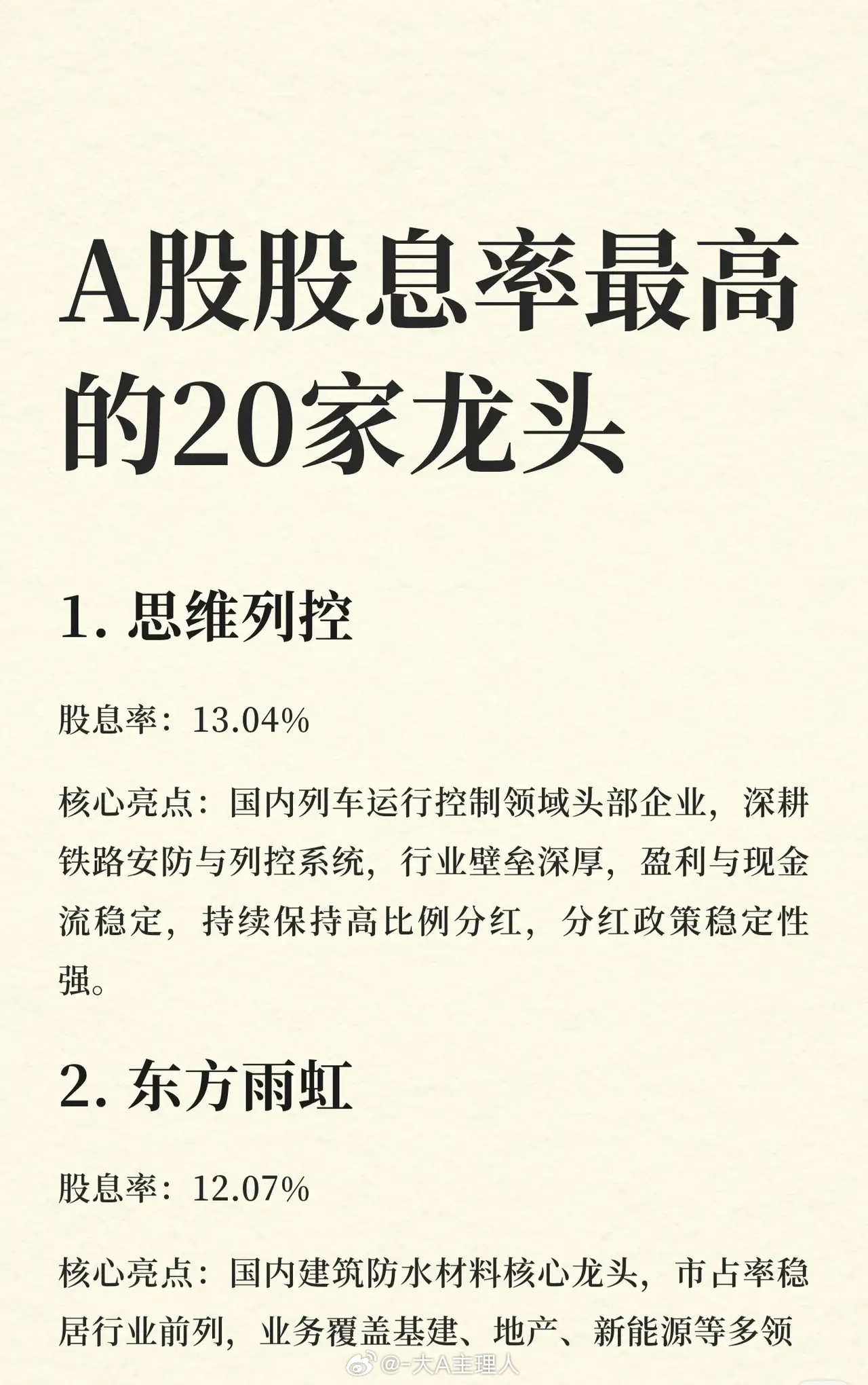 一份关于A股股息率最高的20家龙头企业的名单。核心要点:* 排名依据:按股息率从