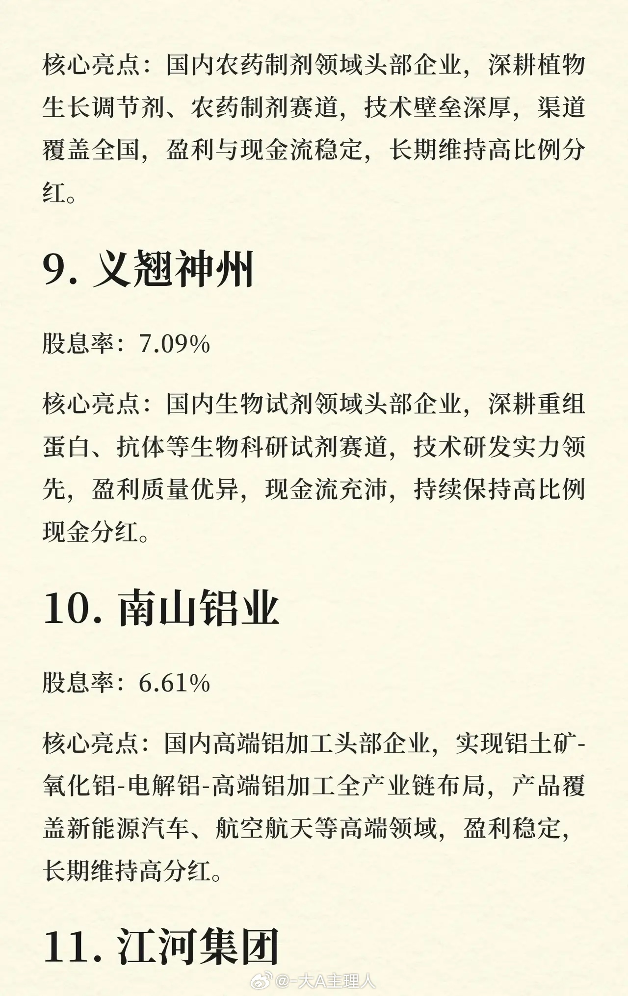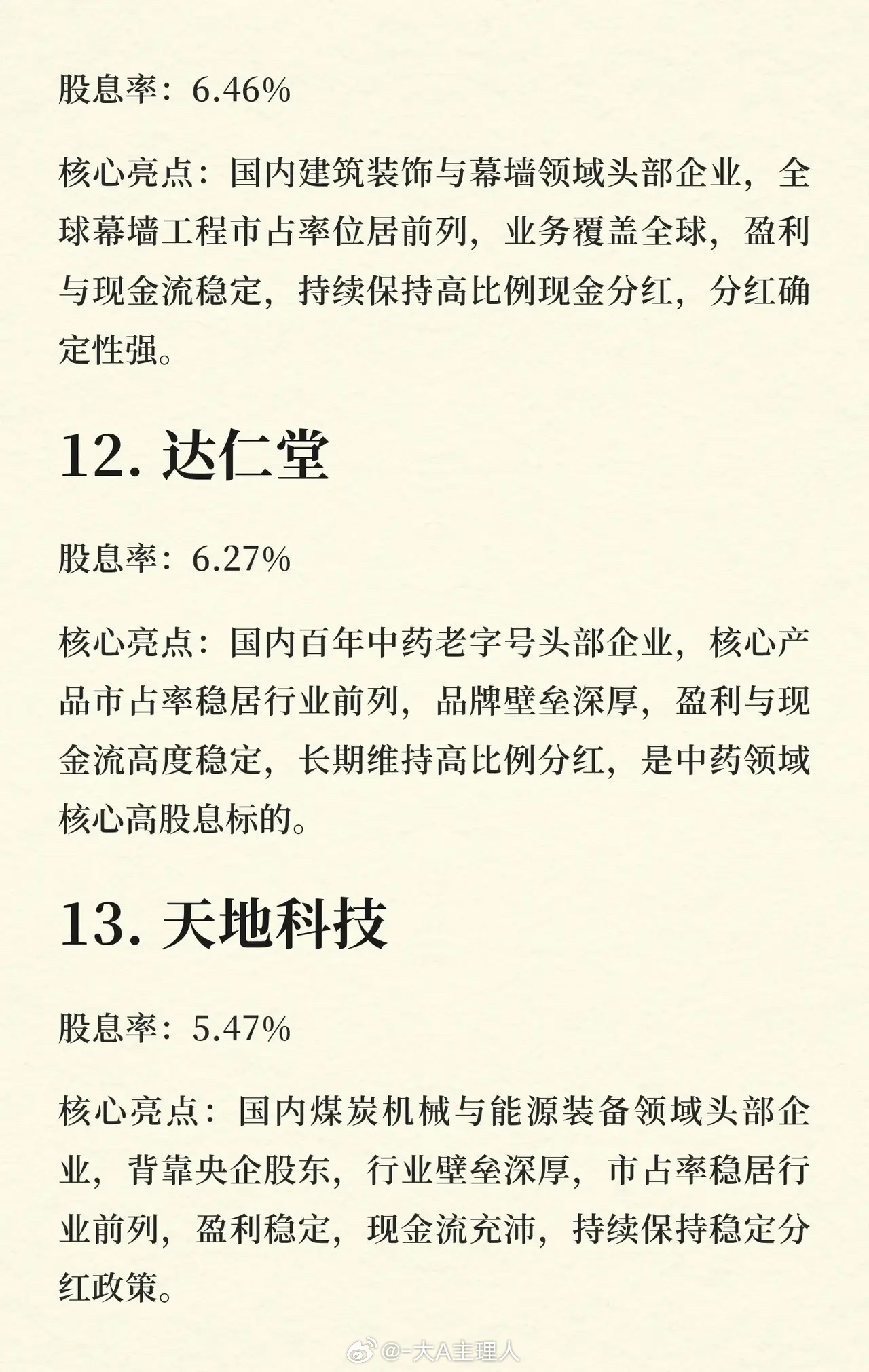* 排名依据:按股息率从高到低排列。* 榜单特点:上榜企业均为各细分领域的头部公司,普遍具有行业壁垒高、盈利与现金流稳定的特点,并长期维持高比例现金分红。