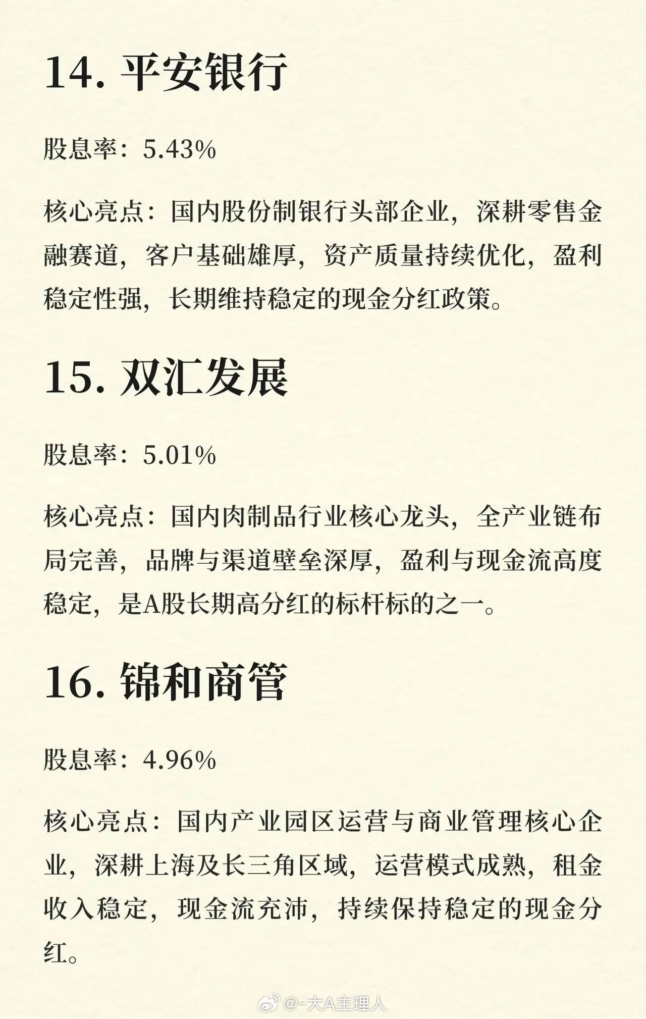其余上榜企业还包括兴业银行、国光股份、达仁堂、平安银行、双汇发展、粤高速A等,涵盖了金融、医药、制造、消费、公用事业等多个行业,股息率从约7%到4%不等。