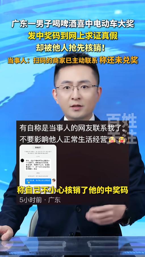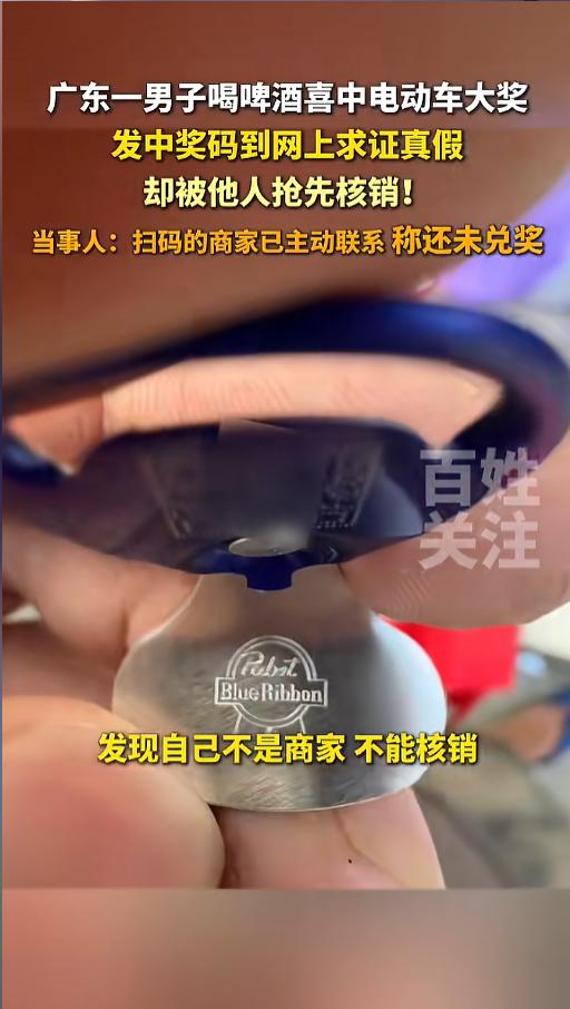 “煮熟的鸭子飞了?”3月23日,广东肇庆,一男子在喝啤酒时中了个大奖,拉环里面有个一个二维码,下面还写着“电动车壹台”,男子尝试扫码却发现不能核销,于是就发到了网上询问真假。没想到忘记了遮挡二维码,竟被人提前核销了! 中奖是一件大喜事,可一定得保存好自己的中奖凭证,尤其是一些不需要原件就能兑奖的。要不然,自己的好运,可能就给别人做了嫁衣。 据媒体报道,该男子在喝酒的时候,发现啤酒罐拉环里面有个二维码,下面还有几个字,写着电动车壹台。男子惊喜万分,以为自己中奖了,便掏出手机扫了码。 可是扫码的结果却让他犯了难,结果显示他不是商家,不能核销。男子心存疑惑,不知道真假。便拍了照片发到了网上,向网友求证真假。他有些大意,并没有对二维码遮挡。 不久后,他得到了个好消息,中奖是真的,但同时又得到了个坏消息,有人把这个码给核销了。一时间,不少网友称男子乐极生悲。可让他没想到的是,事情竟然又出现了转机。 几天后,一位自称是商家的联系上了他,对方坦言,他看到后扫码试了试,不小心给核销了,但是自己并没有领奖,随时都可以把这个码还给男子。啤酒厂的工作人员也给他回复,称正在核实消息。 网友看后表示,好一个连续剧,中个奖还这么一波三折的,虽然最后结果是好的,但这个过程却让人哭笑不得。这也给大家提了个醒,一定要注意保护个人隐私,不然可能真的就要乐极生悲了! 信息来源:《广东一男子喝啤酒喜中电动车大奖,发中奖码到网上求证真假 却被他人抢先核销!》百姓关注
