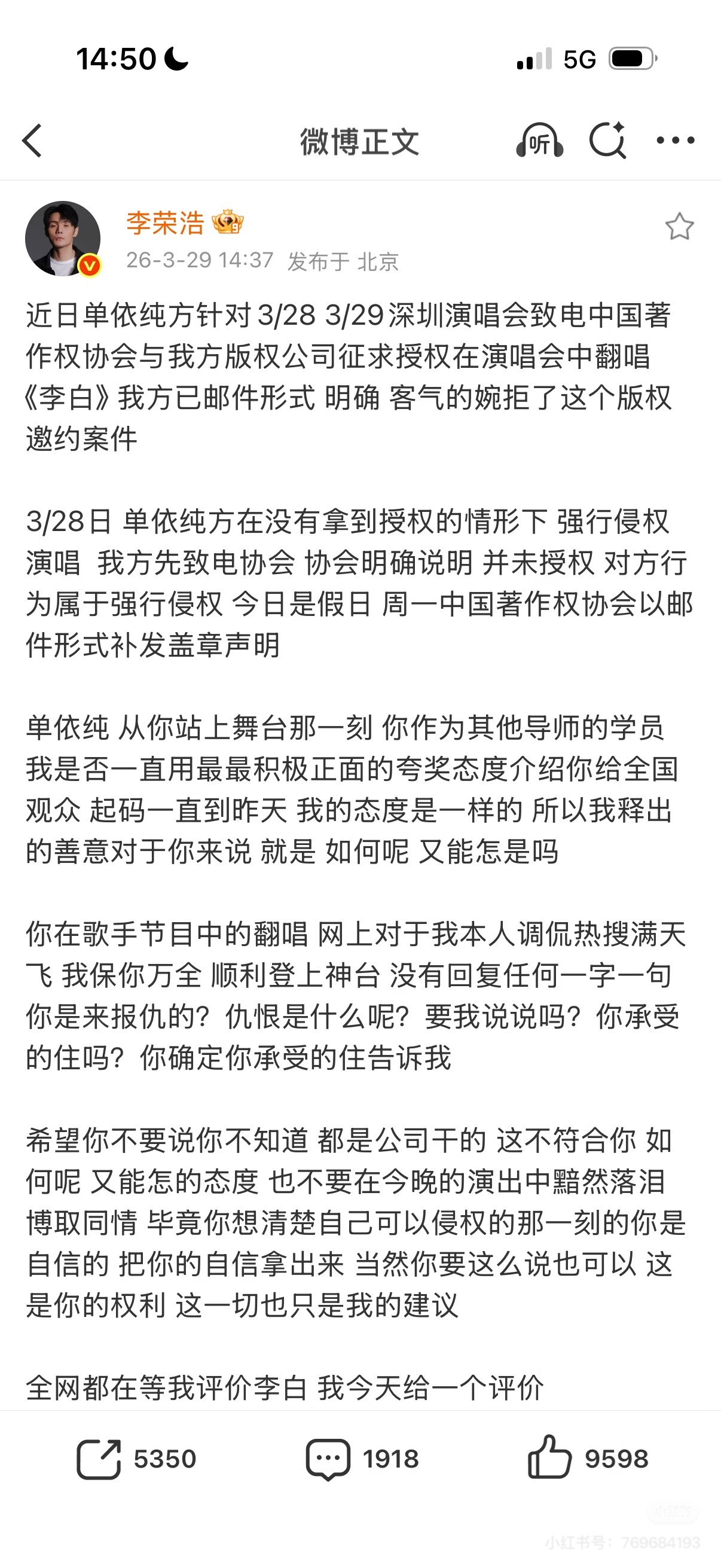 李荣浩 单依纯强行侵权所以就是单依纯没有版权还唱了,这有点太离谱了,李荣浩再怎么说也是歌坛大前辈了这么不尊重吗,明知道自己是公众人物更应该注意啊