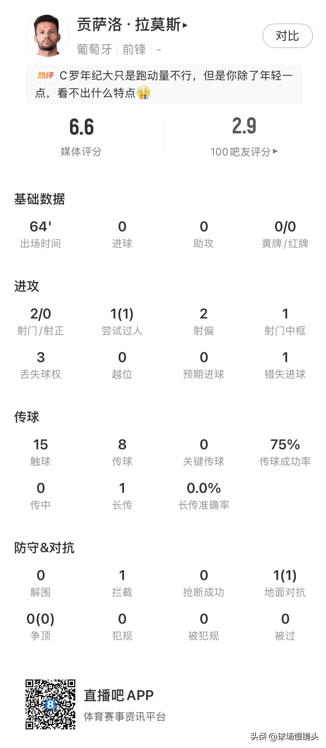 “没有C罗葡萄牙会更强”? 葡萄牙0:0墨西哥,C罗不在,首发前锋拉莫斯的表现真的是一言难尽! 灵魂拷问——贡萨洛拉莫斯除了比C罗年轻点,还有其它优势吗? 大赛经验,门前意识,射术,以及场上威胁可以说C罗碾压拉莫斯,C罗踢45分钟比赛绝对碾压拉莫斯! 大家觉得呢? C罗