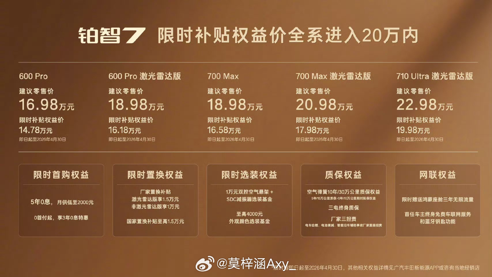 铂智7上市限时补贴权益价14.78万起广汽丰田铂智7正式上市,起售价14.78万起+限时补贴后全系20万内。全系车型首次进入20万元内价格区间,中大型纯电旗舰,搭载鸿蒙座舱、激光雷达智驾与双腔空悬,华为电驱加持,续航600-700km,丰田品质+智能科技,性价比拉满!汽场全开大v聊车