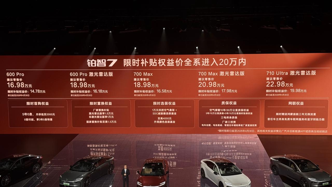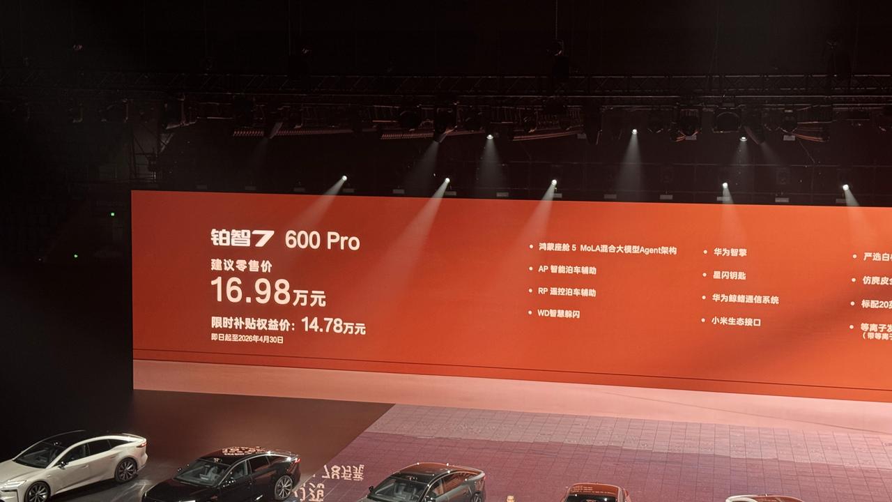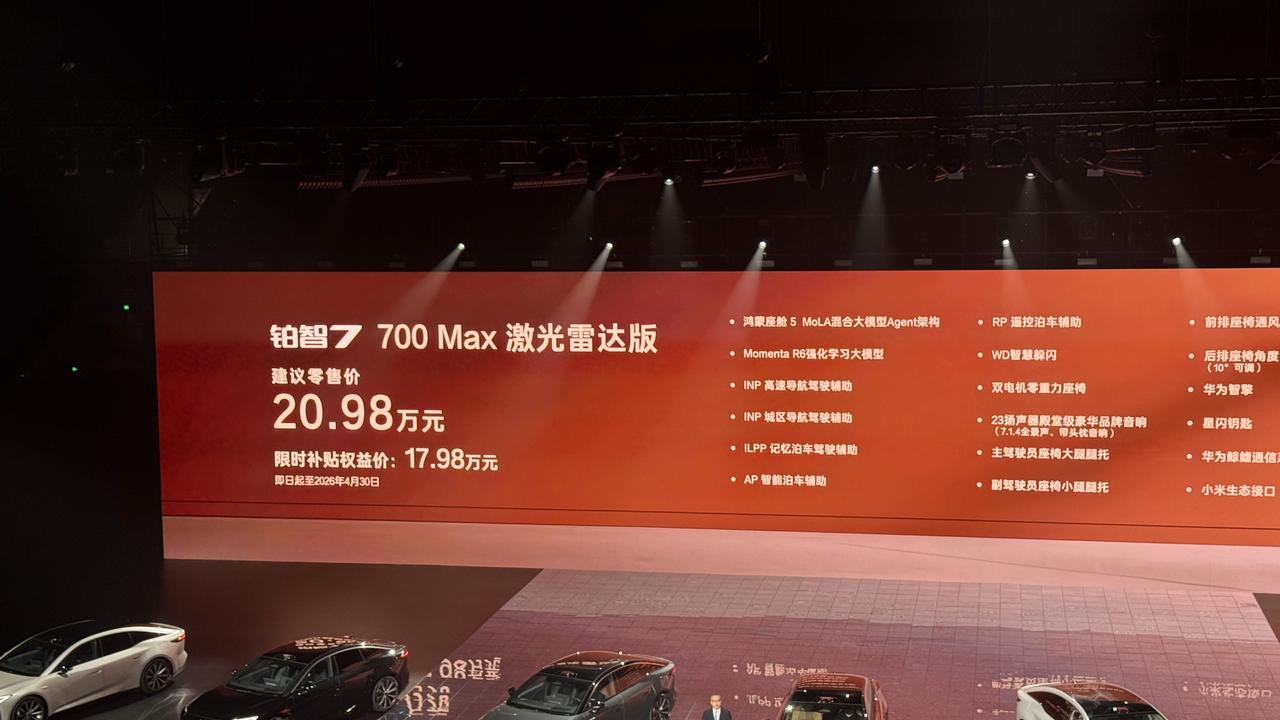 如预期所料,铂智7正式上市给出好价格! 基本比原来预售少了1万 我选了700 MAX激光雷达版,标价20.98万 选双腔空悬+薅完国补是18.5万 加之去年广州车展提前落订 次顶配估计19万多点点就能落地 我想要的配置基本齐全(除了轮毂)【来自懂车帝车友圈】