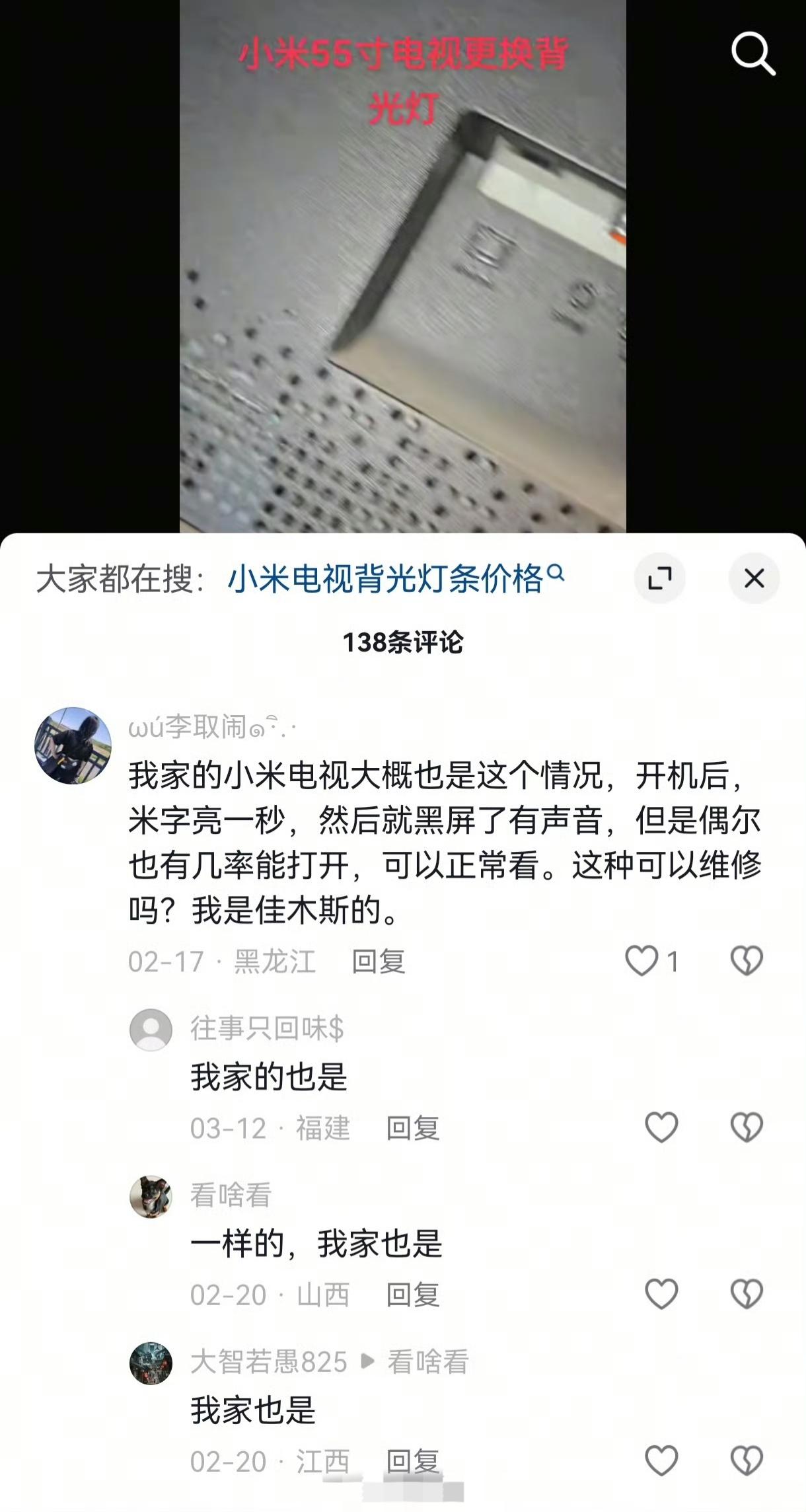 家里小米电视坏了,屏幕不亮,但是有声音。网上一查,是背光灯坏了,出现这种问题的小米电视海了去了,网友们都在自己动手维修,但是我不会… 网上都说基本是出保之后坏的,我家了这个久点,五年了吧,后来因为和某王因为国内请黑人做广告的事吵嘴,就没买过这个品牌了。 为什么我家的用的久点?可能因为基本没怎么用过电视,坚持的时间长了点…雷布斯这个问题要重视啊。 我现在在想,是修还是换…[尬笑]电视无反应 小米大屏电视 电视屏不亮
