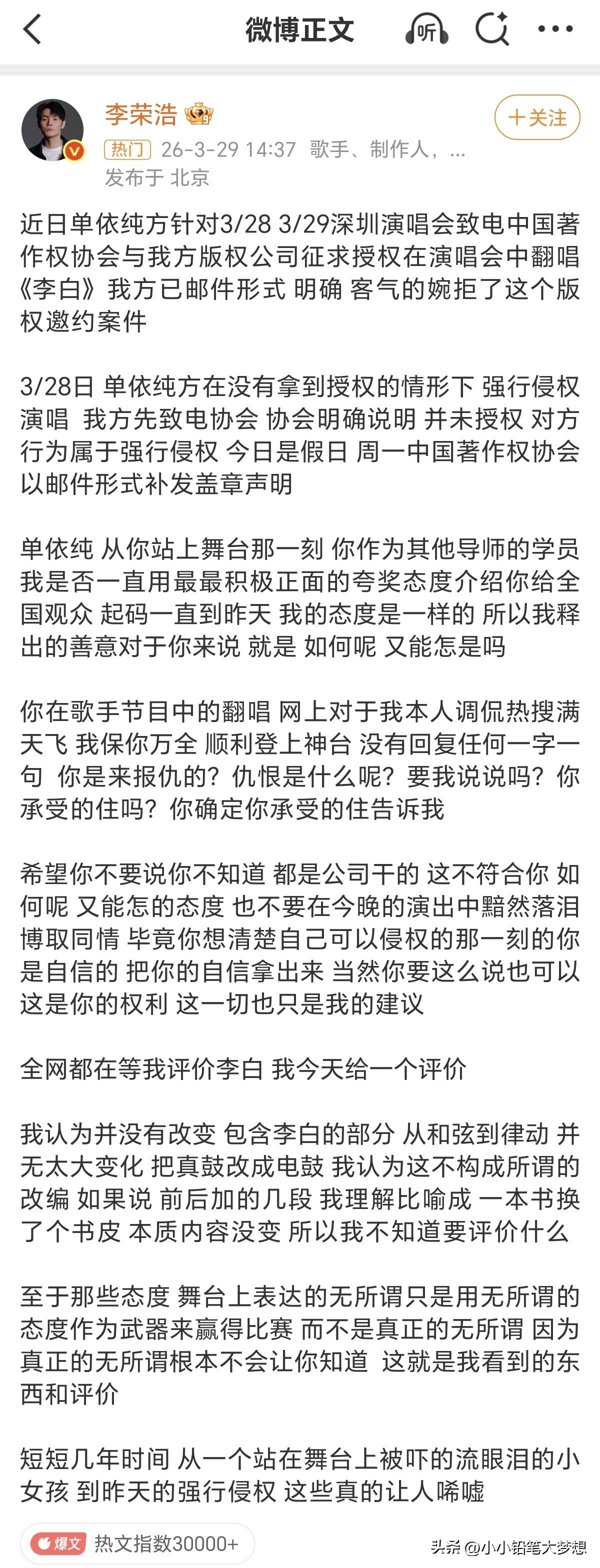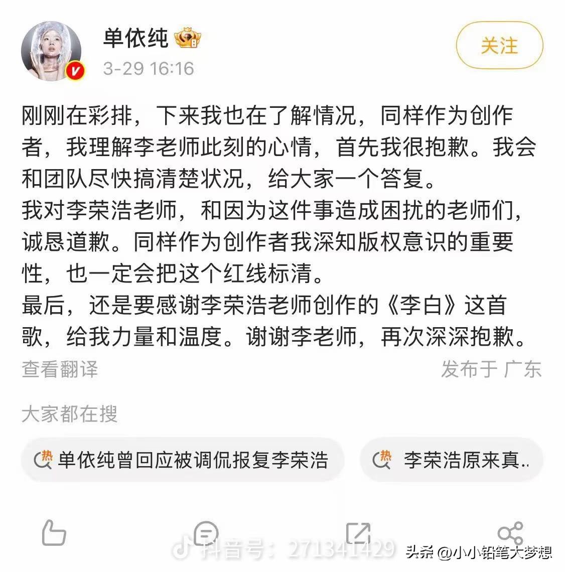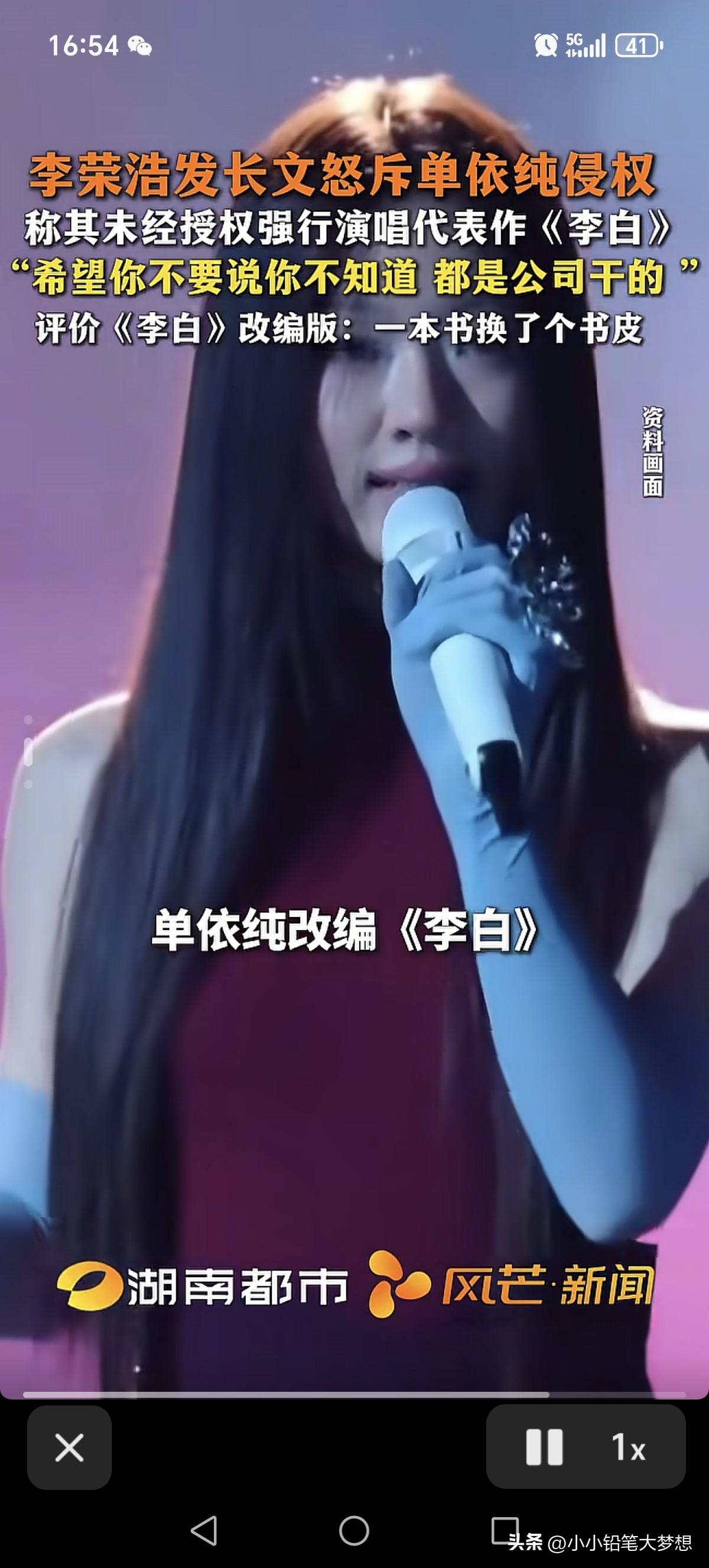 终于出手制裁她!李荣浩公开喊话单依纯,称已婉拒翻唱授权的情况下,强行侵权演唱《李白》!单依纯回应了! 这个单依纯就这么拽吗?婉拒了还强行侵权!她是飘了吗? 以前不认识她,但是这个歌一出来就烦死她了,这种歌曲改的乱七八糟,唱的时候还摇头摆脑,感觉太不正经了, 最烦那句,如何呢,又能怎?多少小孩学了天天嘴上挂着! 李荣浩很佛系很低调的,能把他惹成这样也是牛逼,人家没有允许并且已经明确拒绝的情况下还强行演唱,纯欺人太甚,而且还是本人账号亲自下场撕她!正常都是工作室发声明,真的是忍无可忍了,其实早就该告她了! 然而,刚刚单依纯回应了,正如李荣浩所说:“希望不要说你不知道,都是公司干的!”她居然真的甩锅给团队了!
