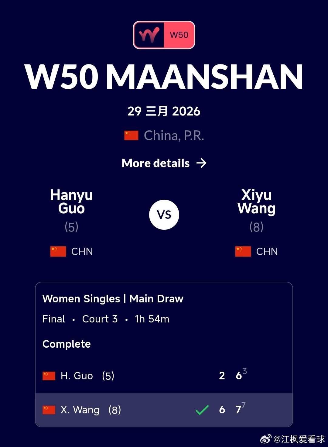 W50马鞍山站🇨🇳女单决赛王曦雨🇨🇳6-2/7-6(3)战胜郭涵煜🇨?