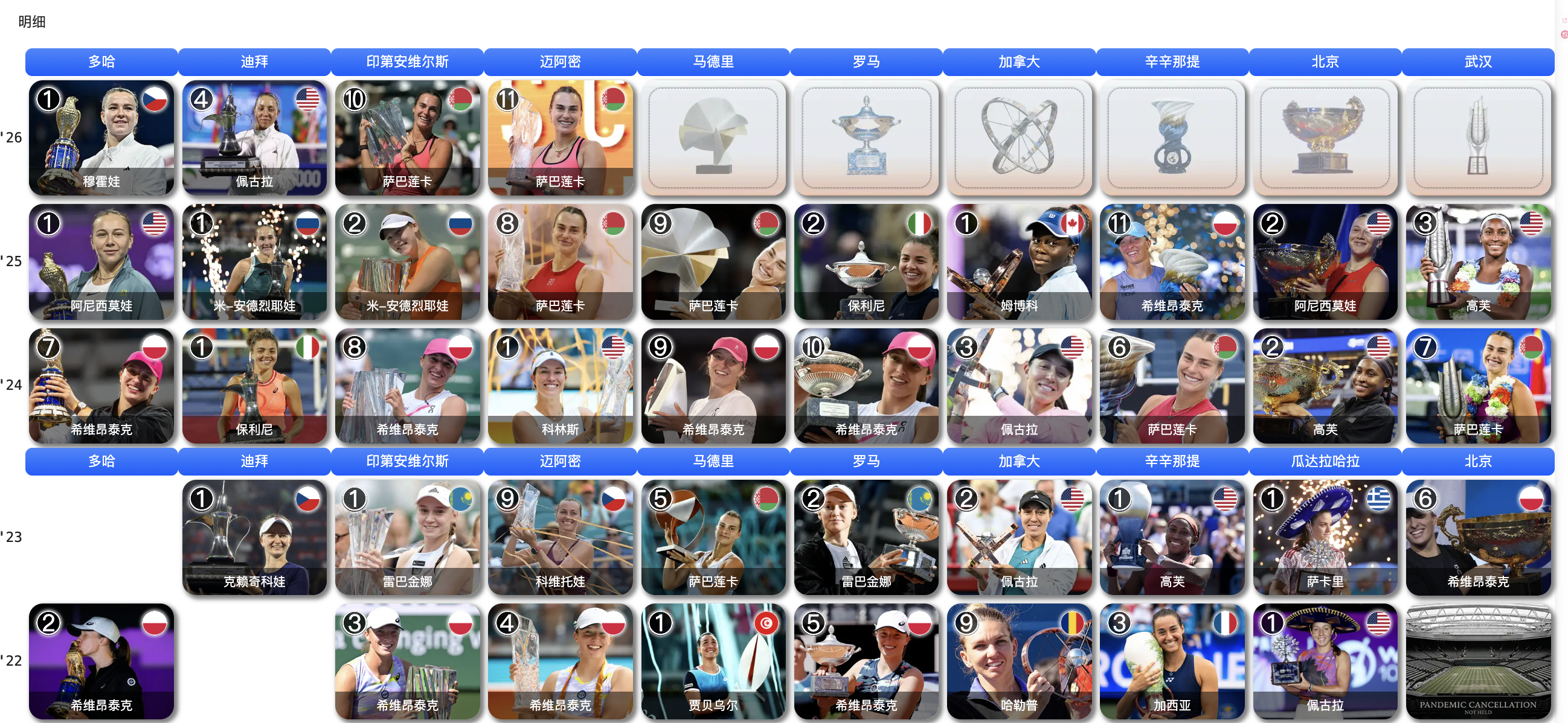 多哈:穆霍娃🇨🇿迪拜:佩古拉🇺🇸印第安维尔斯:萨巴伦卡🇧🇾迈阿密:萨巴伦卡🇧🇾马德里:_______罗马:_______多伦多:_______辛辛那提:_______北京:_______武汉:_______