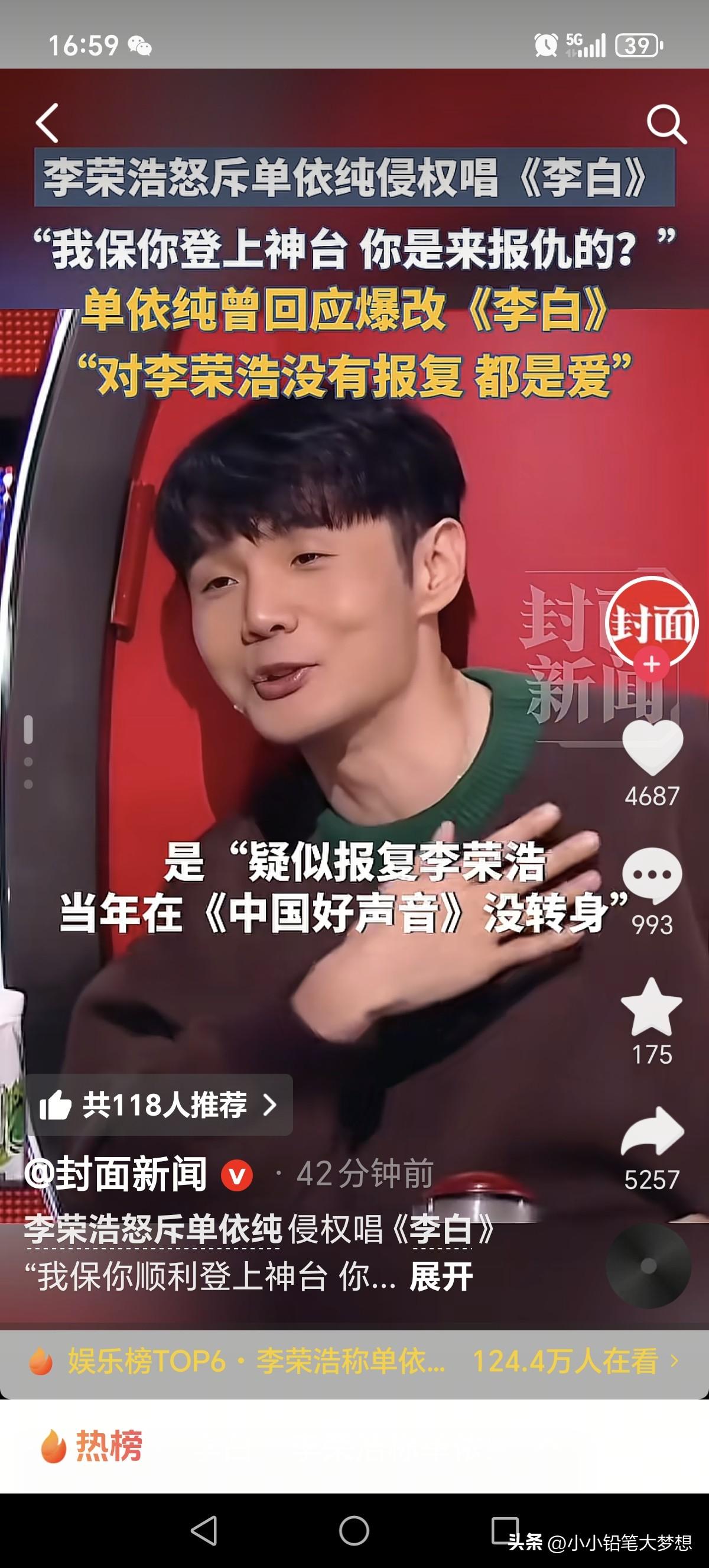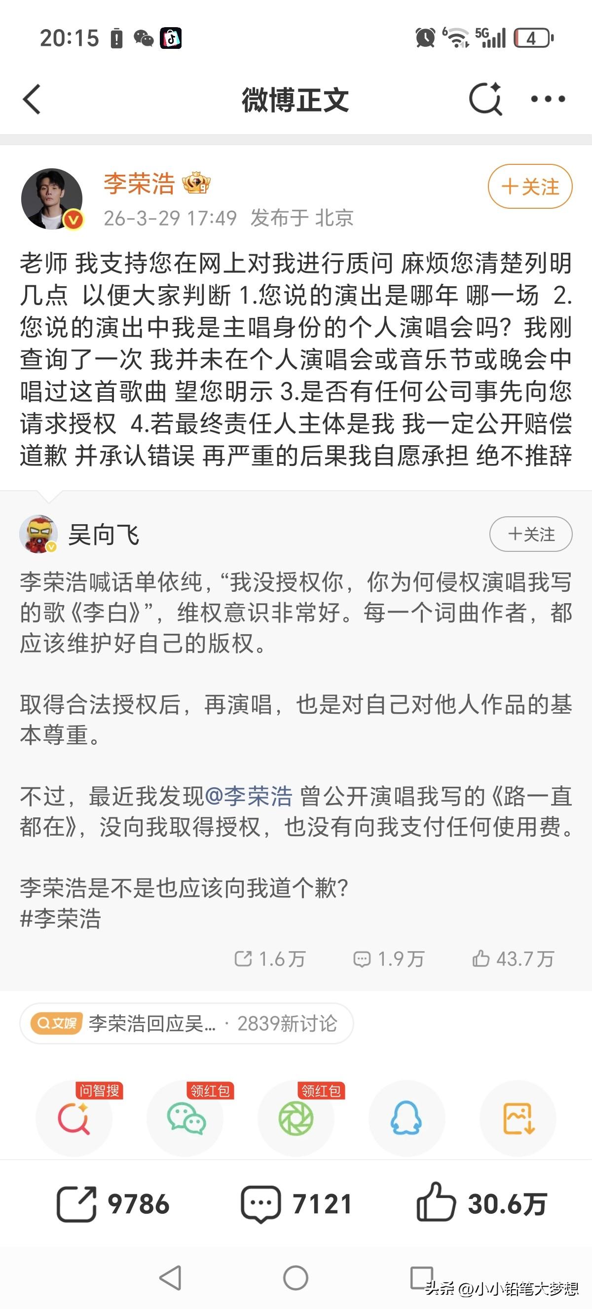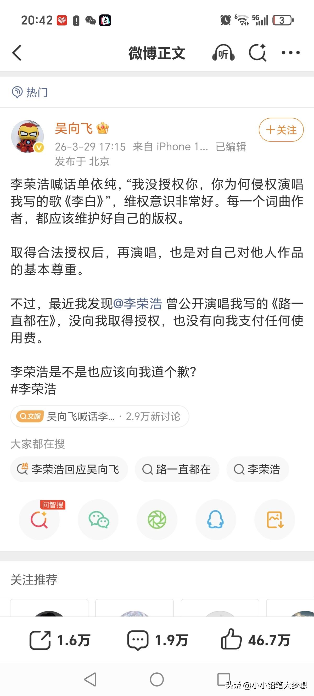 这位默默无闻歌手吴向飞还是很会找“风口”的!李荣浩控告单依纯侵权事件冲上了热搜,吴向飞立马要求李荣浩也道歉! 今天下午李荣浩在微博发文控告单依纯未取得授权就在深圳的演唱会唱了他的歌曲。而这个歌手吴向飞立马,发了两个微博称李荣浩也要向他道歉,因他说李荣浩曾经公开演唱过他的歌《路一直都在》且没取得授权也没支付过版权费。 李荣浩立马回怼:自己没有演唱会或音乐节晚会唱过,请他列出具体是哪一年哪一场,这其中是不是有误会?如果真有侵权,他会公开道歉!但如果列不出来,没有证据,那:“这个事情蛮大的 ,我和律师都在等您!” 吴向飞立马也回应了,但是根本就不敢正面回答李荣浩的问题,文中根本没有说明什么时候,具体哪一场?也没有列出任何证据。 后来网友查了一下,李荣浩确实演唱过,但问题版权在环球,公益演出在13年,公益的,大哥你在春秋笔法干嘛呢!