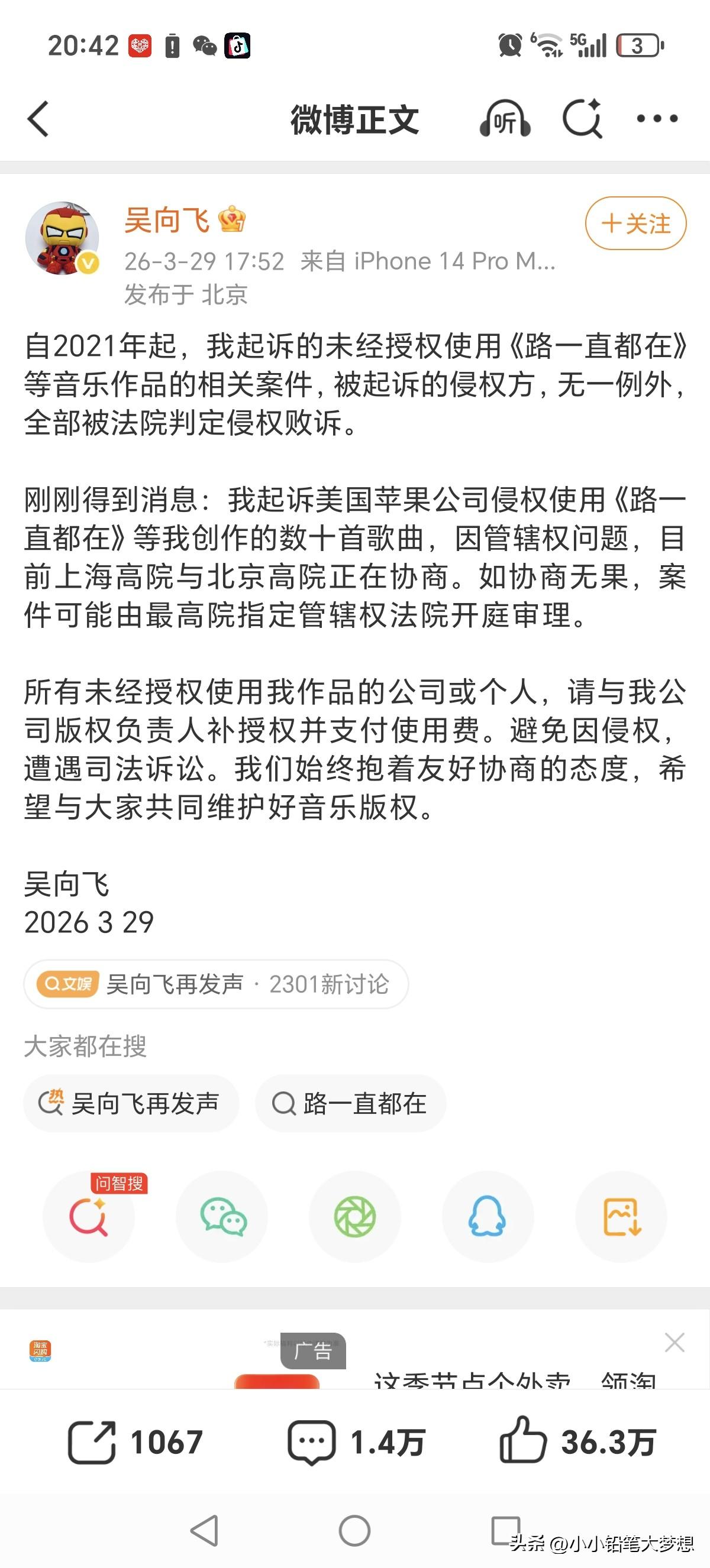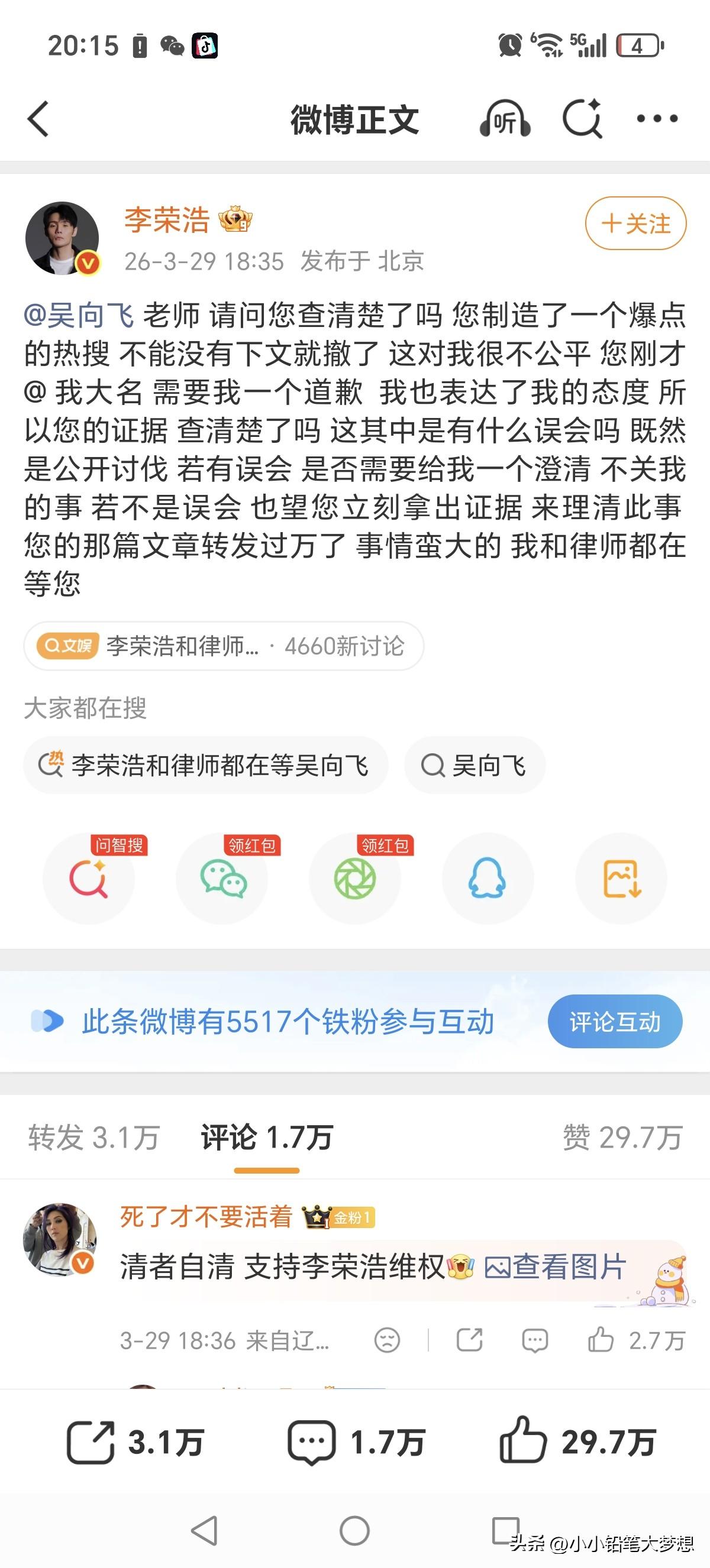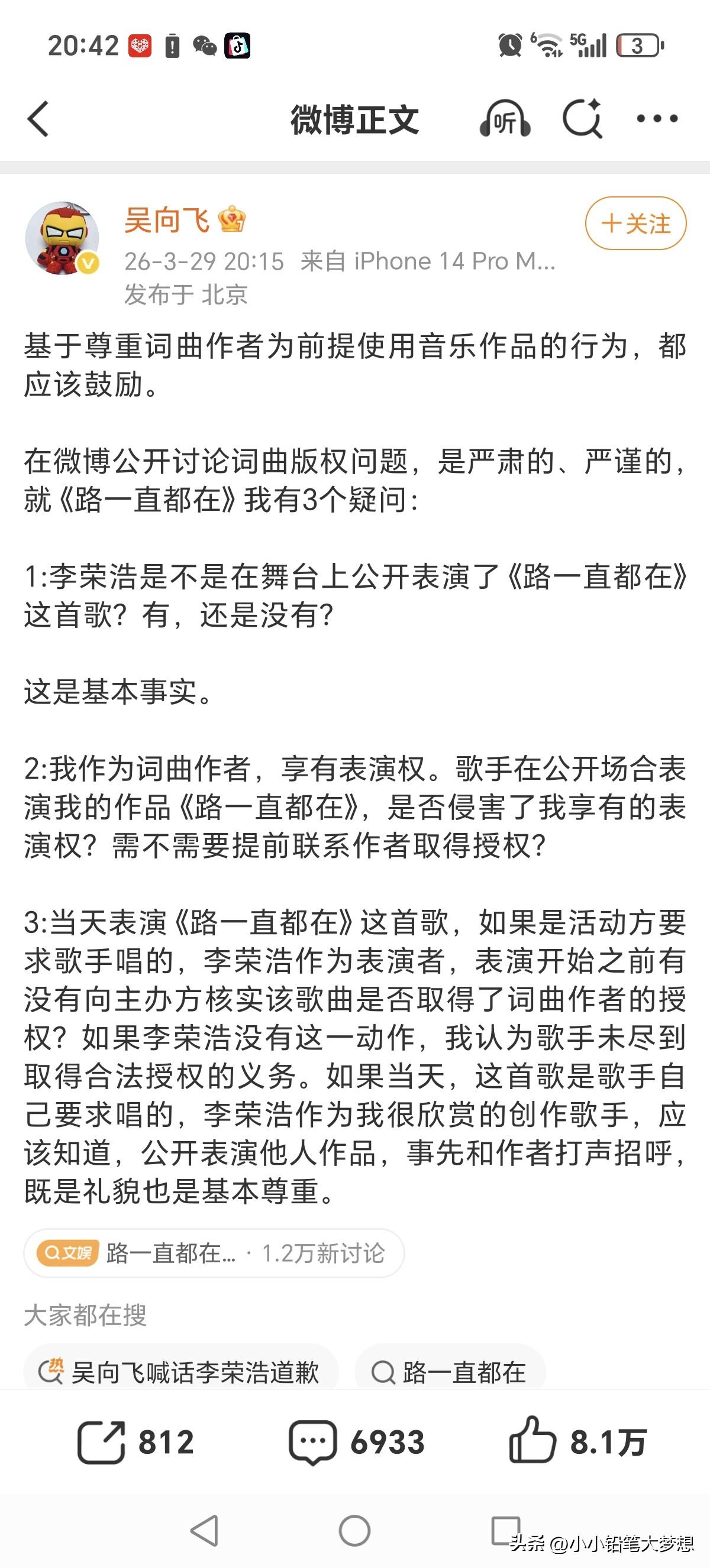 这位默默无闻歌手吴向飞还是很会找“风口”的!李荣浩控告单依纯侵权事件冲上了热搜,吴向飞立马要求李荣浩也道歉! 今天下午李荣浩在微博发文控告单依纯未取得授权就在深圳的演唱会唱了他的歌曲。而这个歌手吴向飞立马,发了两个微博称李荣浩也要向他道歉,因他说李荣浩曾经公开演唱过他的歌《路一直都在》且没取得授权也没支付过版权费。 李荣浩立马回怼:自己没有演唱会或音乐节晚会唱过,请他列出具体是哪一年哪一场,这其中是不是有误会?如果真有侵权,他会公开道歉!但如果列不出来,没有证据,那:“这个事情蛮大的 ,我和律师都在等您!” 吴向飞立马也回应了,但是根本就不敢正面回答李荣浩的问题,文中根本没有说明什么时候,具体哪一场?也没有列出任何证据。 后来网友查了一下,李荣浩确实演唱过,但问题版权在环球,公益演出在13年,公益的,大哥你在春秋笔法干嘛呢!