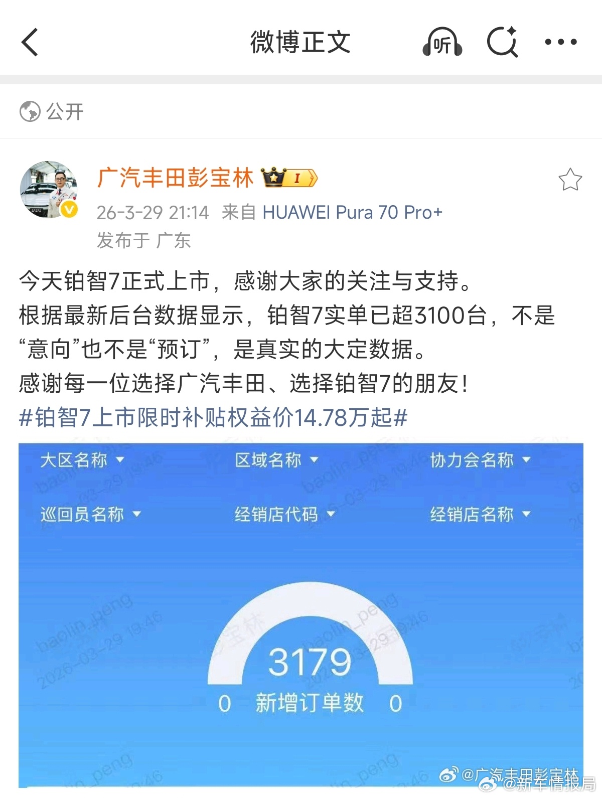 也就在刚刚,广汽丰田销售副总通过微博晒出铂智7内部系统截图,显示新增订单数已突破3100台。