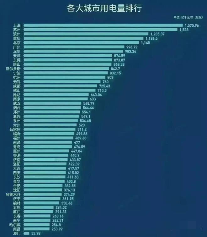 万万没想到! 全国各大城市用电量居然差距这么大! 仔细分析了一下,用电量基本上跟GDP是正相关的,如果说有偏差,那就是跟城市都产业结果跟人口数量有关系。另外,像传统重行业、高耗能行业用电量大,这也是像滨州、鄂尔多斯这样的城市用电量很高的重要原因。用电对比分析