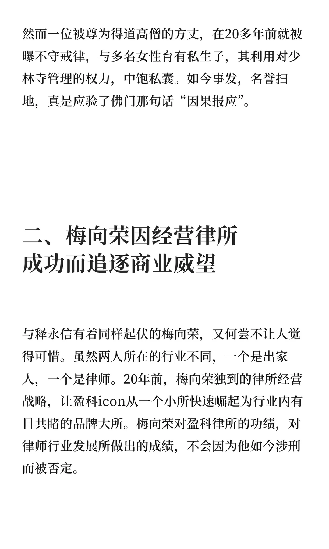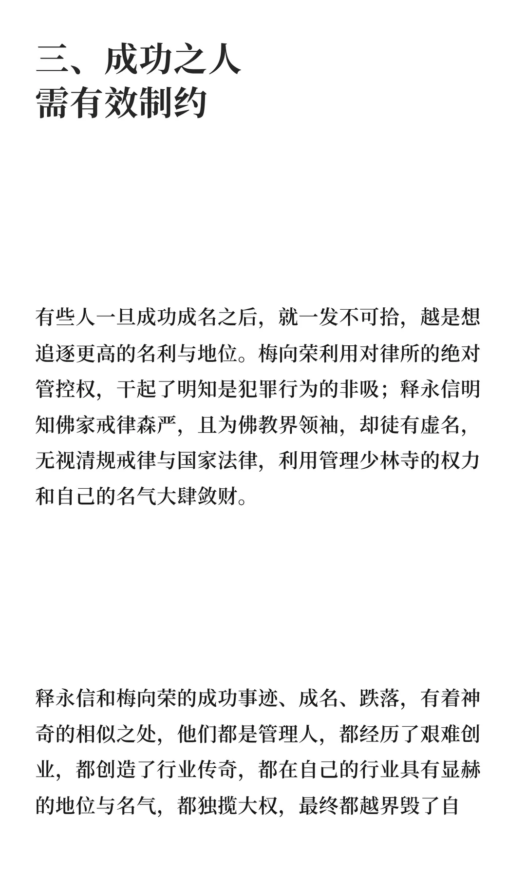 释永信因少林寺管理权滥用被公诉,梅向荣因非法吸储被捕。名人权力若缺乏有效制约,易被滥用,导致名誉扫地。释永信与梅向荣的成功与跌落,警示权力需在制度框架内运行,避免越界。