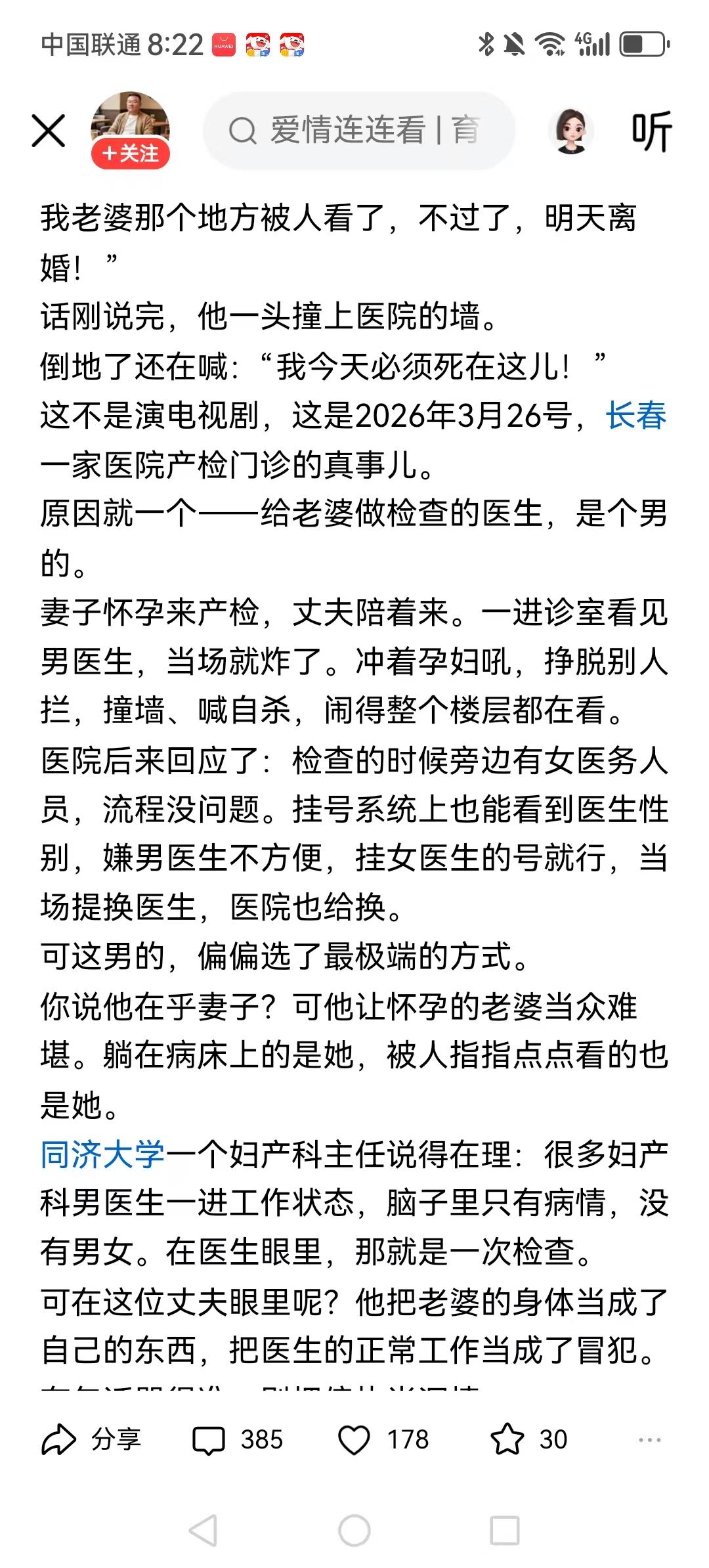 这哥们是真想离婚,可算逮到借口了。医院有妇科男医生不是很正常的吗?又不是现在有。 我是男的,出车祸做盆骨手术时,脱的光光的,也有好几个女护士,我就没尴尬因为我麻了。 太可笑了,什么年代了,还有这种自私下作的男人。 你媳妇儿只不过是个产检,做一下彩超,谁看那地方干啥?又不是生孩子呢。 赶紧离开了极端,自私,迂腐,没脑,丢人,以后还敢吵架吗,那不得寻死觅活。 医生不分男女,这怎么可能啊!不过该尴尬的应该是医生,病人为什么要尴尬?男医生学妇科,确实令人匪夷所思。