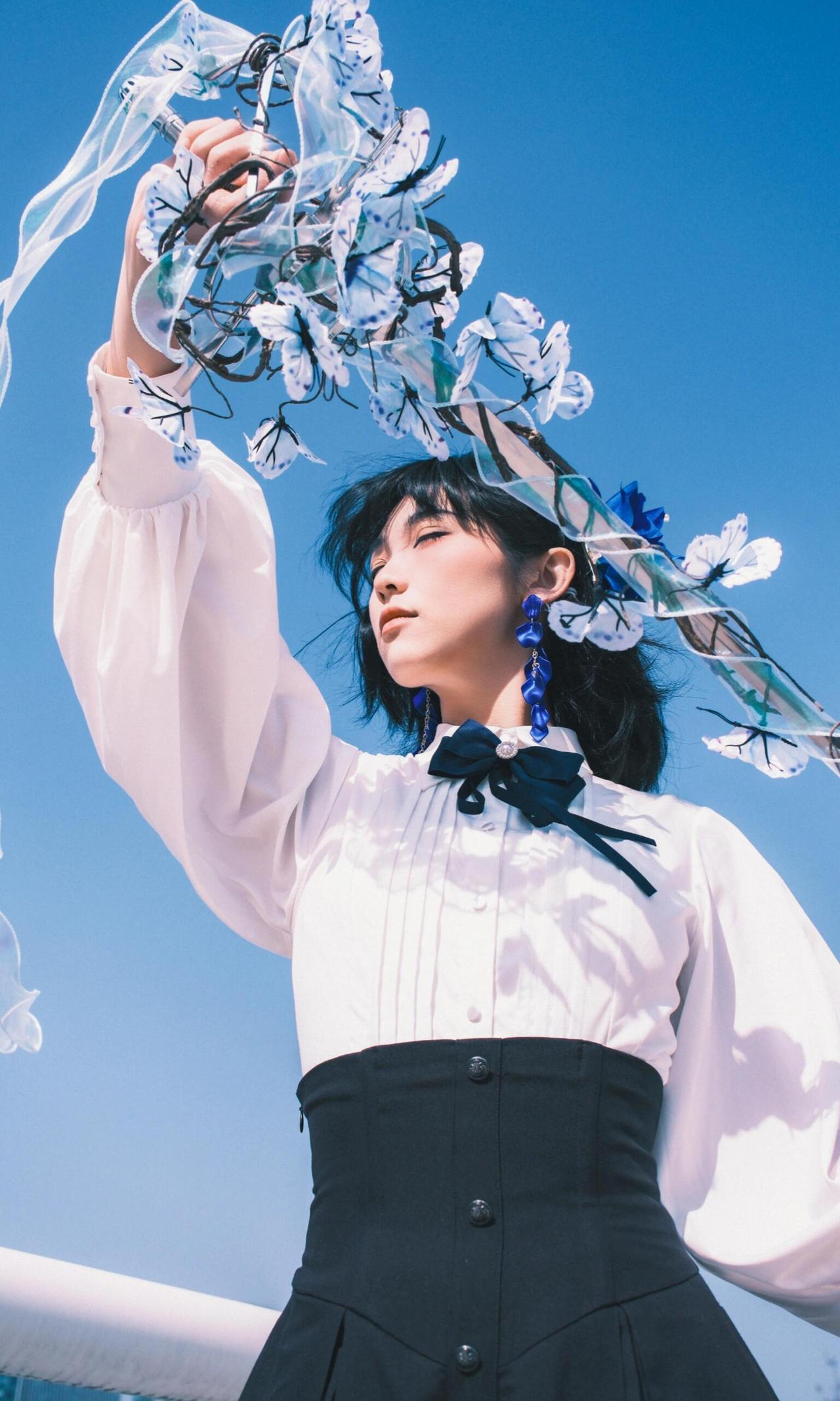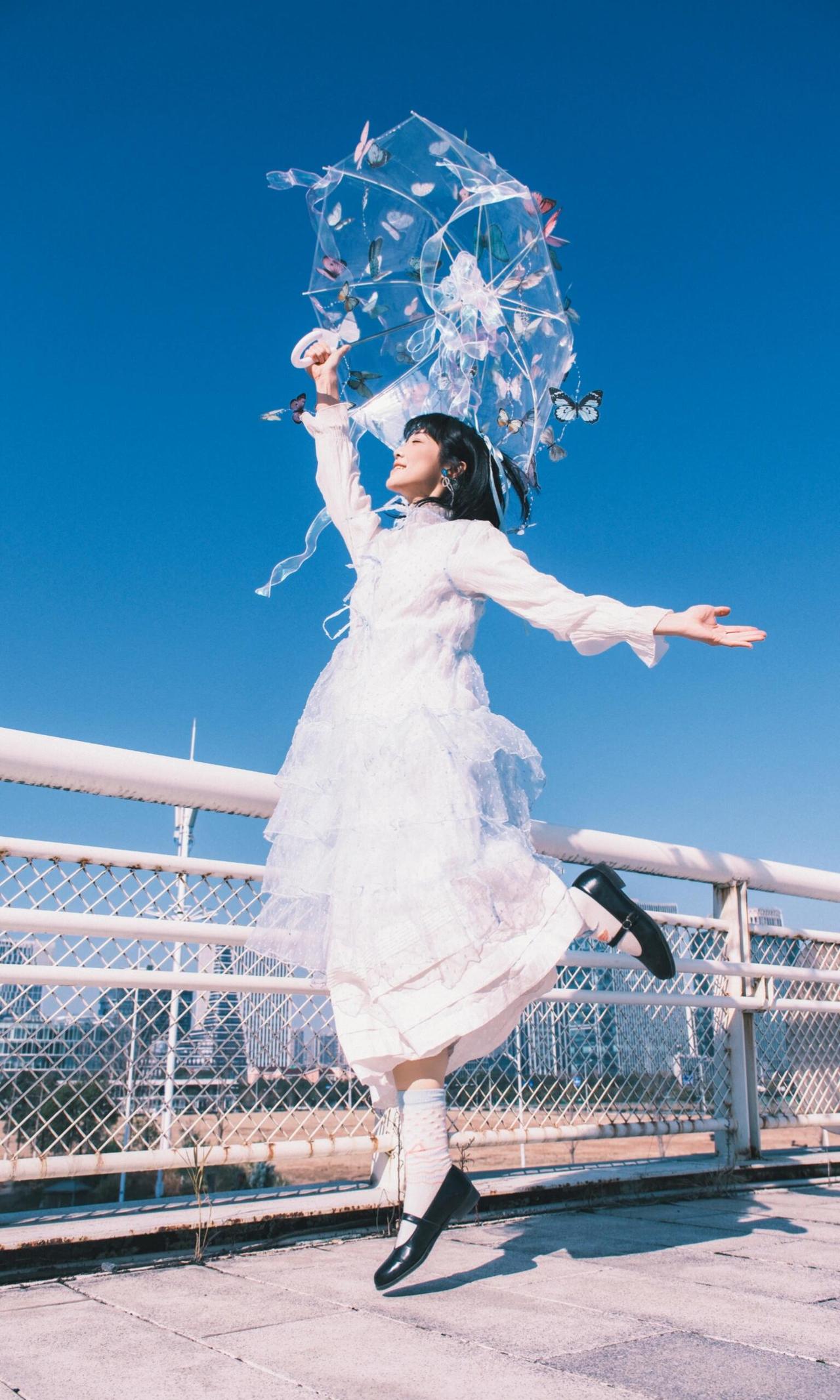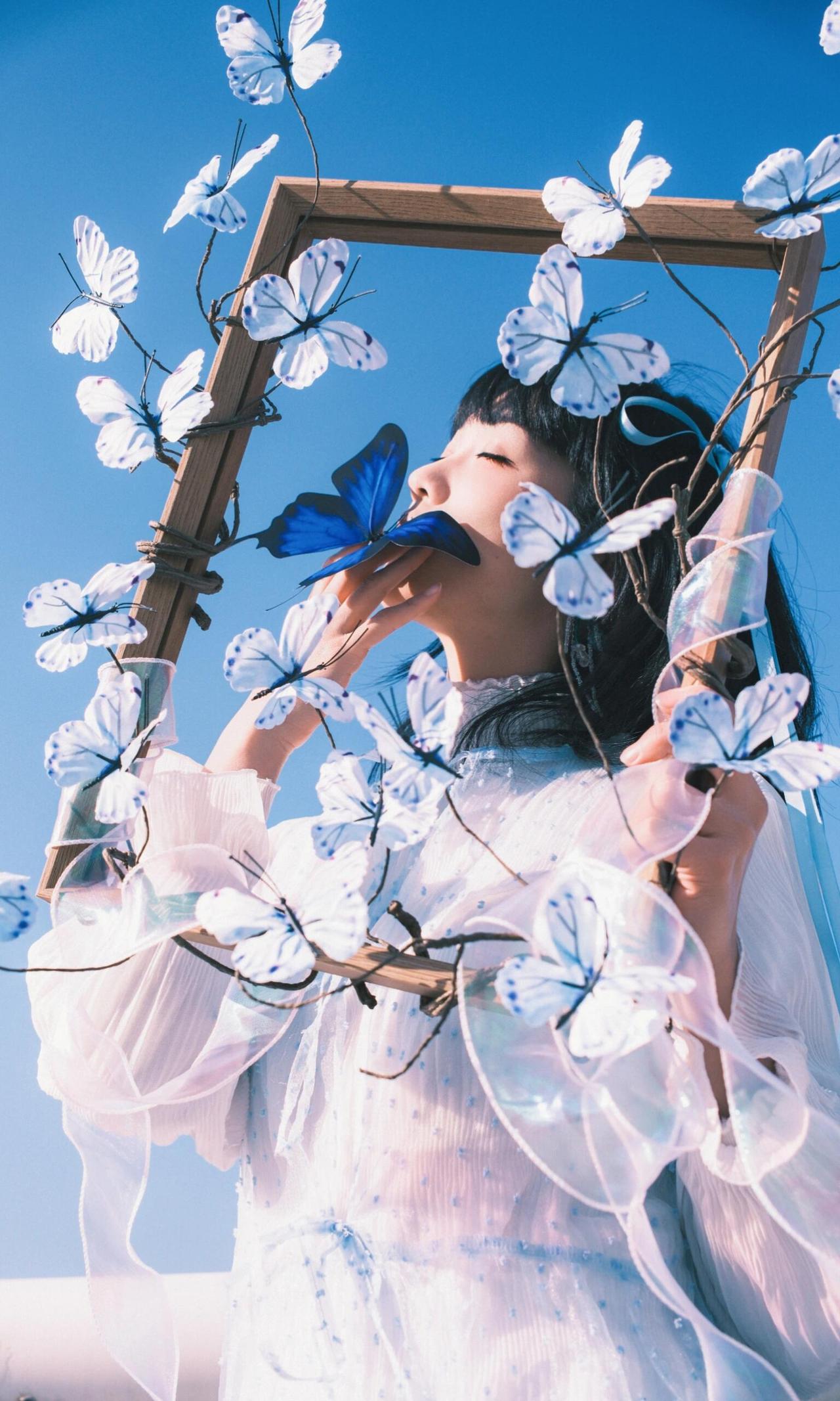作品以木质花架为框架,将人物包裹其中,框架构图不仅隔绝了背景干扰,更让人物成为视觉绝对焦点,契合青春人像的叙事感营造。漫天飞舞的白色蝴蝶道具与指尖停留的蓝蝶形成呼应,虚实交织的布局,赋予画面极强的童话感与想象力,完美诠释了青春里的烂漫与诗意。 人物闭眼轻触蝶翼的姿态,松弛又温柔,传递出沉浸在美好中的安然情绪,面部神态的细腻捕捉,让情绪表达更具感染力。光线选择侧逆光,勾勒出人物发丝的轮廓,同时让蝴蝶翅膀的纹理清晰可见,光影的明暗过渡柔和,既突出了人物轮廓,又保留了背景花架的细节层次。色彩上以纯净蓝天为底,白色蝴蝶与浅蓝服饰形成统一调性,蓝蝶作为视觉亮点打破单调,整体画面干净通透,没有冗余元素,将青春的懵懂与美好具象化,是一组极具故事性的青春人像作品。