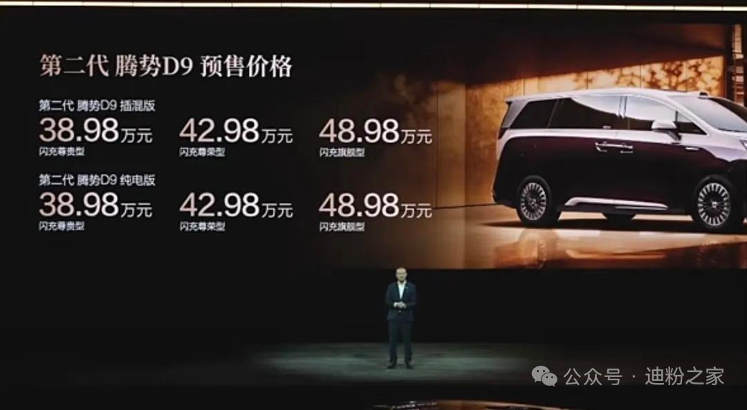 腾势官宣:第二代D9全球顶级奢华MPV开启预售,38.98万起,纯电/插混双版本同价。 ✨ 核心亮点 - 续航拉满:纯电最长800km,插混纯电401km,二代刀片电池+闪充,5分钟充至70%。 - 七大升级:全新底盘/悬架、空间、内饰、天神之眼5.0、智能座舱、安全全维进化。 - 后排奢享:吸顶巨幕+NAPPA真皮,移动头等舱既视感。 - 预售福利:18个月免费闪充,省超2万,4月到店。 豪华MPV新标杆,商务家用一步到位。【来自懂车帝车友圈】