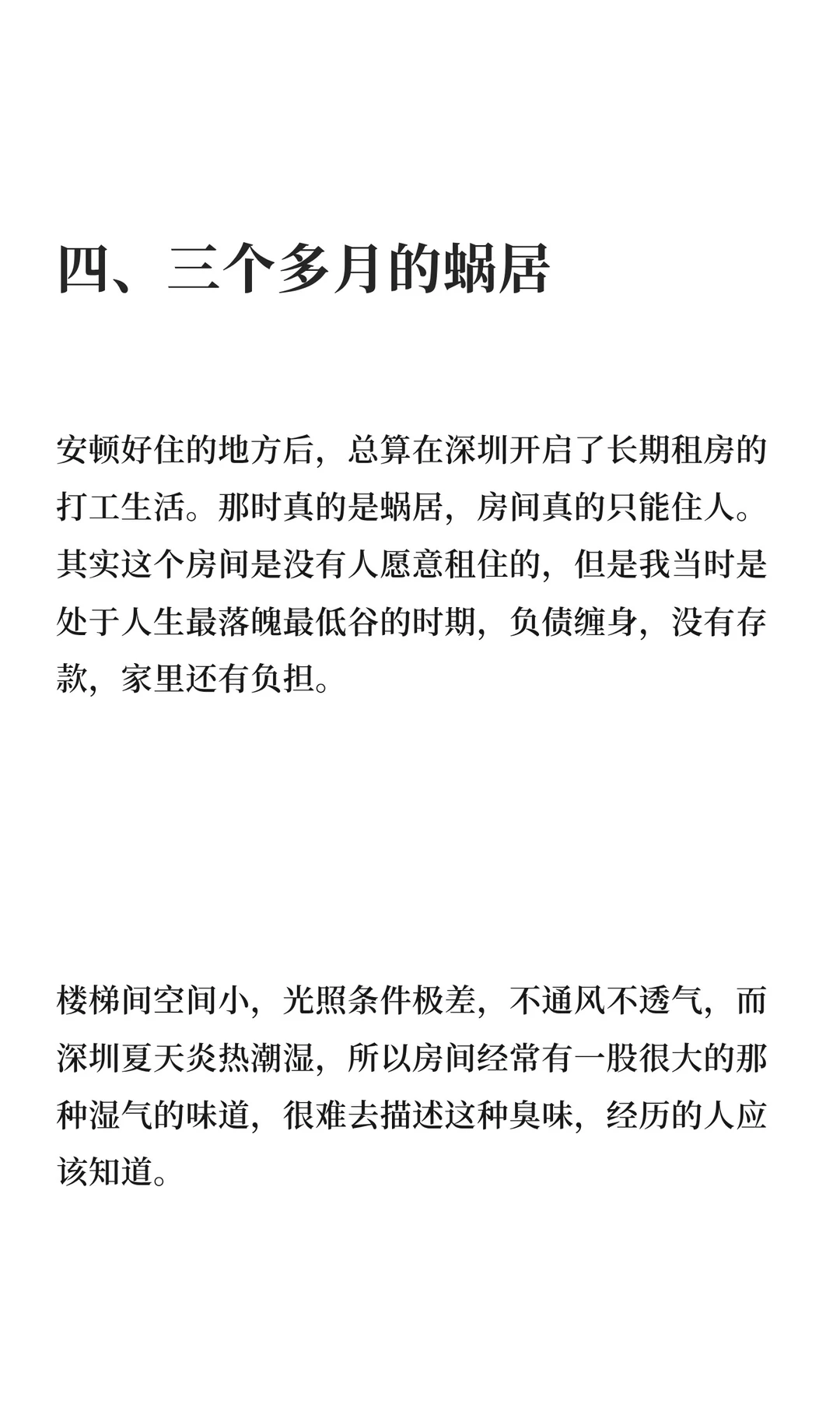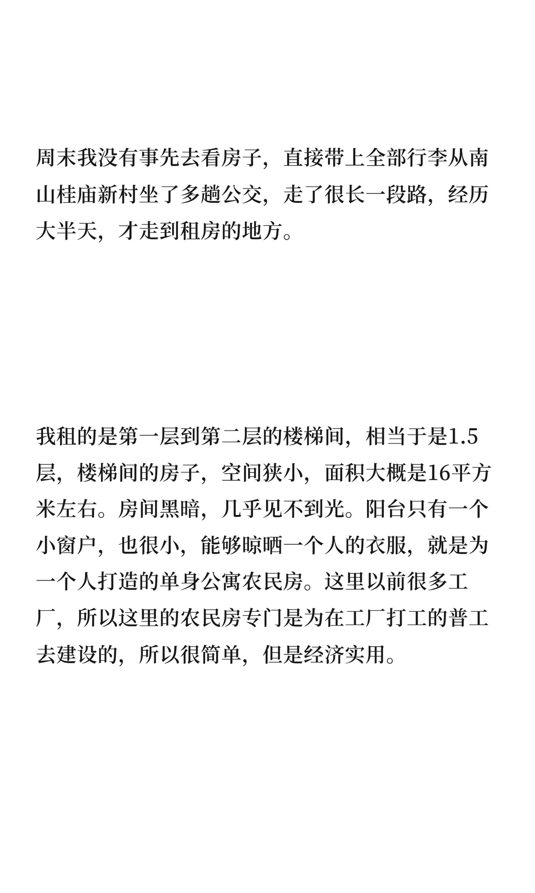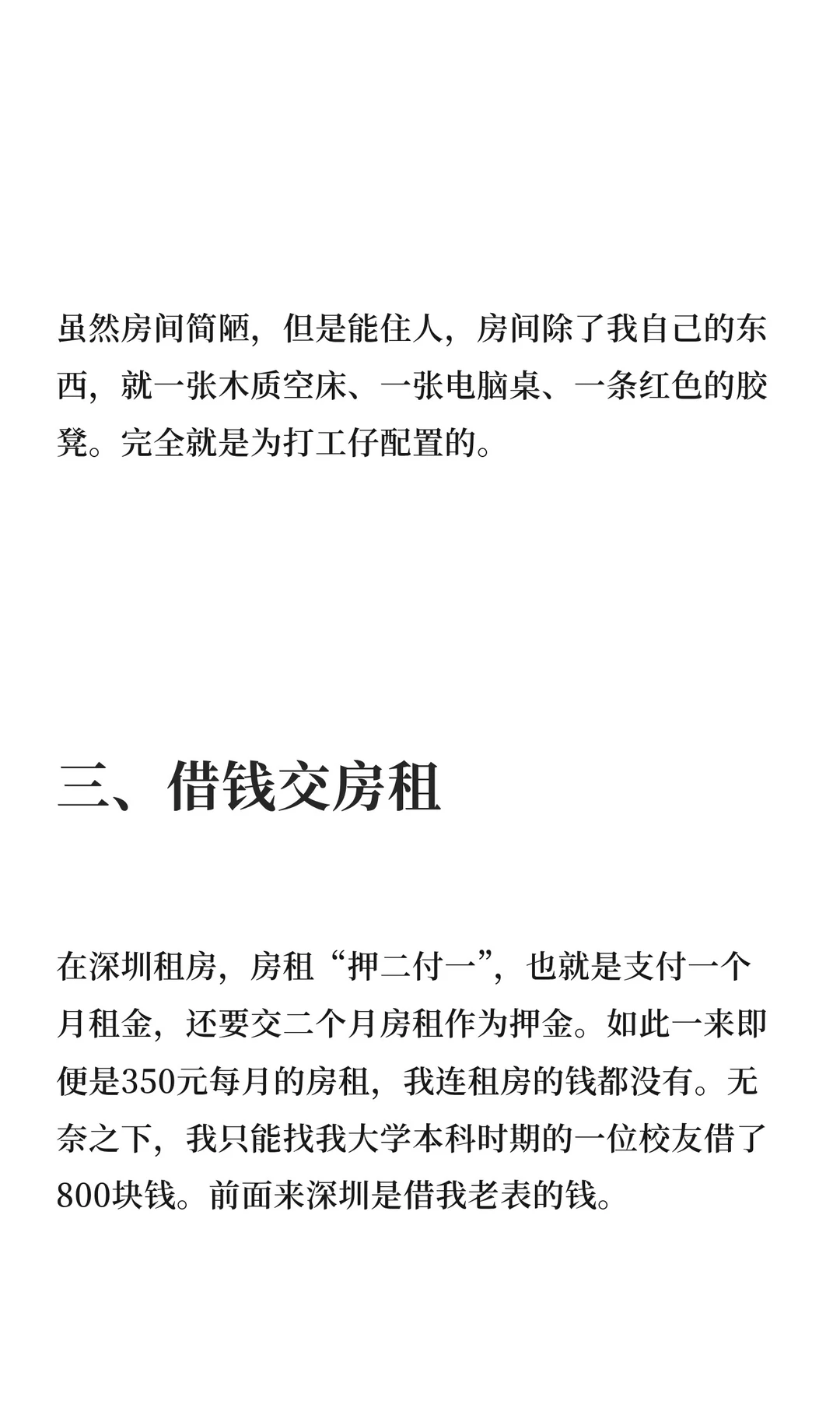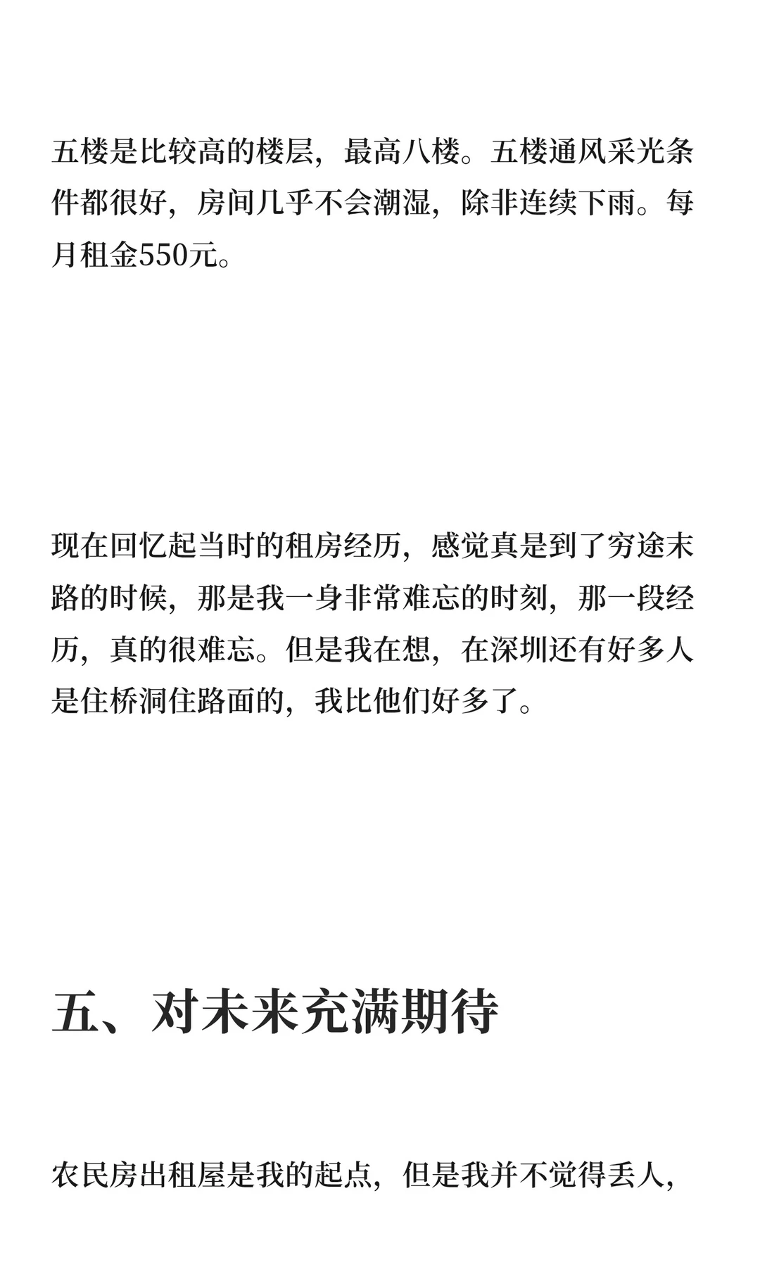 在深圳租房时,我选择了一间租金350元的简陋房间,面积仅16平方米,房间黑暗潮湿,通风不良。为支付房租,我向校友借了800元。这段经历让我深刻体会到深圳的艰辛,但对未来充满期待。