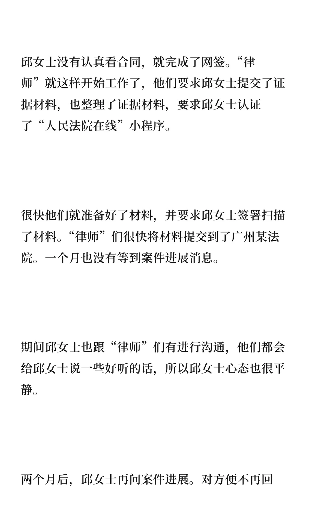 很快他们就准备好了材料,并要求邱女士签署扫描了材料。“律师”们很快将材料提交到了广州某法院。一个月也没有等到案件进展消息。