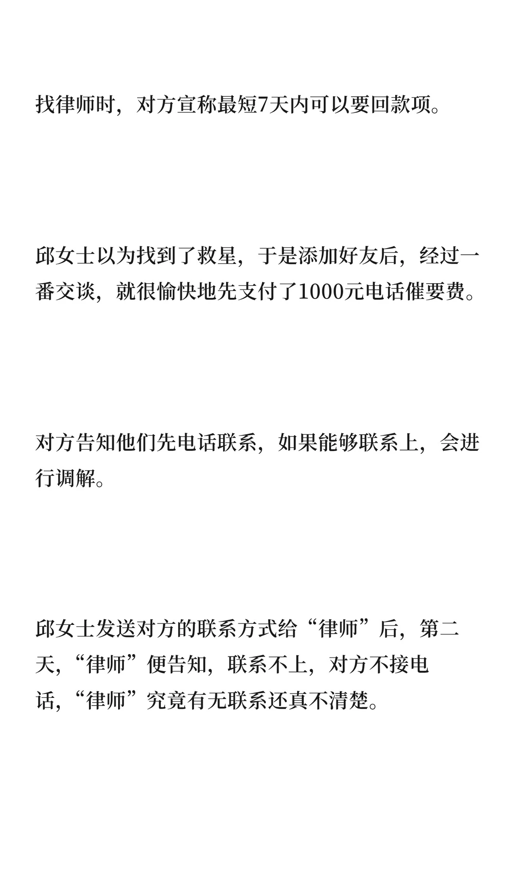 邱女士以为找到了救星,于是添加好友后,经过一番交谈,就很愉快地先支付了1000元电话催要费。