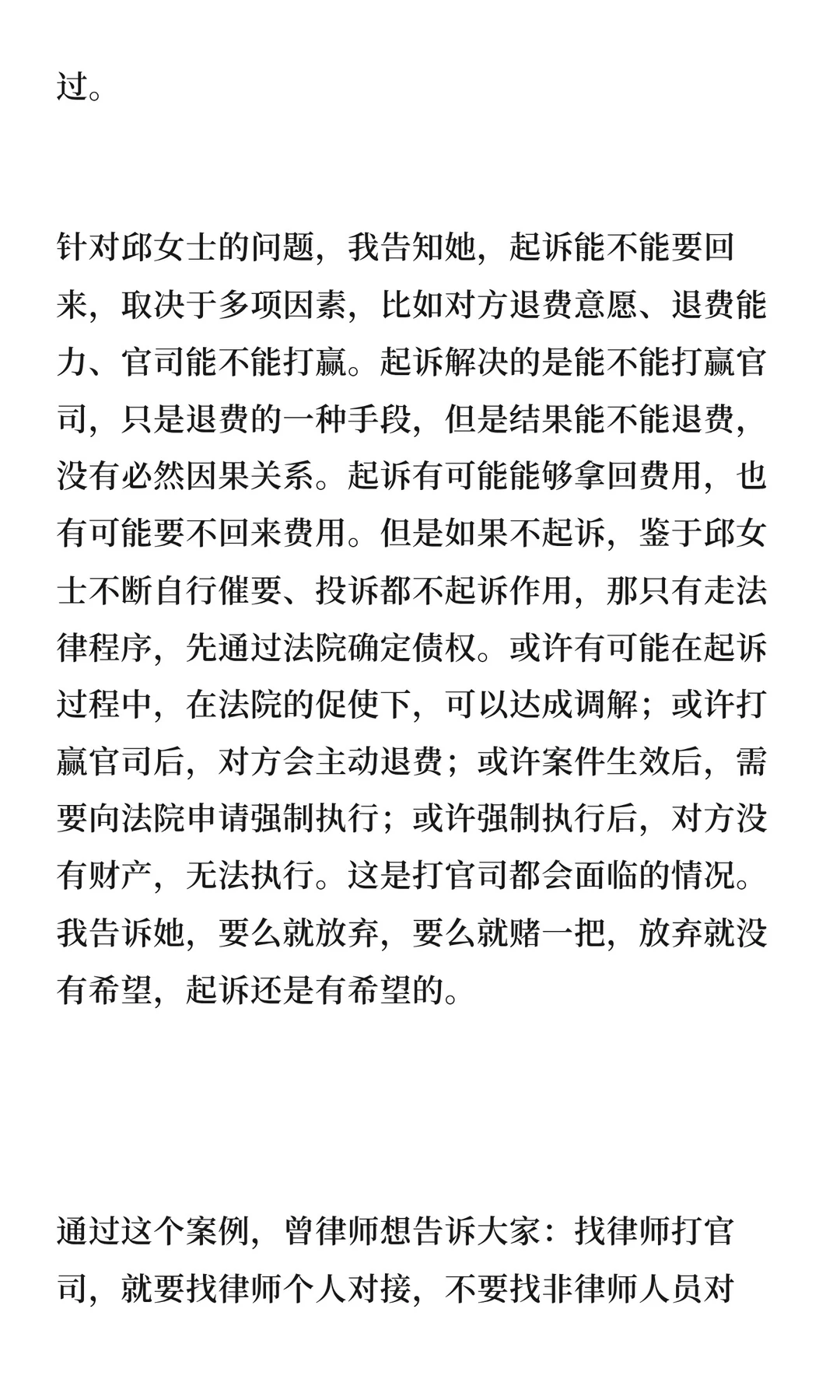 接着,“律师”建议邱女士走诉讼程序。“律师”称所有费用都可以向对方主张,他们会在2个月内要回款项。