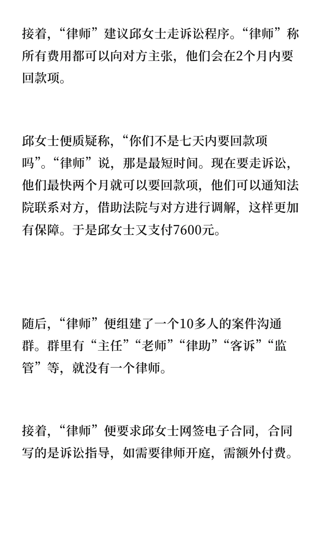 邱女士便质疑称,“你们不是七天内要回款项吗”。“律师”说,那是最短时间。现在要走诉讼,他们最快两个月就可以要回款项,他们可以通知法院联系对方,借助法院与对方进行调解,这样更加有保障。于是邱女士又支付7600元。