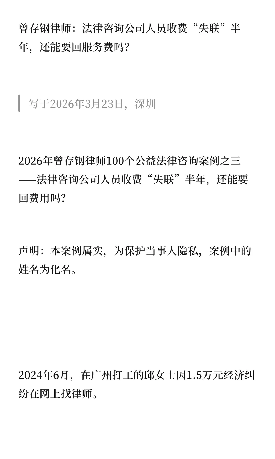 2026年曾存钢律师100个公益法律咨询案例之三——法律咨询公司人员收费“失联”半年,还能要回费用吗?