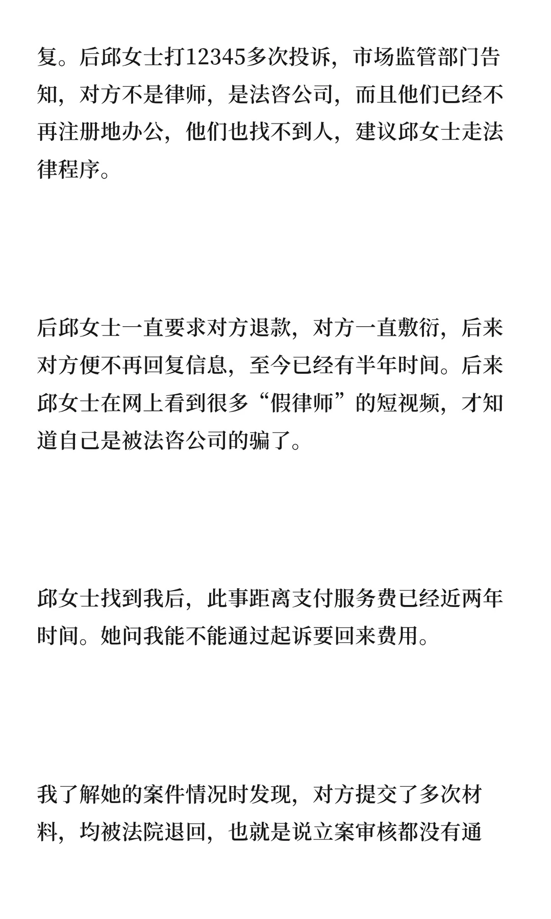 后邱女士一直要求对方退款,对方一直敷衍,后来对方便不再回复信息,至今已经有半年时间。后来邱女士在网上看到很多“假律师”的短视频,才知道自己是被法咨公司的骗了。