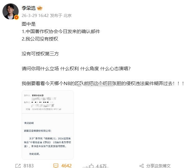 【李荣浩4连质问单依纯:你用什么立场、什么权利、什么角度、什么心态演唱?】李荣浩晒著作权协会情况说明 3月29日,公开指控单依纯在深圳演唱会未经授权翻唱《李白》。随后,发文道歉。