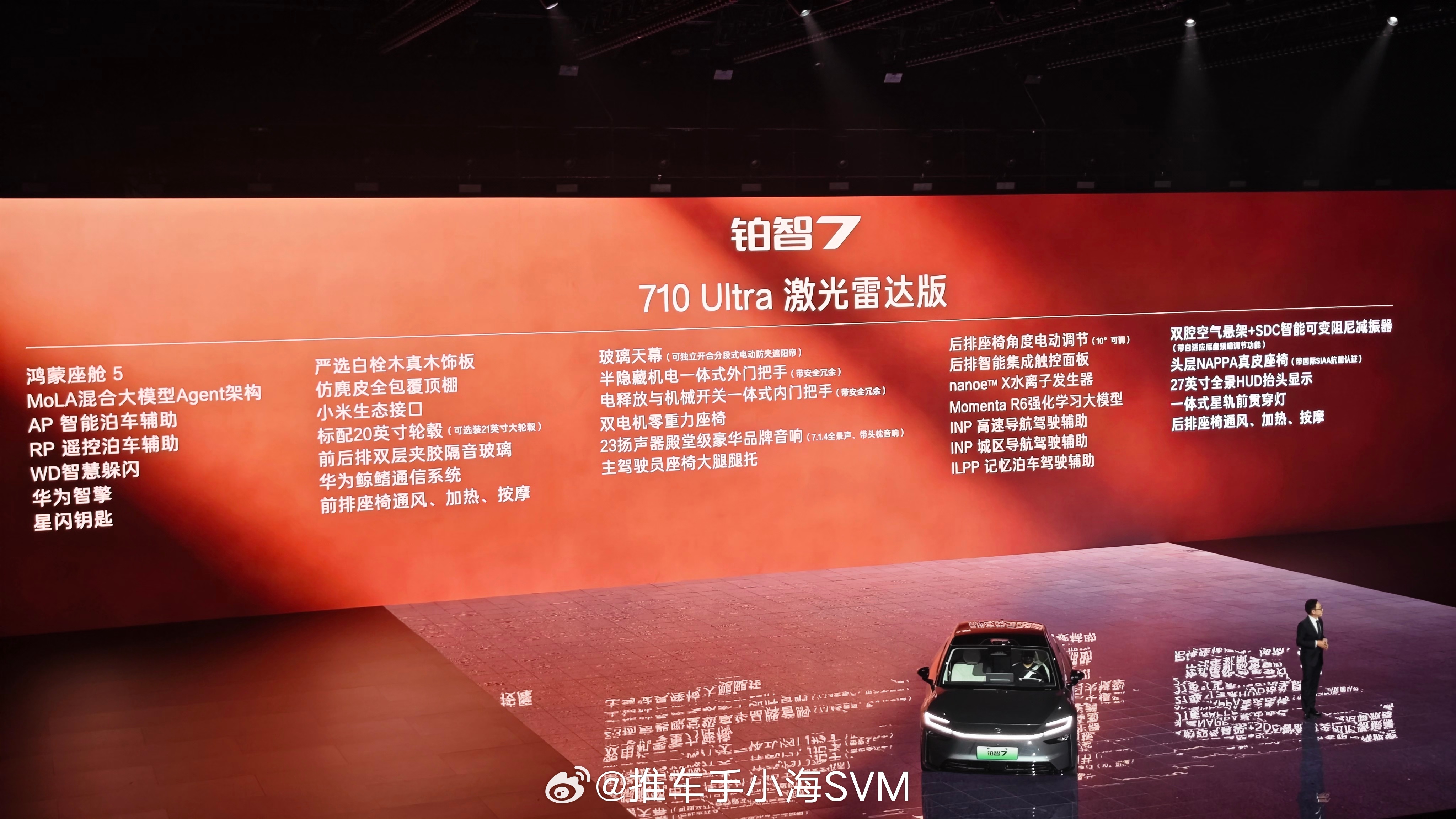 再看配置,铂智7的配置此前很多人都有所了解,作为丰田史上最宽纯电轿车、首款搭载双腔空悬的纯电旗舰,铂智 7 将大型轿车尺寸、华为鸿蒙座舱、激光雷达智驾、双腔空悬驾控等顶级配置全面下放。以前空悬是个分水岭级别的配置,往往是顶配甚至还要加钱选装,现在谁还能说 “20 万级纯电无真旗舰” ?没有一点架子,没有一点历史包袱,丰田铂智7这次是用户喜欢什么,就用什么。铂智7真的把配置给足了,这就是新能源时代的丰田味道。