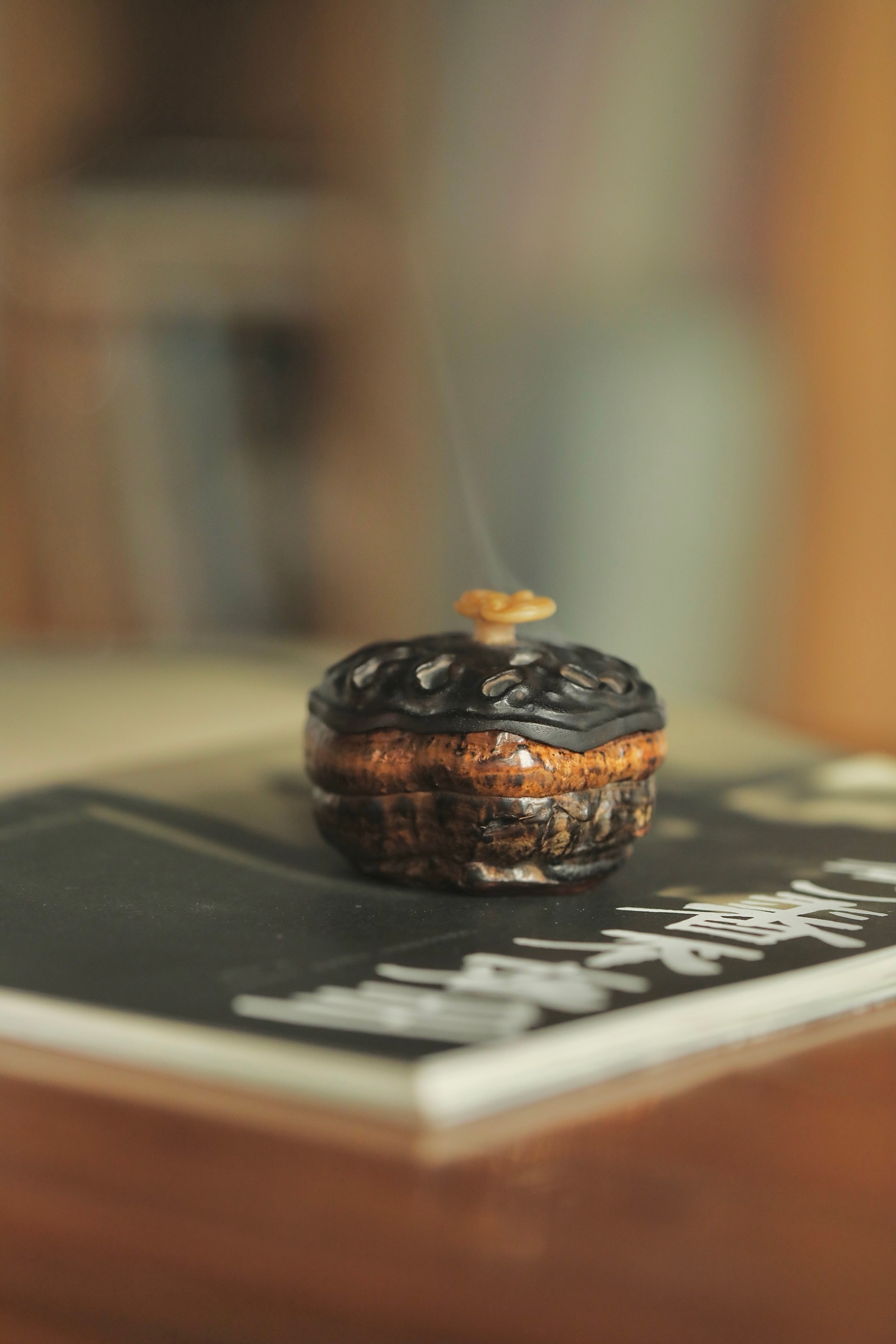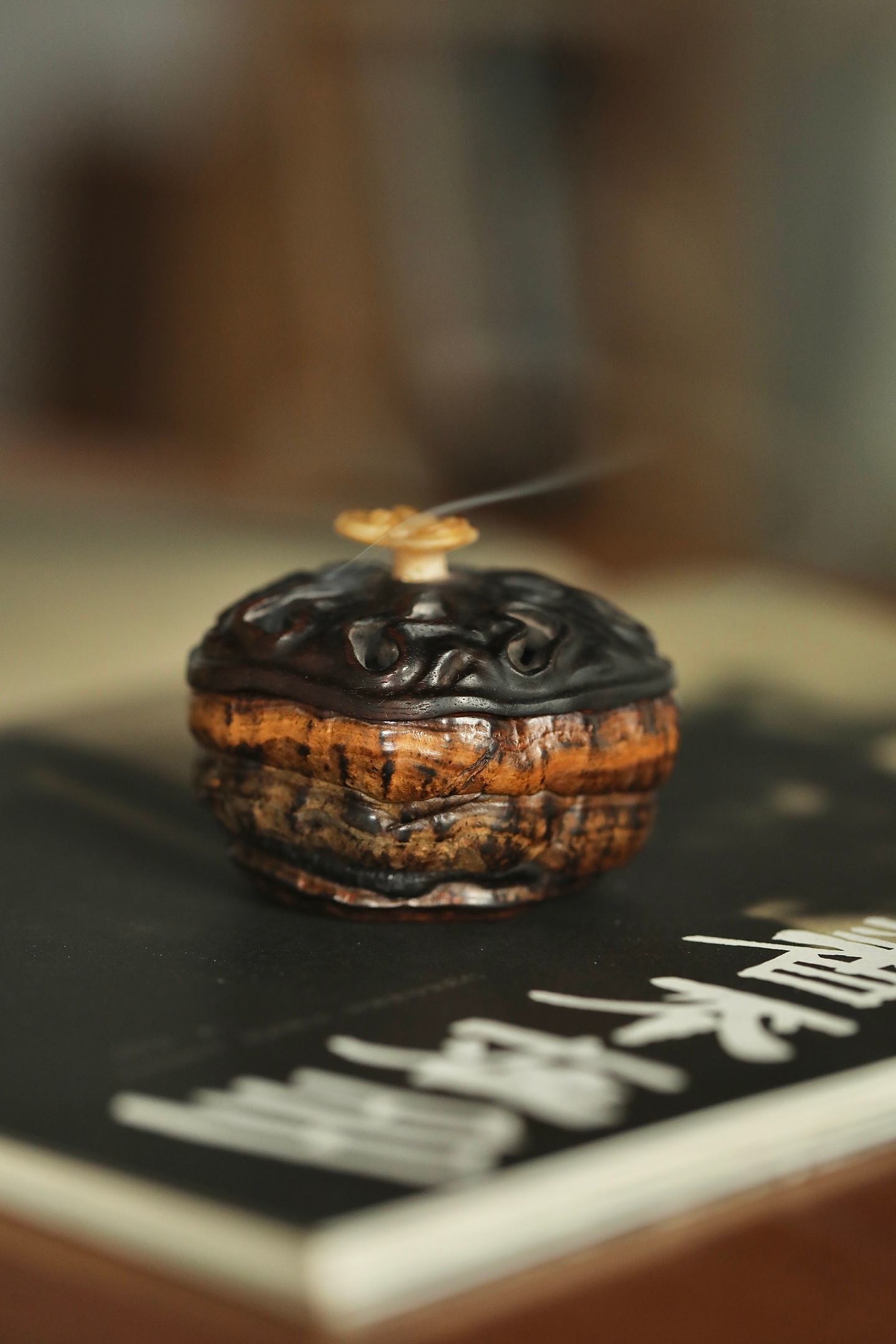 外取灵芝天然之态,纹理虬结,古拙苍劲;内膛精工髹金,流光溢彩。金腹纳香,芝盖承烟,更显雅致。