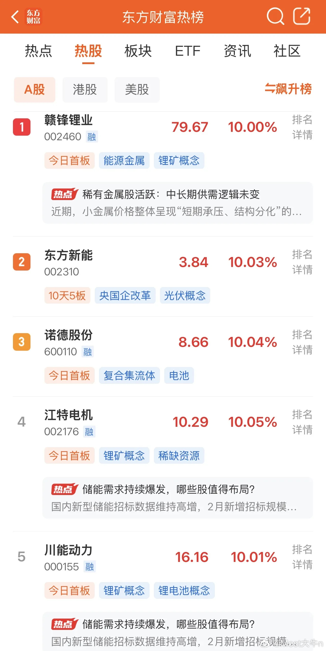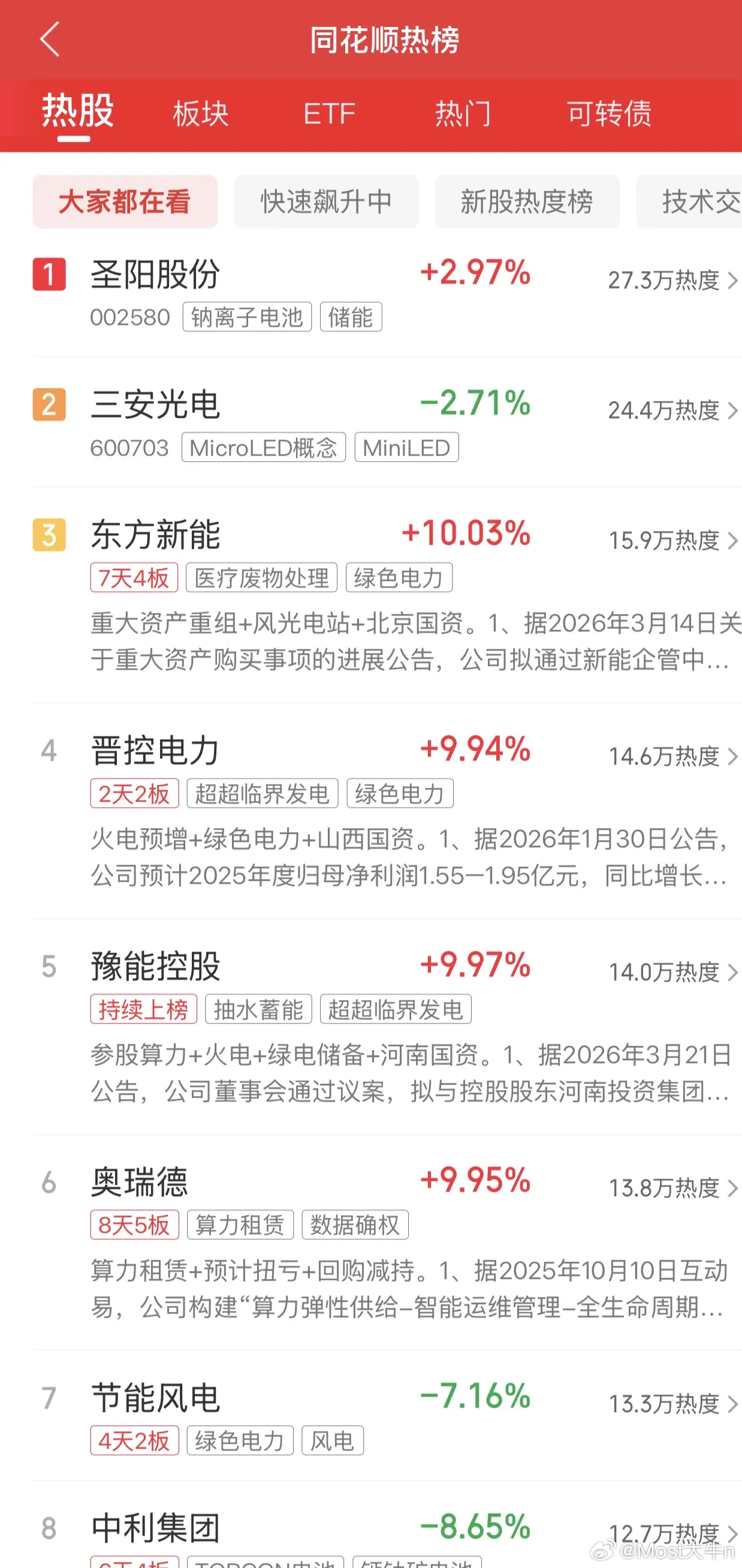 2026年3月29日,各大股吧前十热股:淘股吧: 1.华电辽能 2.华民股份 3.豫能控股 4.晋控电力 5.东方新能 6.融捷股份 7.大东南 8.新能泰山 9.石化油服 10.潍柴动力 东财吧: 1.赣锋锂业 2.东方新能 3.诺德股份 4.江特电机 5.川能动力 6.融捷股份 7.奥瑞德 8.广西能源 9.大东南 10.舒泰神同花顺: 1.圣阳股份 2.三安光电 3.东方新能 4.晋控电力 5.豫能控股 6.奥瑞德 7.节能风电 8.中利集团 9.华电辽能 10.赣锋锂业