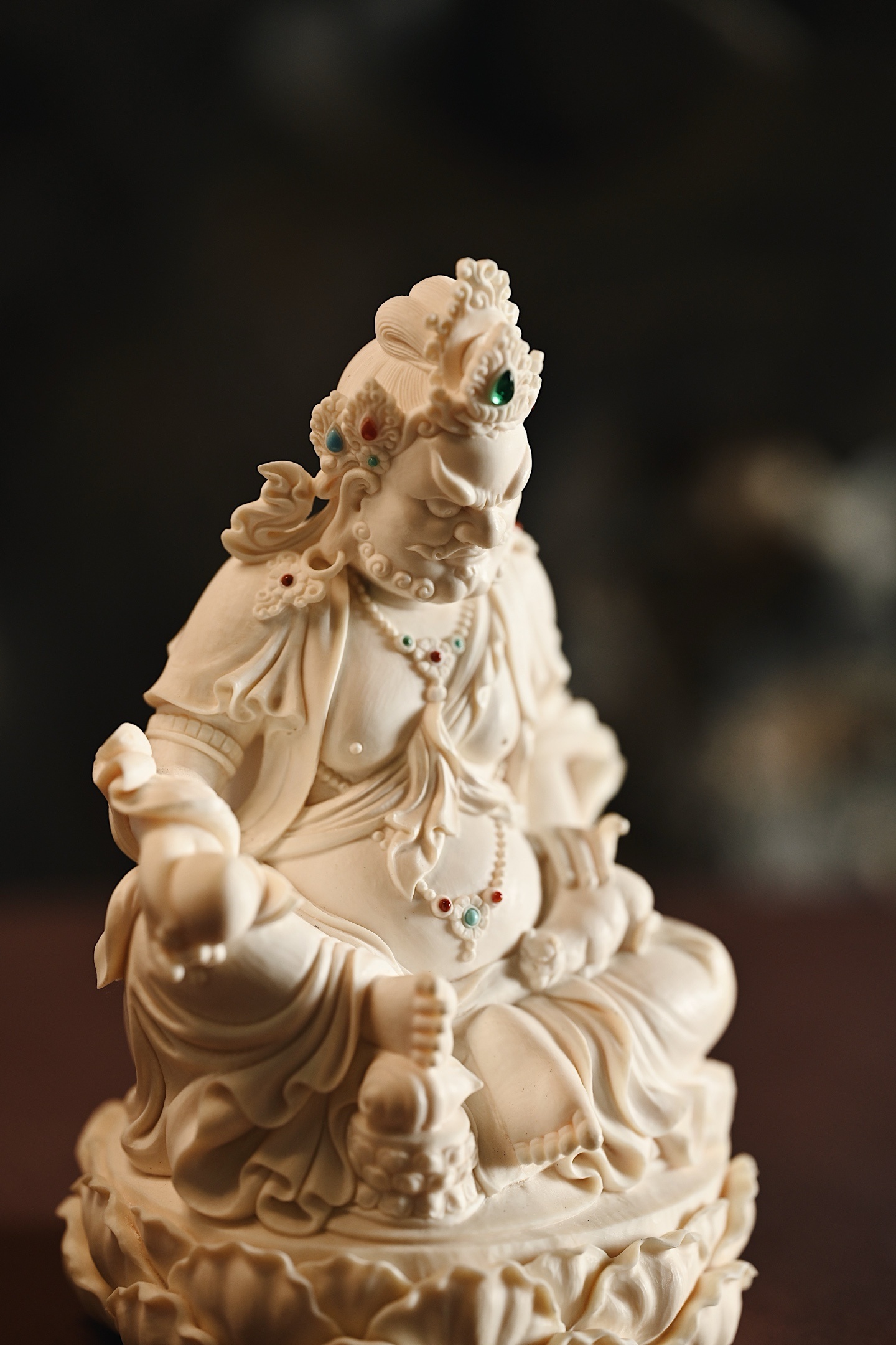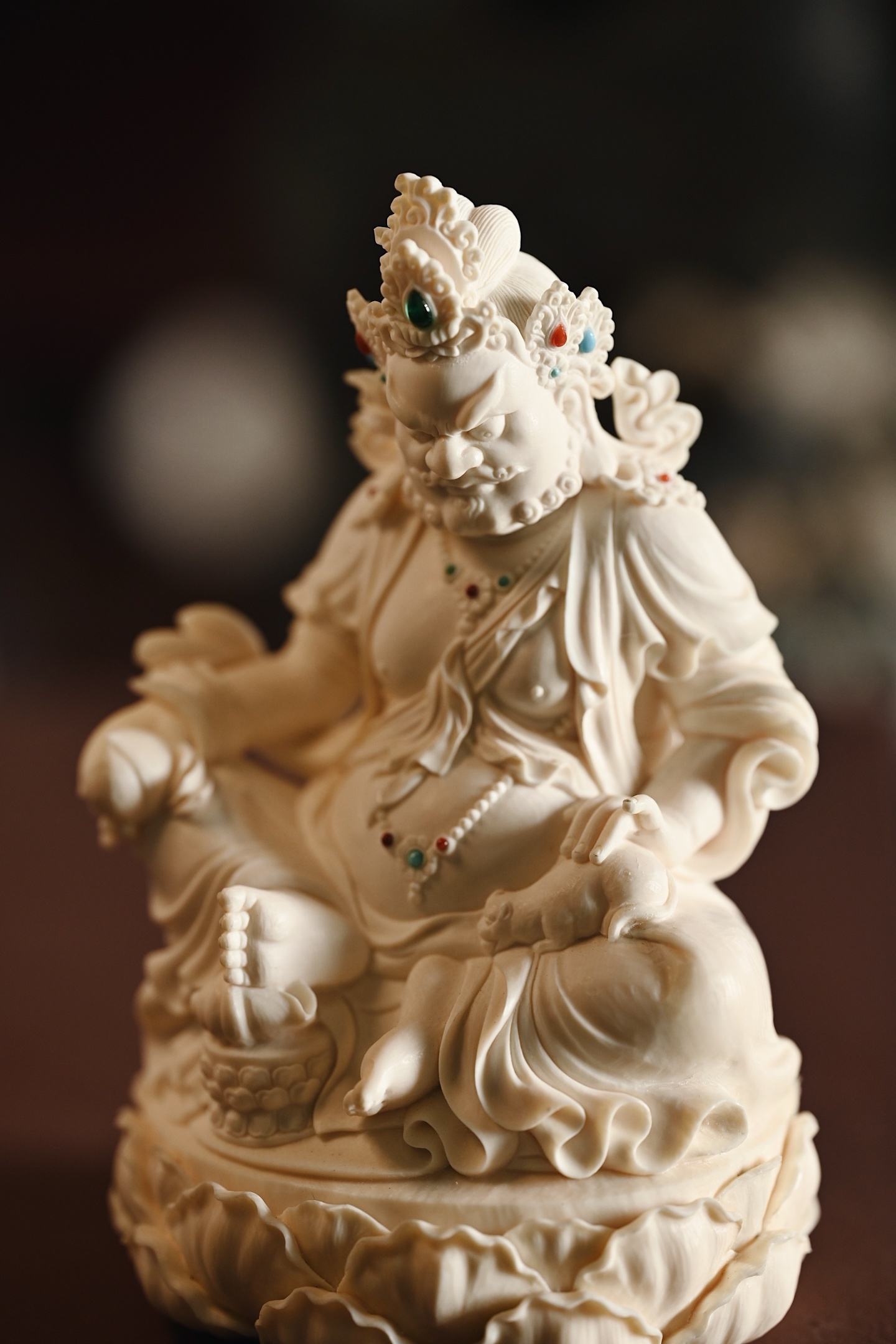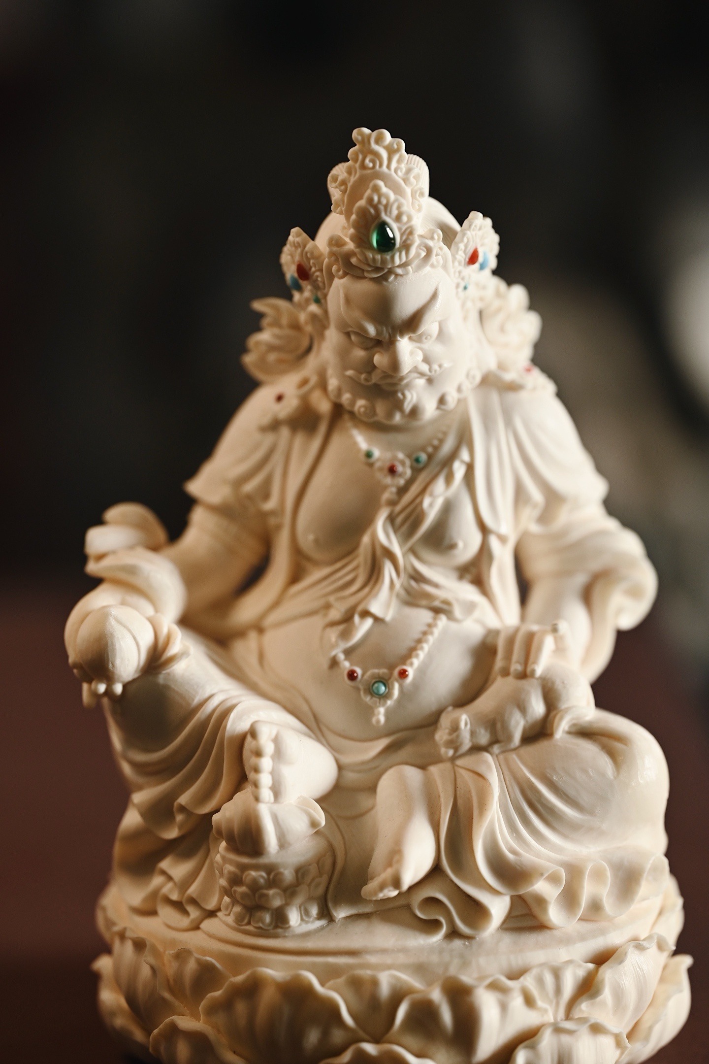 质地温润凝腻,造像面相威严忿怒,眉骨隆起,双目圆睁,虬须卷曲,身饰宝冠璎珞,衣纹流畅飘逸,左手托吐宝鼠,右手持摩尼宝,半跏趺坐于莲台之上,莲瓣饱满层叠,整器雕工精湛,细节入微,尽显威仪。