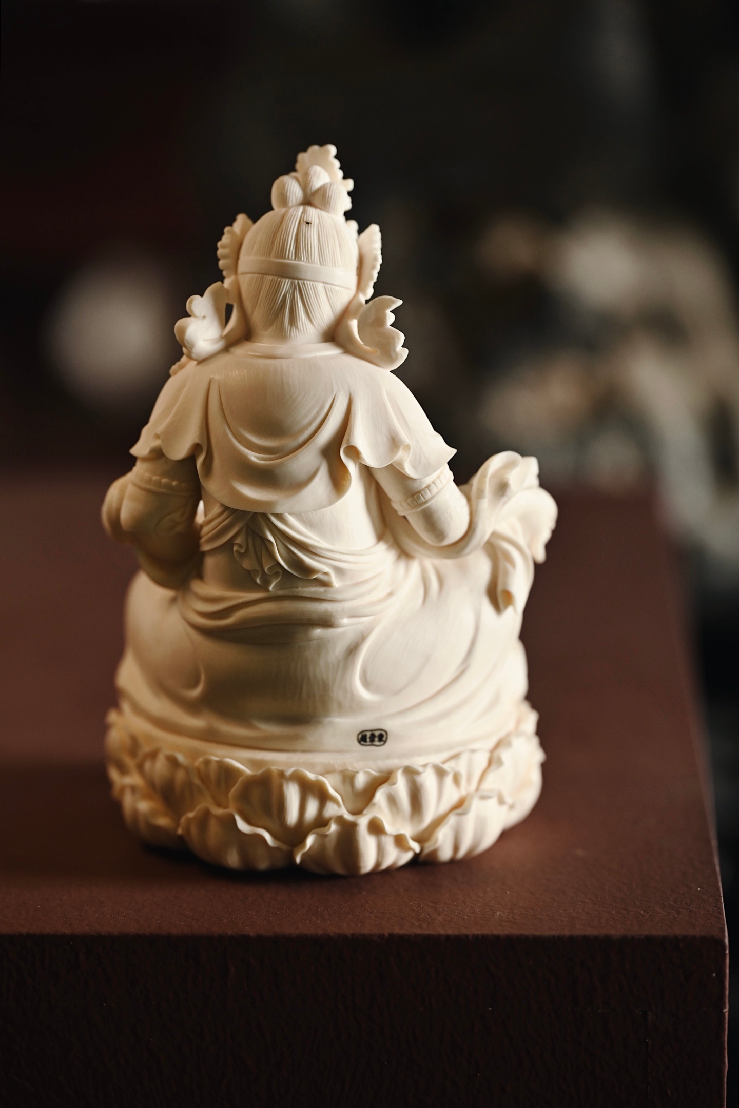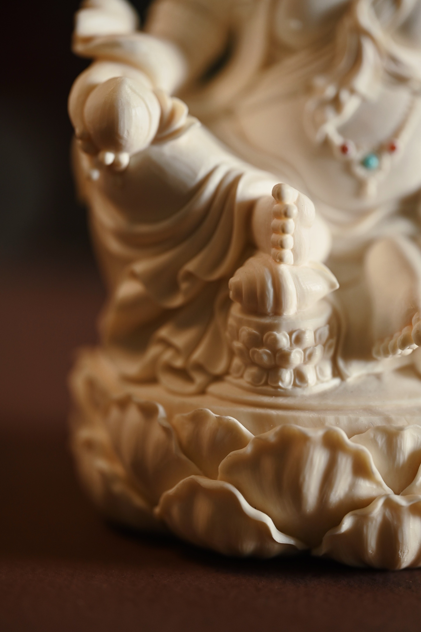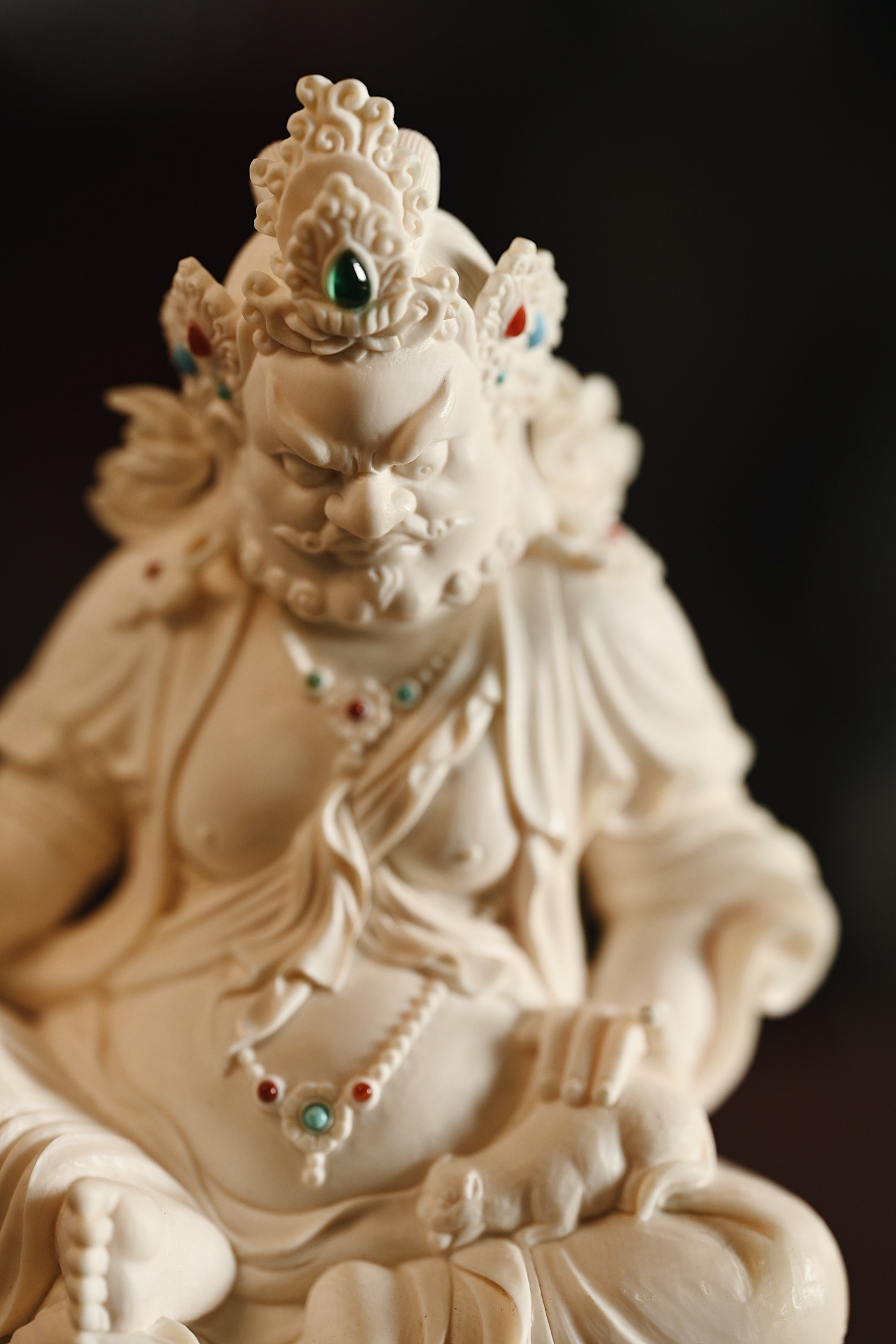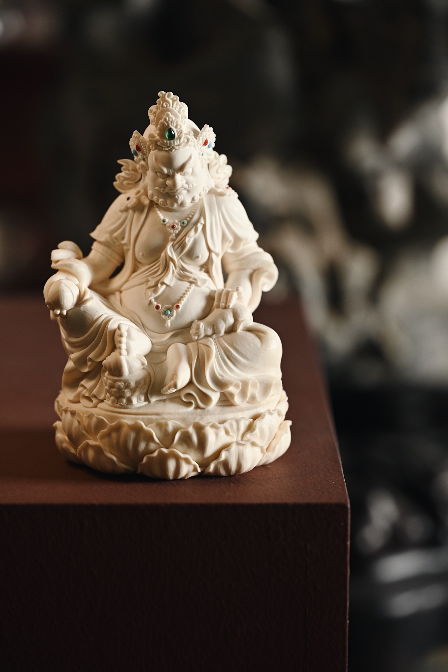 质地温润凝腻,造像面相威严忿怒,眉骨隆起,双目圆睁,虬须卷曲,身饰宝冠璎珞,衣纹流畅飘逸,左手托吐宝鼠,右手持摩尼宝,半跏趺坐于莲台之上,莲瓣饱满层叠,整器雕工精湛,细节入微,尽显威仪。