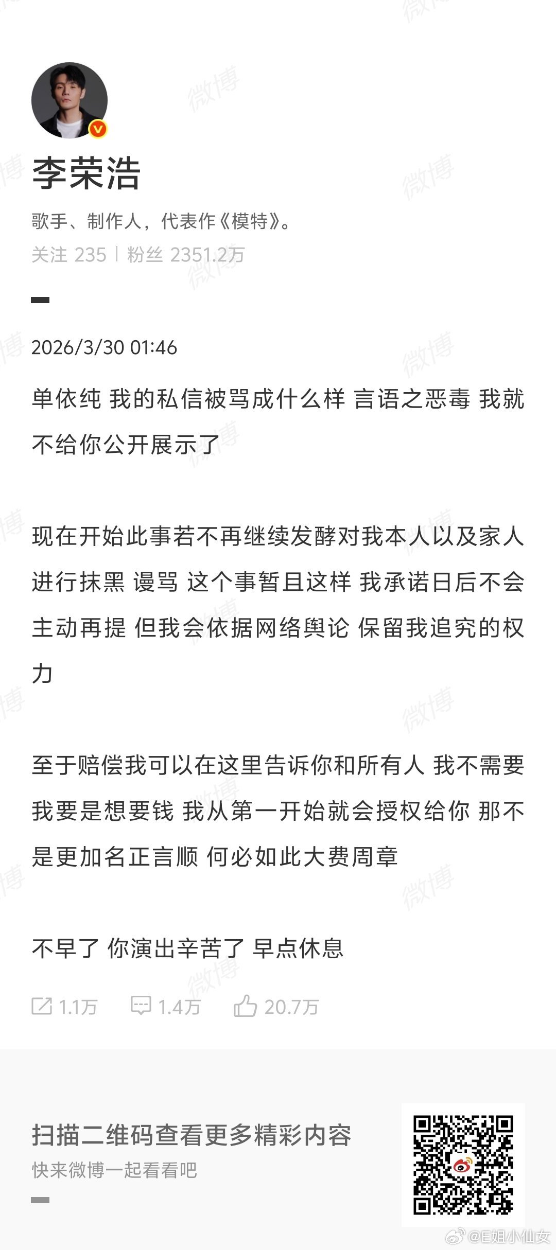 这个点继续看李荣浩和单依纯的第三轮对决事已至此我感觉李荣浩41岁了还能熬夜爆战,老人家感觉是给了个台阶,只要单的粉丝不追着他上纲上线就算over
