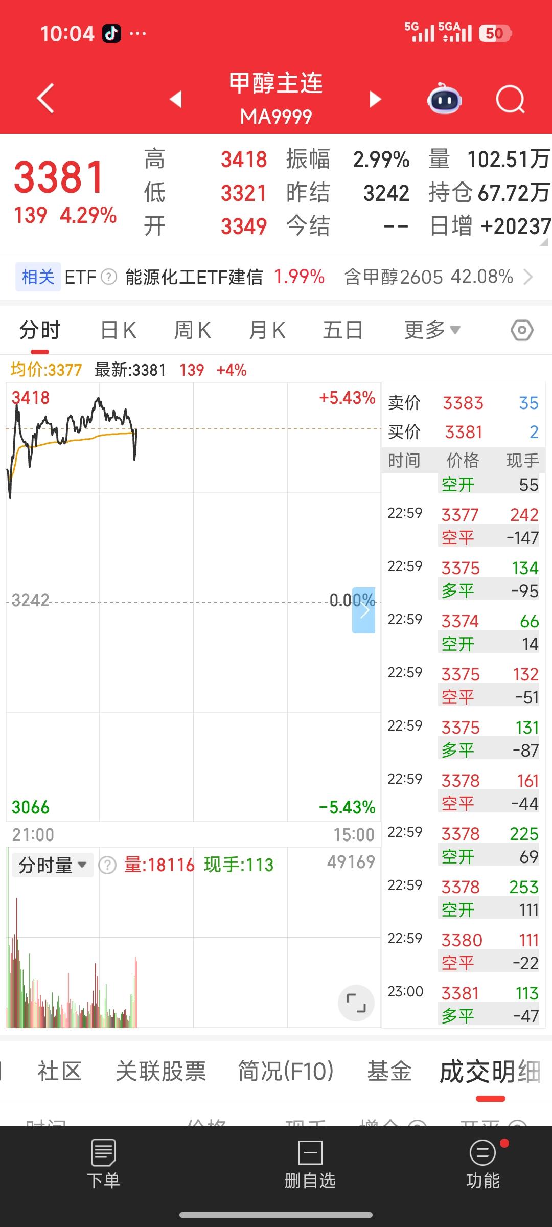 甲醇夜盘跳空新高!A股化工股今天要炸?🔥 甲醇主连MA9999昨晚直接跳空高开,最高冲至3418元/吨,单日暴涨超4%,再刷阶段新高! 这波强势行情,直接把能源化工板块的情绪拉满。高油价+化工品涨价共振,今晚夜盘的这根大阳线,明天大概率要传导到A股市场。 那些重仓甲醇概念股的朋友,今天开盘可以坐等吃肉了? 甲醇期货行情 甲醇实盘交易 尿素甲醇
