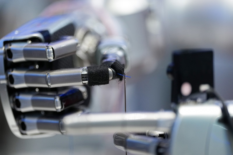 在中关村展示中心常设展上,一台配备了灵巧手的机器人在展示穿针引线。新华社图片