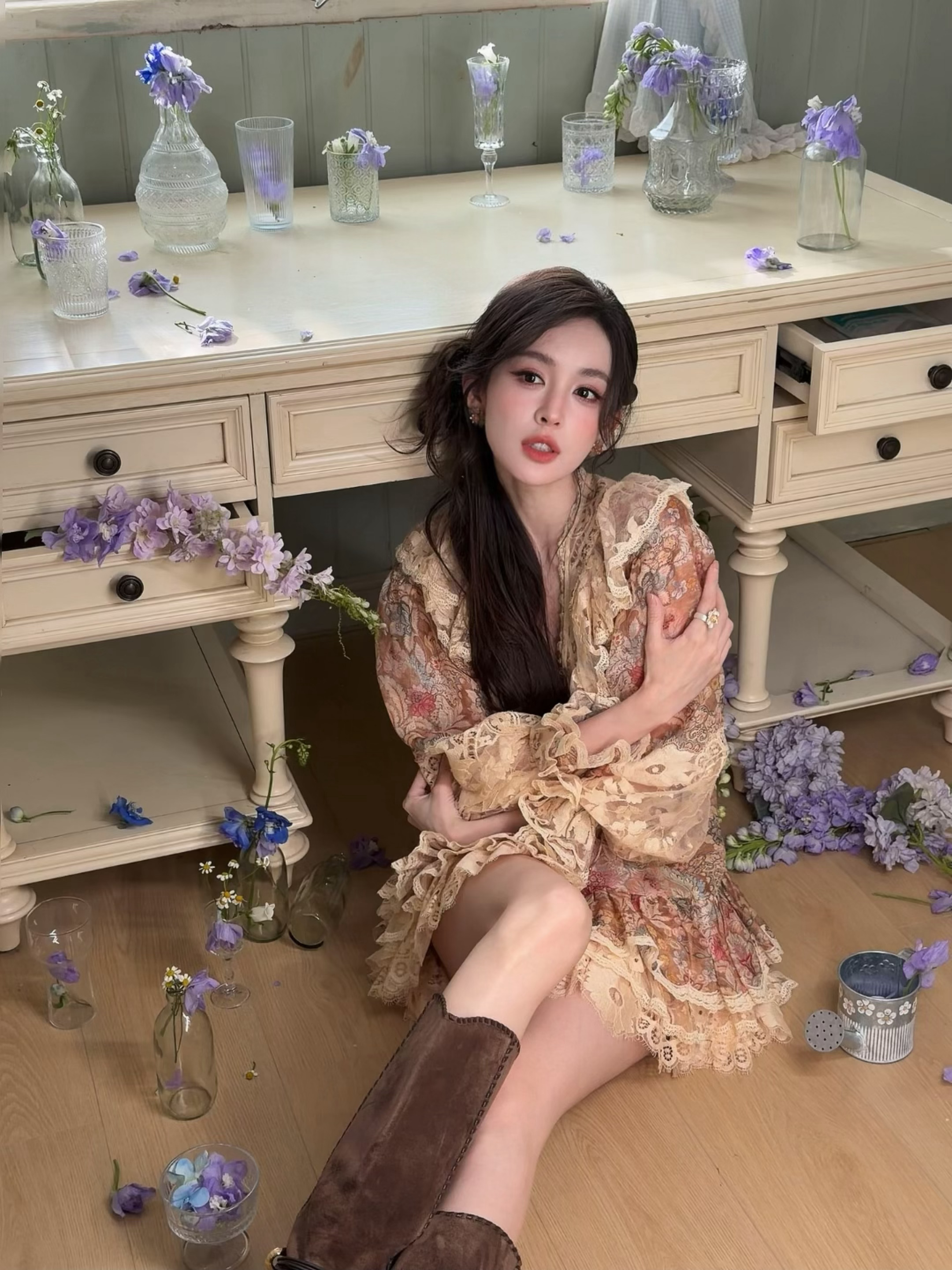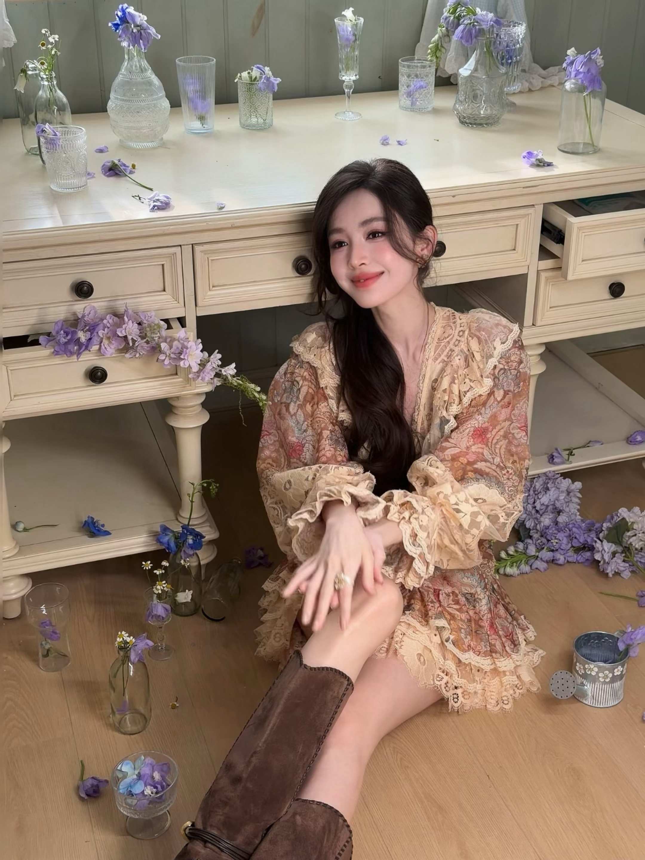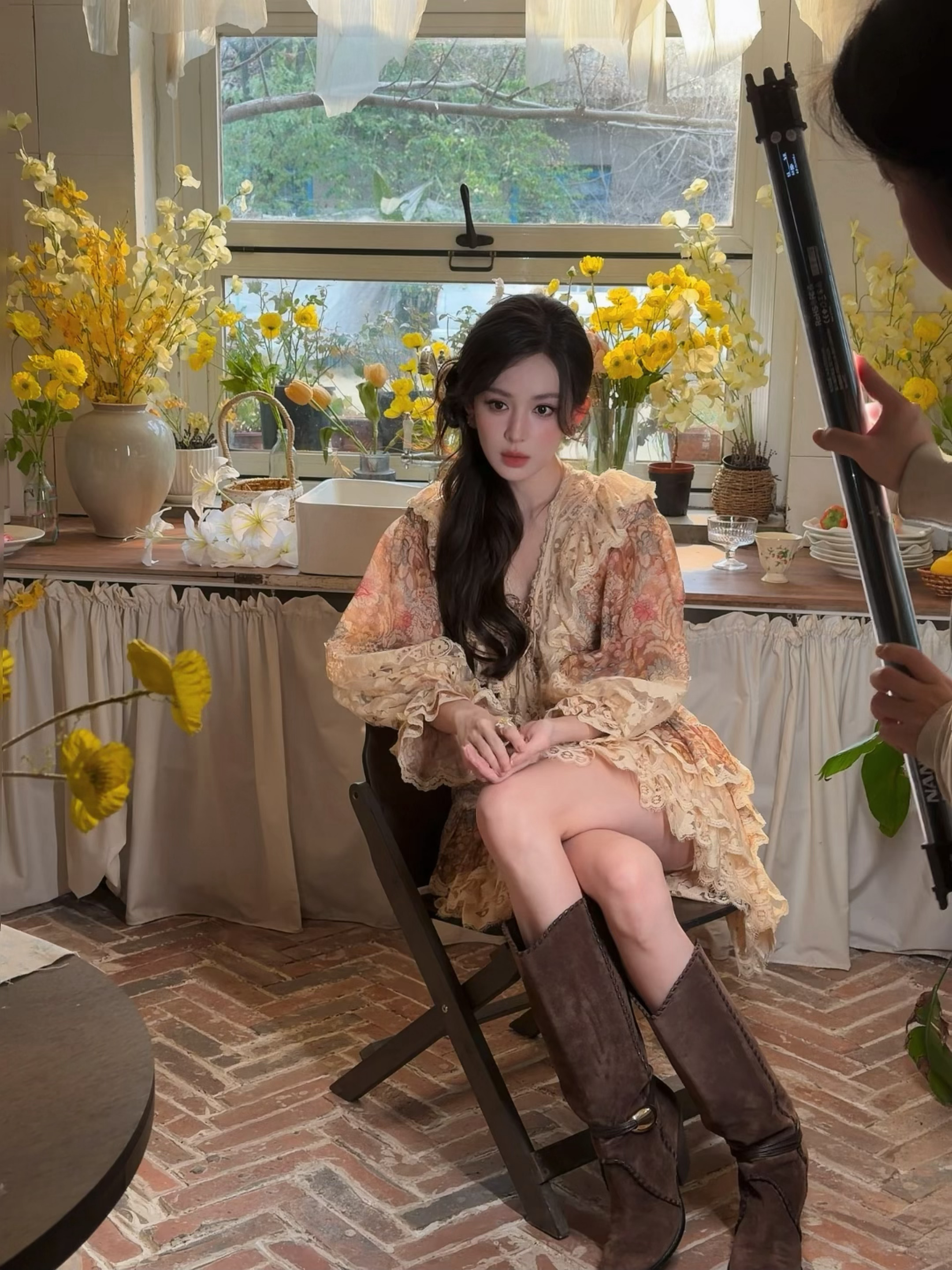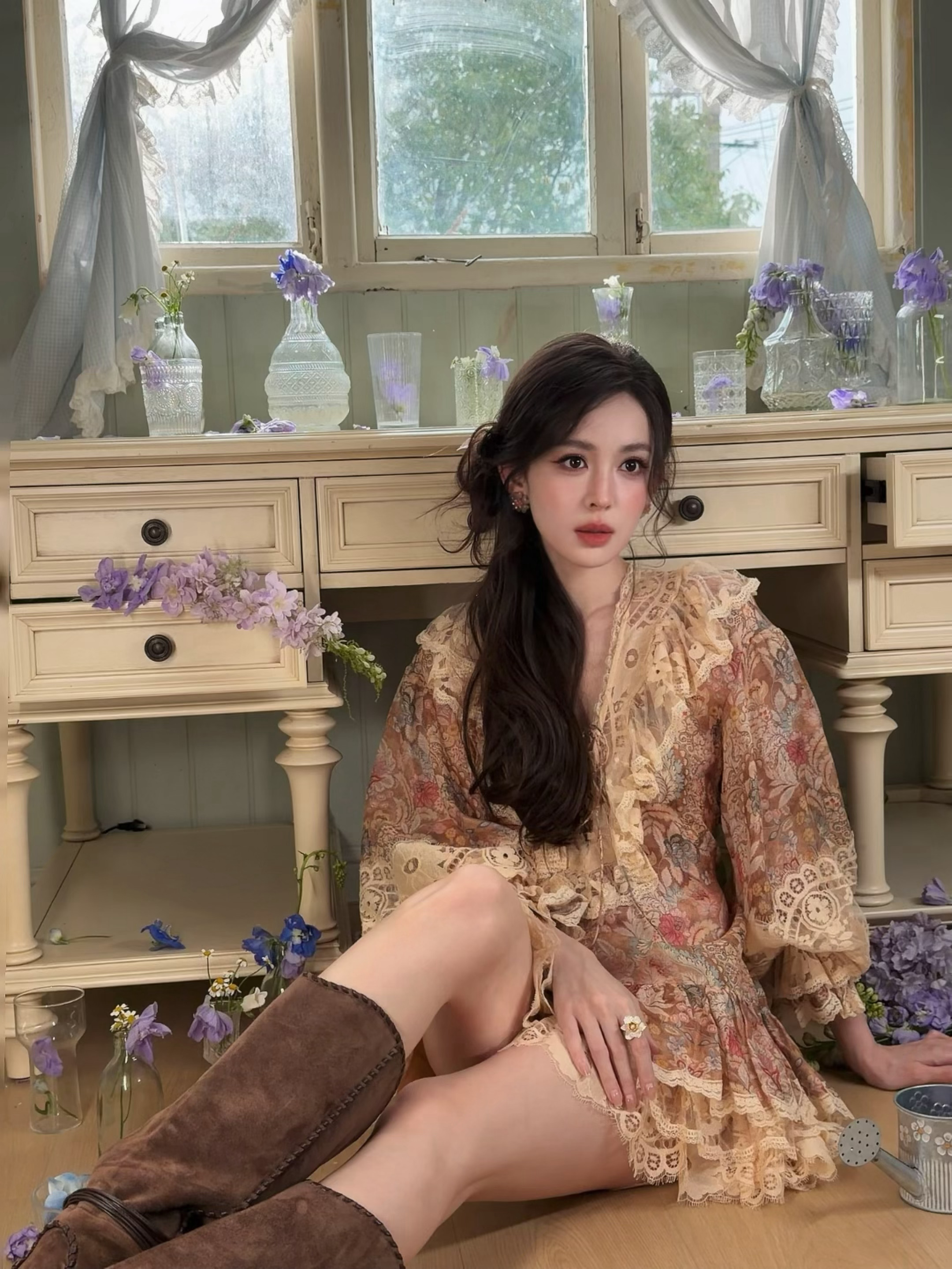 娜扎把东方明珠变成了背景板娜扎 美神娜扎蕾丝碎花短裙 大长腿棕色高跟靴
