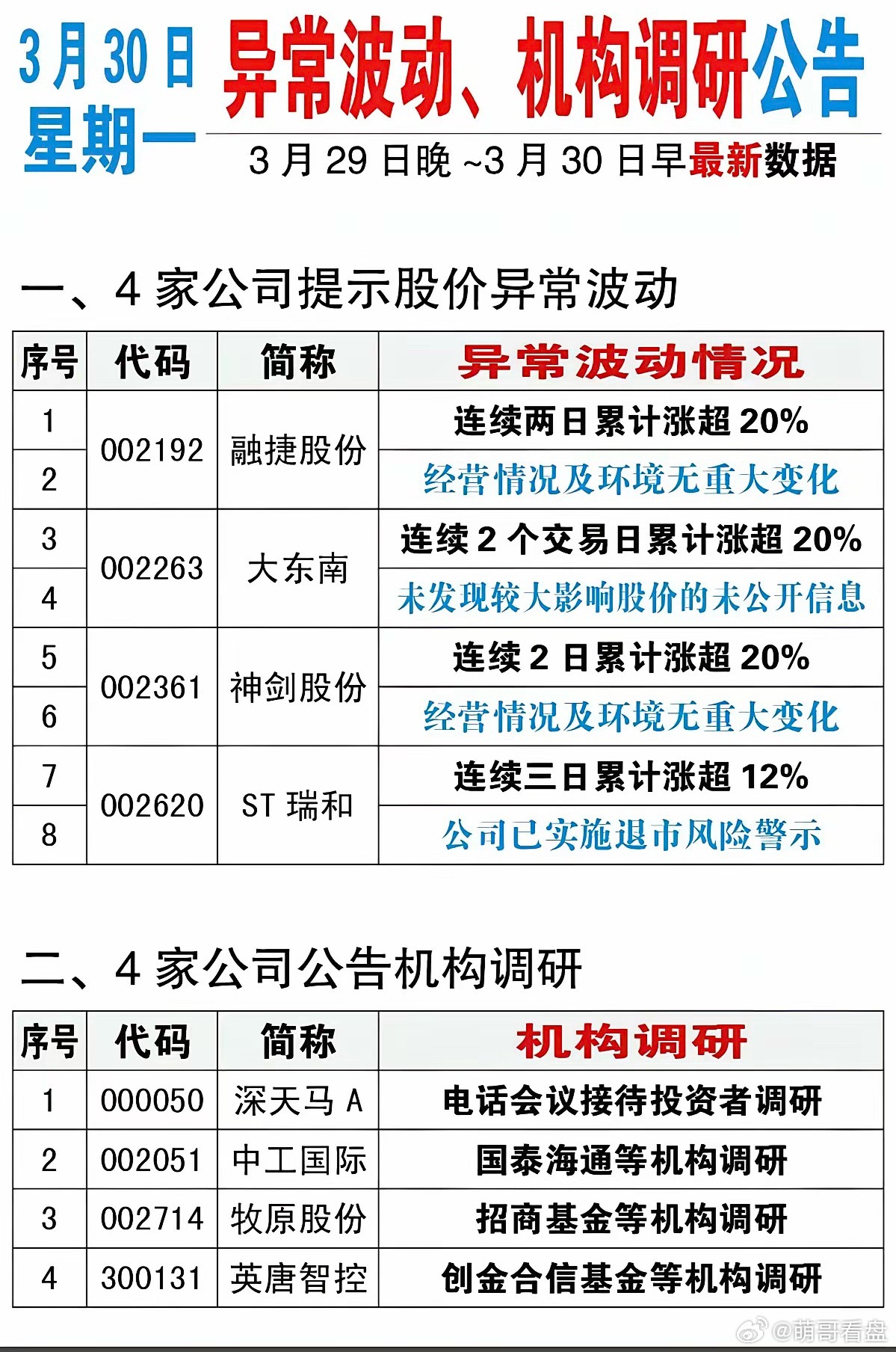 3.30周一 上市公司公告 精选汇总!主要涉及:减持、增持、回购、资产重组、实控人变更、股权转让、退市风险警示、监管问询函、股价异动、机构调研等