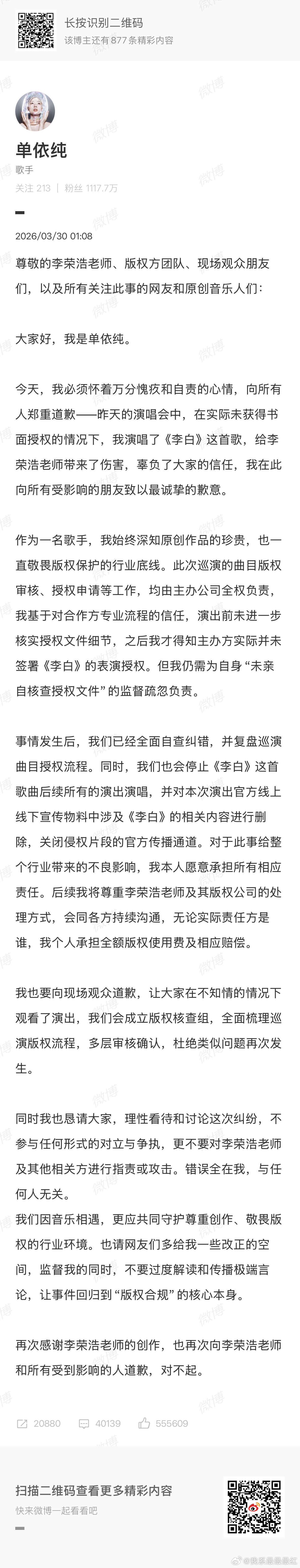 单依纯承担全额版权使用费及赔偿单依纯就演唱会未获授权演唱李荣浩《李白》公开致歉,承认自身监督疏忽,承诺停止演唱、删除相关物料、成立版权核查组并个人承担全额版权费用及赔偿。李荣浩回应说自己及家人遭恶意辱骂,若事件不再发酵将暂不追究但保留权利,同时明确拒绝赔偿,强调并非为钱。