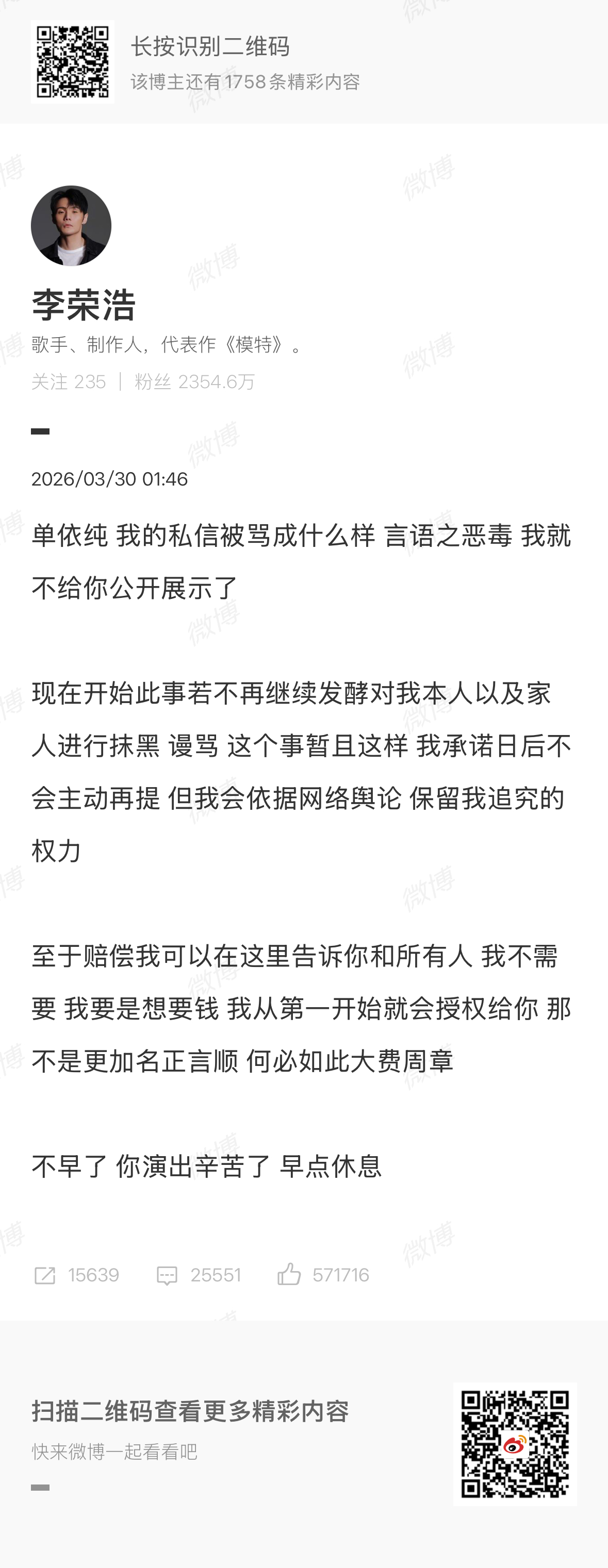 整体看了下这件事双方的处理方式,其实单依纯团队的回应也没什么毛病,但关键对面是李荣浩,条分缕析逻辑能力强,把你每一步都预判了,这两相比较,单这边的处理方式就显得人机感太重。而且看来看去,似乎她也没有想回溯源头,为自己改编《李白》惹得李荣浩不满道歉的意思。这件事的后续,我觉得单依纯这边还是要推进这场赔偿费用,李荣浩可能不想要,但她还得追着给。单依纯承担全额版权使用费及赔偿李荣浩说不需要赔偿