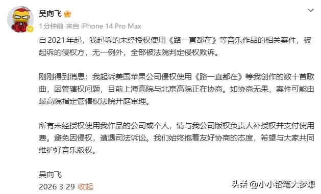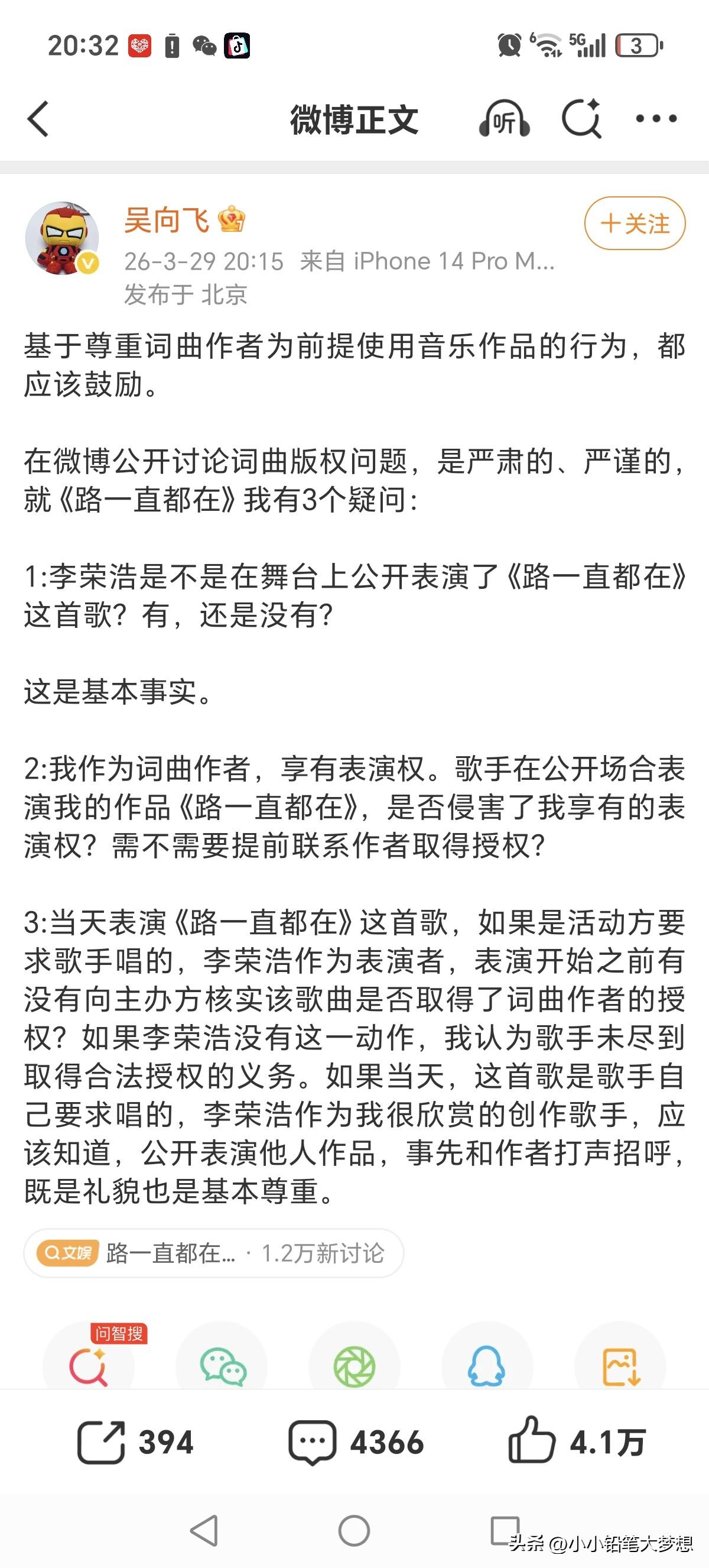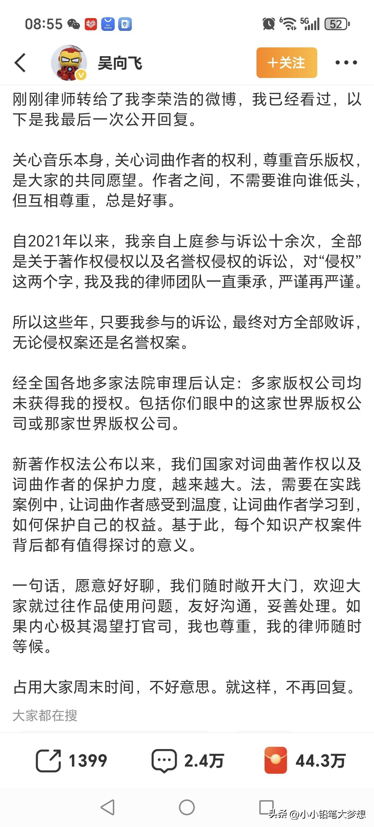 李荣浩和单依纯因为《李白》授权的事情开撕,半路杀出了一个吴向飞要李荣浩道歉,现在终于弄明白他为什么这么做了,说白了这些年他打了无数场官司,恰好在这个风口上出现了李荣浩唱过他填词的一首歌《路一直都在》,所以他揪着李荣浩不放,借着热度想要碰瓷和炒作! 李荣浩只是平时低调,但是认真起来也不好惹,李荣浩四问,他没一个答得上来,虽然写了一篇长文回复,但没有进入主题,一直在言语鬼打墙,连具体哪场说不出来? 问题是这首歌啊,他只是填词,版权所有是陈奕迅的唱片公司环球唱片,环球唱片都没说话,他还扯上了。 版权真在他手里?如果是,那直接可以晒出相关的证据。我们尊重版权,也期待环球下场跟陈奕迅还有他和李荣浩四方对峙,八只眼睛对一对看看究竟谁撒了谎! 不过看他最后一次回复,他是怂了,虽然长篇大论,但实际上没有一句正题的话,因为李荣浩的问题,他一个不答,然后全说一些他跟环球那些破事! 人家李荣浩说要打官司,法庭上见,他回复大概意思是,别告我,别打官司,但不是你先去碰的瓷吗,自己把李荣浩骂上热搜,人家要告你了,你立马就说坐下来私下解决? 事情说白了,这么多年来,他其实告不赢环球,然后出来搞事情了!