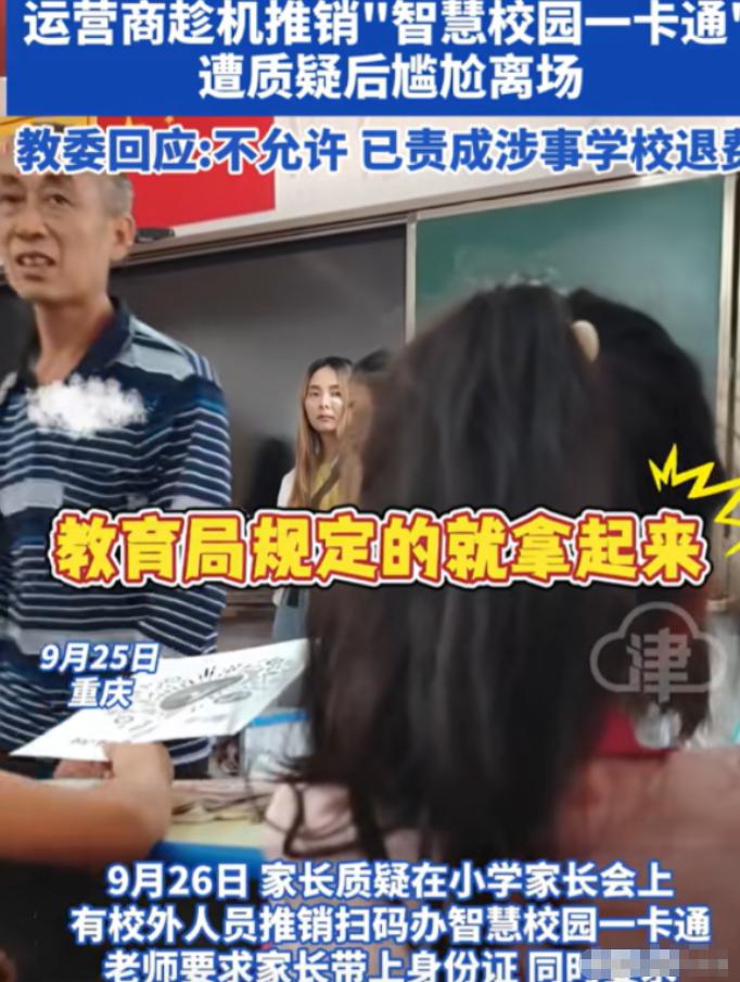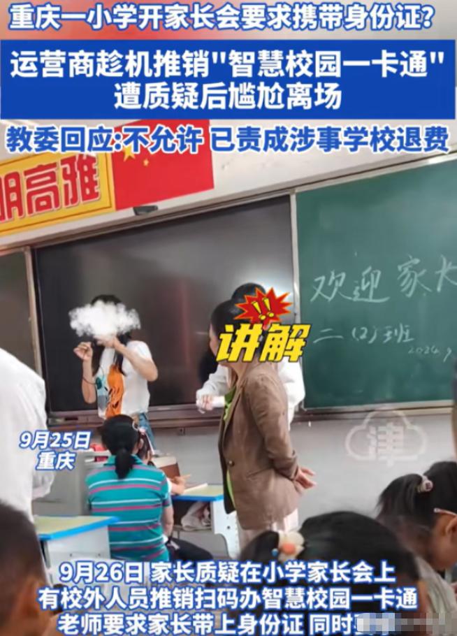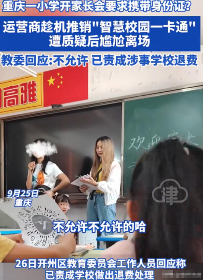 “必须严查。” 重庆,一小学开家长会,要求家长带身份证,家长进教室后,才发现还有不是老师的人在教室,甚至还要求他们开通价值 120 元一张的 “智慧校园一卡通”,没曾想这些人竟是运营商,家长直接怒了,大喊道谁规定反对一定要办?   2024年9月27日,重庆开州区教育委员会发布通报,对当地三汇口小学金山分校涉事校长及书记作出停职处理,同时责令学校和涉事运营商全额退还所有已收取的费用,全面停止校园内的相关推广活动。   这则通报的背后,是一场让所有家长愤怒不已的家长会闹剧,更是一次对教育净土的公然践踏。   此前两天,开州区教委就已介入调查,明确表态此类商业推销行为绝对不允许,并成立工作专班展开全面核查,后续还在全区范围内开展了中小学收费与校园商业活动专项排查,整改了另一所中学的类似违规问题,用坚决的行动回应了家长的质疑。   这场风波的起因,要从2024年9月24日学校发出的一则家长会通知说起。   重庆开州区三汇口小学金山分校向全体家长发出通知,明确要求每位家长务必携带本人身份证到场,并且反复强调,缺了身份证就不能进场。   对于学校的要求,家长们没有过多怀疑,大家本着对学校的信任,纷纷按要求准备妥当,准时前往学校参会。   多数家长心里都以为,携带身份证是为了办理学籍核验、学生信息登记等常规校务,没人会想到,这看似正常的要求,背后竟是一个精心设计的圈套,一场针对家长的商业推销正等着他们。   家长会当天,家长们怀揣着了解孩子在校情况、与老师沟通交流的心情进入教室,可刚落座就察觉到了不对劲。   班主任身旁站着几位穿便装的陌生人,这些人全程攥着宣传单,目光频繁落在家长手中的身份证上,神情显得十分刻意。   除此之外,还有两名身着运营商工作服的人员在场,手里拿着二维码,一看就不是学校的教职工。   家长会开场还不到十分钟,关于孩子的学习情况、班级教学安排,老师半句都没有提及,只是简单交代了几句学生校园安全事宜后,就直接请出了那几位陌生人,一场突如其来的推销就此开始。   这几名陌生人随即表明身份,他们是联通公司的工作人员,此次到场的目的,是向家长们推销一款“智慧校园一卡通”。   他们声称,这款一卡通年费120元,可实现人脸识别进校园、家长线上查看孩子动态、接打电话、门禁刷卡、接收学校通知、刷食堂和图书馆等多种功能,还暗示这款卡必须办理,并且强调家长当天带了身份证,就可以当场激活使用。   有家长当场表达了质疑,要求这些推销人员拿出教育局的官方文件,证明办理这款一卡通是官方要求,可推销人员支支吾吾,根本拿不出任何相关文件,只是反复强调办理是“自愿”的。   直到被家长追问得没办法,他们才坦白,这款一卡通是与学校“合作推广”的,还拿“统一安排”“别的学校都在办”这样的说法敷衍家长。   更让家长们愤怒的是,他们发现,校领导并没有在现场关注家长会的正常开展,反而在隔壁班级,主动协助运营商劝说其他家长办理一卡通。   散会后,运营商的工作人员也没有离开,而是在走廊里拦住落单的家长,继续进行推广,一旁的学校老师不仅不加以阻拦,还帮忙打圆场,试图让家长接受这款收费一卡通。   家长直接怒了,大喊道谁规定反对一定要办?   其实家长们愤怒的,从来都不是120元的年费,而是被套路、被欺骗的感觉,是学校对家长的不尊重,是对教育初心的背离。   学校本该是教书育人的净土,却公然为运营商提供场地和家长信息,协助其开展商业推销,把家长对学校的信任当成谋取利益的工具,这种行为实在令人不齿。   低年级学生大多由家长接送,根本用不上所谓的离校提醒等功能,这款一卡通对很多家庭来说,就是一项不必要的额外负担。   愤怒的家长们集体拒绝办理一卡通,还当场将推销人员赶出了教室。   随后,这件事在家长群里迅速发酵,家长们联名投诉,相关现场视频也被传到了网上,引发了广泛关注和热议,舆论压力瞬间给到了当地教育主管部门。   开州区教委的反应十分迅速,9月26日就作出回应,明确表示学校的这种行为完全违规,没有任何一条规定要求家长必须办理此类校园一卡通,当即责成学校和运营商停止推销、全额退费,并成立工作专班展开调查。   9月27日,调查有了初步结果,办理智慧校园一卡通是学校的自主行为,并非区教委统一要求,学校的做法违反了“严禁任何商业广告、商业活动进入中小学校园”的相关规定。   截至9月底,所有已收取的费用都已全额退还到家长手中,这场闹剧终于有了一个让家长们满意的初步结果。   这场事件让我们看到,家长们敢于维护自身权益的态度,以及教育部门守护校园纯净、严肃查处违规行为的决心,这也给所有学校敲响了警钟,教育不能商业化,校园不能变商场,任何试图把黑手伸进校园、消耗家长信任的行为,都必将受到严肃处理。
