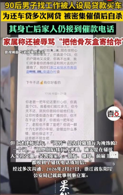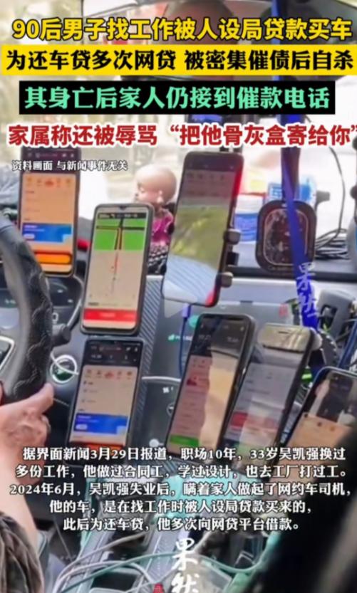 浙江东阳,33岁的男子,在母亲长眠的公墓旁,在车里结束了生命。而悲剧的开始,以为能找到月入过万的司机工作,不料,却掉进了“贷款买车”的陷阱,最终男子被无休止的催债,逼上了绝路。最让人难以接受的是,男子死后,家人还接到催收电话,被辱骂:“把他骨灰盒寄给你”。 吴凯强今年33岁,职场十年换过好几份工作,做过合同工,学过设计,也去工厂打过工,一直没找到太稳定的营生,就想着找份能多挣点钱的活,让自己的日子好过些。 2024年6月,他失业了,急着赚钱的他,在招聘平台上看到一条特别诱人的信息,说招驾驶员,月薪保底1万2,还不用自己买车,公司配车,不用交押金,不用自己承担任何费用。 对于失业的吴凯强来说,这简直就是救命稻草,他赶紧联系了招聘的人,第二天就赶到浙江东阳去面谈。 招聘的人说得天花乱坠,拍着胸脯保证,只要他愿意来,马上就能入职,每个月最少能挣1万2,多劳多得,以后日子肯定能好起来,吴凯强信了,他太想有份稳定的高薪工作了,根本没多想其中的猫腻。 面谈的第二天,招聘的人就让他带上身份证、驾驶证和银行卡,说要办理入职手续,吴凯强没犹豫,一一照做,然后就在对方的催促下,稀里糊涂签了一堆文件。 他当时根本没来得及细看文件内容,只听对方说都是入职需要的常规手续,可直到签完字,他才发现不对劲——哪里是什么公司配车,分明是让他自己贷款买车,而且车价才14万,他要还的贷款加上利息,分60期,总共要还19万多。 更过分的是,合同上的签名都不是他自己写的,预留的地址也不是他的住址,全程都是被人牵着鼻子走,他就这样稀里糊涂掉进了 “贷款买车” 的陷阱里。 招聘方承诺的月入1万2,从来就没有兑现过。签完合同后,对方就让他自己注册网约车平台,接顺风车单,根本不管他有没有客源,也没有任何保障。 更坑人的是,他贷款买的这辆车,登记的是非营运车辆,根本不能合法跑网约车,有时候跑单还会被查,收入特别不稳定。 吴凯强只能拼命跑车,每天从早开到晚,可收入还是少得可怜,一个月最多挣4101元,最少的时候只有821元,而他每个月要还的车贷就有3194.82元,根本入不敷出。 他不想逾期影响征信,也不敢告诉家人自己被骗了,怕家人担心,就偷偷在网上借网贷,拆东墙补西墙,走上了以贷养贷的路。 一年时间里,他先后借了5次网贷,年利率高达16.31%,而且网贷平台还设了陷阱,前11期只让他还少量利息,最后一期要连本带息一起还,他的债务窟窿越来越大,压力也越来越重。 他一个人在外租了个简陋的房子,连卫生间的门都没有,却还瞒着家人,说自己还在之前的林业公司上班,每天强装坚强,拼命跑车,可无论他怎么努力,都填不满债务的窟窿。 2025年10月,他实在撑不住了,贷款逾期了,催债的噩梦也随之而来。 催债的电话和短信像潮水一样涌来,不分白天黑夜,一天能打几十个,电话里全是辱骂和威胁的话。 他们不仅骚扰吴凯强本人,还给他的家人、朋友、继母,甚至前雇主打电话、发短信,曝光他的身份证号,还威胁说要找他的家人麻烦。 吴凯强特别害怕,他在留给家人的邮件里写,他不想死,但实在扛不住了,每天不停地开车挣钱,可催债的还是不停地骚扰,说要找他的家人,他真的很怕。 2025年10月19号下午,吴凯强买了农药,开着车去了松阳县——那里是他母亲长眠的公墓。他把车停在公墓旁边,在车里用喝农药和割腕的方式,结束了自己33岁的生命。 后来家人发现,他当天在浏览器上搜了80多条死亡方式,看得出来,他是真的走投无路了,才会选择这样极端的方式,陪在母亲身边。 最让人无法接受的是,吴凯强死了之后,催债的人还没有停手。他死后第五天,他的姐姐吴凯歌接到了催收电话,电话里是一个湖南口音的人,张口就骂,还嚣张地叫嚣着 “把他骨灰盒寄给你”,甚至群发他一家三口的身份证号,威胁说 “十六七岁的小年轻会做出什么事保证不了”,继续骚扰他的家人和朋友,完全无视人命,没有一点道德底线。 吴凯强死后,家人第一时间报了警,可一开始警方没有立案,说催收的人只是问能不能周转,不算直接威胁。 后来他的家人找了律师,律师说,所谓的 “周转” 就是掩饰,本质就是骚扰,经过多次沟通,2026 年2月27日,浙江省东阳市公安局终于就这件事刑事立案了。 其实这种以高薪招聘诱骗司机贷款买车的骗局,不止吴凯强这一起,四川就有67个人被骗了230 多万,主犯已经被判刑了,可吴凯强的命,再也回不来了。 他的家人现在每天都活在痛苦里,想起他生前的难处,想起催收的辱骂,心里就像被扎一样疼,而那些骗人的人和催债的人,终究要为自己的行为付出代价。