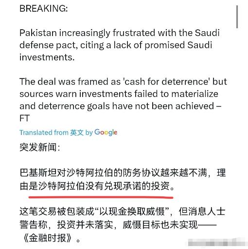 没想到,局面会发展到这一地步,巴基斯坦对沙特不满了!3月29日,外媒报道称,巴基斯坦对沙特的防务协议越来越失望,理由是沙特没有承诺投资。外媒称,这笔交易的框架是“现金换威慑”,但如今巴基斯坦期待的投资没有到位,而沙特想要实现威慑的目标也没有实现。 去年9月,巴沙两国签署共同战略防御协议。没想到协议刚生效,中东就出了这么大的事情。伊朗攻击沙特,按理说巴基斯坦有出兵保护沙特的义务,但是巴基斯坦明显有自己的顾虑。一方面,钱没有到位不说。更重要的是,巴基斯坦与伊朗是邻国,而巴基斯坦的背后还有印度。如果巴基斯坦加入战局,那真可谓是牵一发而动全身。 巴基斯坦的犹豫并非没有现实依据。这份2025年9月签署的共同战略防御协议,核心条款明确只有沙特遭遇全面入侵、政权面临生死威胁时,巴基斯坦才需履行军事介入义务。 伊朗3月27日对沙特苏丹王子空军基地的打击,虽发射6枚弹道导弹与29架无人机造成美军装备重大损失,却并未涉及占领沙特领土或颠覆其政权的意图,严格来说并未触发协议的启动红线。 沙特承诺的投资迟迟未能落地,成为加剧巴基斯坦不满的关键因素。英国《金融时报》援引巴基斯坦消息人士的说法,双方原本约定的“现金换威慑”模式已陷入停滞。沙特此前计划向巴基斯坦投资的100亿美元炼油厂等大型项目,如今均处于搁置状态。 这一局面的出现并非沙特刻意违约,而是其自身正遭遇严峻的财政困境。自2月底伊朗实际封锁霍尔木兹海峡后,沙特原油出口量从2月的日均710.8万桶骤降至3月的435.5万桶,大量原油滞留波斯湾无法运出,石油收入的锐减让沙特难以兼顾对外投资与自身防务开支。 更让巴基斯坦顾虑重重的是周边复杂的安全环境。3月中旬,印度与巴基斯坦在克什米尔“控制线”爆发近十年来最激烈的军事冲突,双方动用无人机、火箭弹等装备相互打击,造成至少47人死亡、数万名居民撤离。 巴基斯坦的军事力量本就主要聚焦于对印防御,若抽调主力部队驰援沙特,无疑会削弱本土防卫能力,给印度可乘之机。 巴基斯坦与伊朗长达900公里的边境线,也让其在沙伊冲突中不敢轻易站队。2026年3月15日,巴基斯坦刚刚终止与伊朗的长期边境免签政策,要求所有跨境人员必须携带护照和签证,这一政策调整本就是为了强化边境安全管控。 伊朗作为巴基斯坦的重要邻国,双方在宗教和民生领域存在诸多交集,保持边境稳定对巴基斯坦而言至关重要。贸然介入沙特与伊朗的冲突,可能引发边境局势动荡,让巴基斯坦陷入腹背受敌的困境。 事实上,巴基斯坦已选择以调停者身份参与中东事务。巴基斯坦总理夏巴兹·谢里夫公开表态愿主持美伊会谈,陆军参谋长阿西姆·穆尼尔也与相关各方保持沟通,通过秘密渠道传递信息。这种选择既符合巴基斯坦的战略利益,也反映出其在现实压力下的理性权衡。 巴沙防务协议的尴尬现状,本质上是地区局势变化与双方利益诉求错位的结果。沙特原本希望借助巴基斯坦的军事威慑提升安全保障,却因自身财政困境无法兑现投资承诺。 巴基斯坦期待通过协议获得经济支持,却面临着不能兼顾多线安全的现实制约。伊朗的精准打击则直接暴露了协议威慑力的局限性,连部署在沙特的美军都未能有效拦截袭击,让外界看清单一防务协议难以解决复杂的地区冲突。 随着中东局势持续升级,巴基斯坦与沙特的关系将面临更多考验。巴基斯坦的不满情绪短期内难以消解,沙特的财政压力也并非一朝一夕能够缓解。双方若不能及时调整合作模式,这份曾经被寄予厚望的防御协议,可能会逐渐失去实际意义。 而巴基斯坦在调停中东冲突与应对印度威胁之间的平衡术,也将深刻影响其地区地位与自身安全环境。在这场多方博弈的棋局中,没有绝对的赢家,唯有务实的妥协与理性的沟通,才能避免局势进一步恶化。