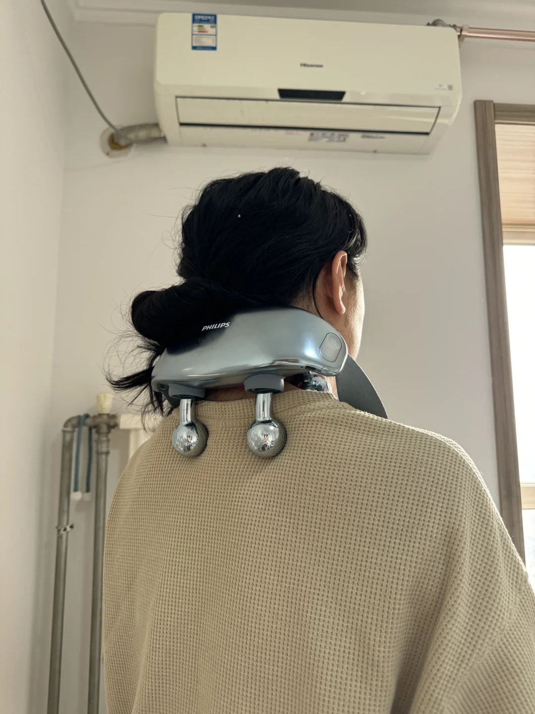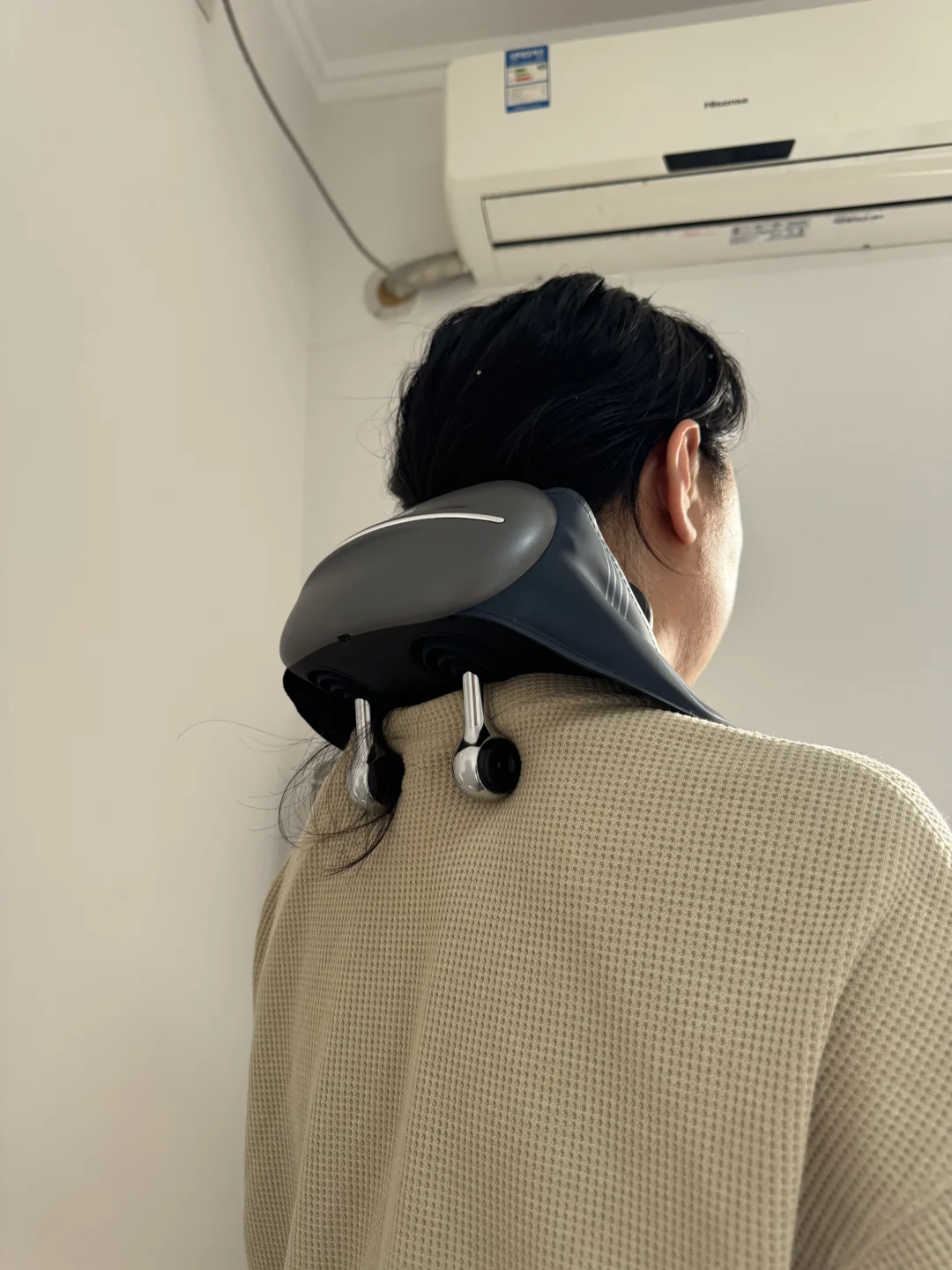 这个按摩头是金属的,表面有点弧度刚好卡住肩膀,按摩力度很足,感觉把肩膀上的肉都提起来了,比较吃劲应该懂我说的这种爽感。和Pro一样按摩头和后颈都能发热,金属头的导热也快,一戴脖子上就热乎了。