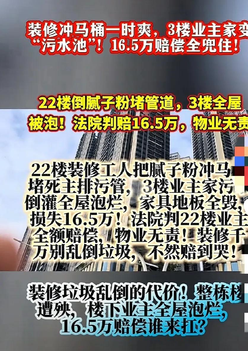装修通病,匠心不在, 损人不利己!工人素质缺失,道德缺失,户主疏忽,物业监管缺失,这才造成重大损失!因此,我认为,即使工人“图省事”,业主仍需为雇佣行为负责。 另外,若物业能证明已履行合同约定的维护义务并提前警示禁止行为,可减轻责任。 总之,遭遇类似情况,应立即拍照录像、保留证据、报警或联系物业,协商无果,必须通过司法途径索赔。