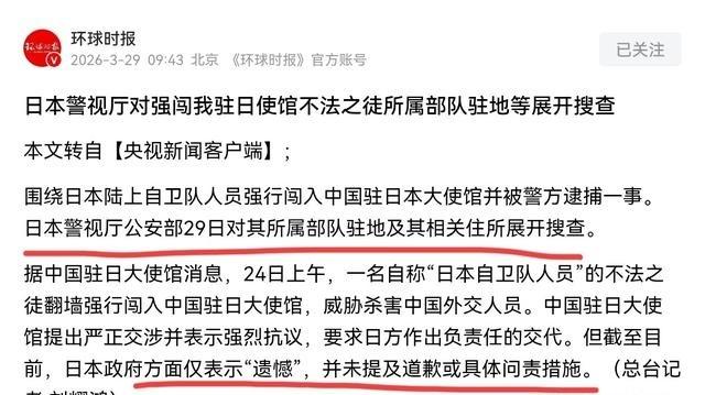 日本有进一步动作了!3月29日,根据国内媒体报道,尽管日本至今没有任何道歉,仅对我们表示遗憾,但是日本警视厅对强闯我驻日使馆一事仍在进行调查。日前,日本警察厅已经对该不法之徒所属部队驻地等展开搜查。很显然,日本警方就是要通过进一步的取证,给该事件做出一个定性。 3月23日中午,村田晃大从虾野驻屯地出发。他乘坐高速巴士到福冈博多站,再转新干线北上到达东京。抵达东京后,他在东京站附近的商店买了一把刃长约18厘米的刀具,当晚选择一家网吧过夜。第二天清晨,他离开网吧,先在附近区域活动,然后前往位于港区元麻布的中国驻日大使馆。 上午大约8点左右,村田晃大出现在使馆周边。他在附近观察环境大约一个小时,寻找进入的路径。大约9点,他通过与使馆相邻建筑的四楼翻越带有铁丝网的围墙进入使馆院内。翻墙时他的双手被刺网划伤,留下两三道伤口。进入后,使馆工作人员发现他,将他控制并制服。 村田晃大被控制后,承认行为非法,并提到想与大使见面,表达希望中方在对外言论上保持克制的意见。他还提到如果意见不被接受,打算用刀自决来引起注意。使馆人员在现场通知东京警视厅麻布警察署,警方下午1点左右赶到,将他带走。警方在使馆绿化带发现那把刀具。 整个过程没有造成人员伤亡。中国驻日使馆立即提出严正交涉并表示强烈抗议,要求日方负责任交代。3月24日晚,东京警视厅以涉嫌非法侵入建筑物罪将村田晃大逮捕。26日,他被移送检察机关。日本政府和防卫省表达遗憾,表示会加强使馆周边安保,自卫队承诺配合调查。 3月29日,日本警视厅公安部人员前往虾野驻屯地及其相关住所,进行入室搜查,行动持续约一个半小时。他们收集文件、物品和相关资料,目的是进一步查明事件动机和背景情况。搜查对象包括村田所属部队驻地和他的住所,这一步行动被视为日方在取证上的进一步举措。 从时间线看,村田从驻地请假离开到事件发生,中间间隔一天多。他在东京的活动包括购买刀具和网吧过夜,这些细节后来被警方调查确认。使馆方面强调事件违反维也纳外交关系公约,威胁外交人员和馆舍安全。中方多次敦促日方彻查并严惩,给出负责任交代。 搜查行动结束后,警方对获取的物品和信息进行分析,以确定事件的定性。目前日本方面停留在表达遗憾的层面,没有正式道歉,也没有展开广泛内部追责。高市早苗政府面对国内部分舆论压力,要求严肃处理以稳定外交。但公开表态显示,当局倾向于把此事视为单一人员行为,而非系统管理问题,以减少对自卫队整体的冲击。 中日关系的发展与日方最终定性和处置直接相关。如果处理只停在表面,双方关系可能继续承受压力。事件发生后,日本警方加强对使馆周边的警戒,但更深层管理问题需要实际措施应对。虾野驻屯地的搜查显示取证在进行,但是否延伸到更广范围的内部审查,还需要继续观察。 类似事件放在中日关系背景下,容易放大双方关切。中方多次指出事件性质恶劣,要求日方从根本上防止再次发生。日本国内也有声音关注此事对双边关系的影响。一些分析提到,如果定性为个人极端行为,处理空间相对较大;如果涉及更广范围的思想或管理问题,则可能带来不同后果。